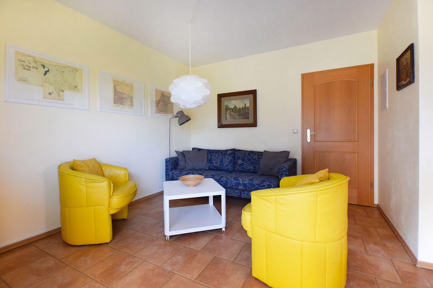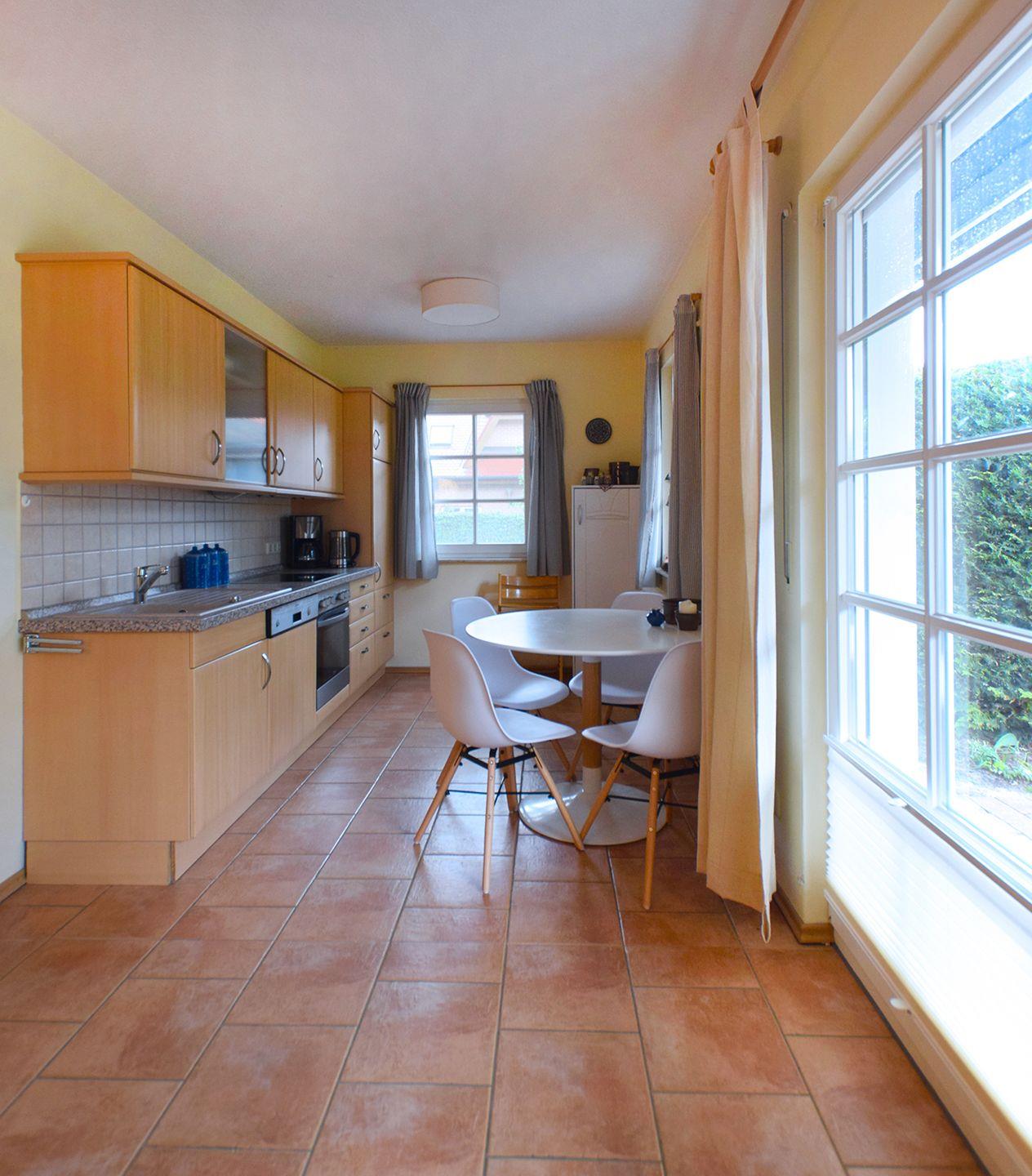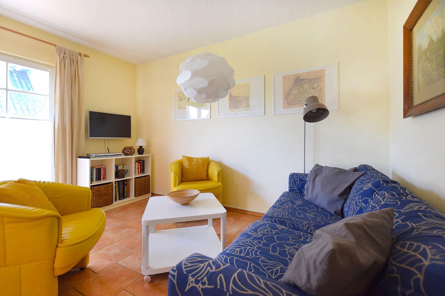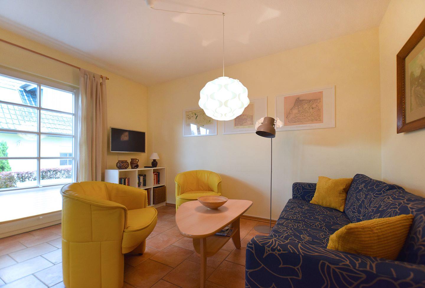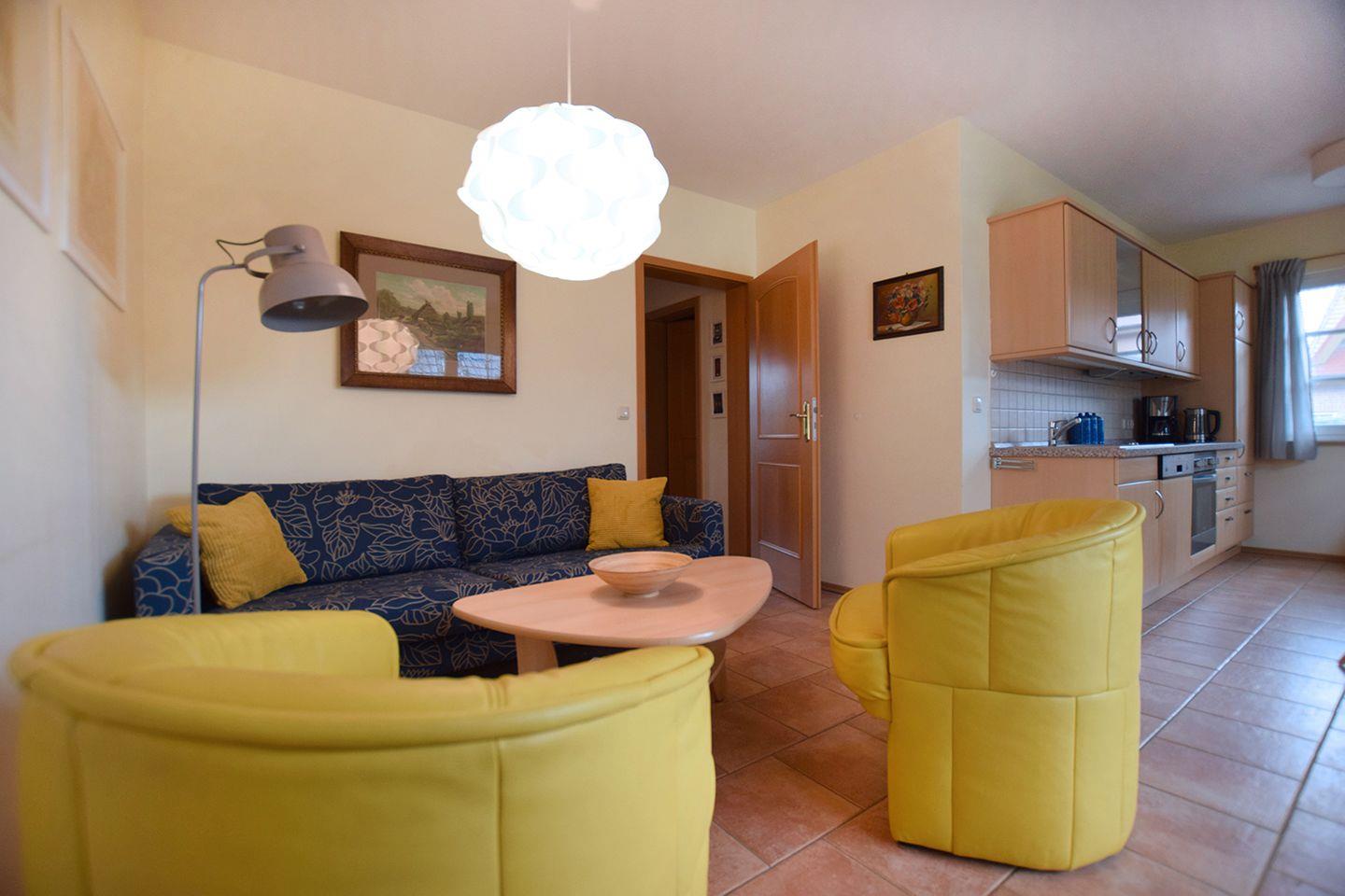 Die gemütliche Ferienwohnung für bis zu 4 Personen bietet auf ca. 52 m² Wohnfläche alles, was Sie für einen entspannten Urlaub benötigen. Im Erdgeschoss befinden sich der helle Wohnbereich, eine gut ausgestattete Küchenzeile, das Bad sowie zwei Schlafzimmer. Der Wohnbereich ist mit einer komfortablen Sitzgarnitur und zwei Sesseln ausgestattet, ideal für gemütliche Stunden vor dem SAT-TV oder Radio. Der Esstisch mit 4 Stühlen lädt zu gemeinsamen Mahlzeiten ein. Die Küchenzeile ist mit einem 4-Platten-Ceran-Kochfeld, Backofen, Geschirrspüler, Kaffeemaschine, Toaster, Wasserkocher und einem Kühlschrank mit Gefrierfach gut ausgestattet, sodass Sie sich ganz nach Belieben selbst versorgen können. Das Bad verfügt über eine Dusche und WC.
