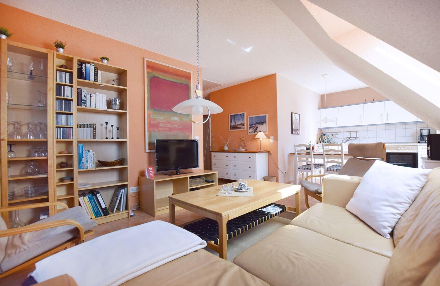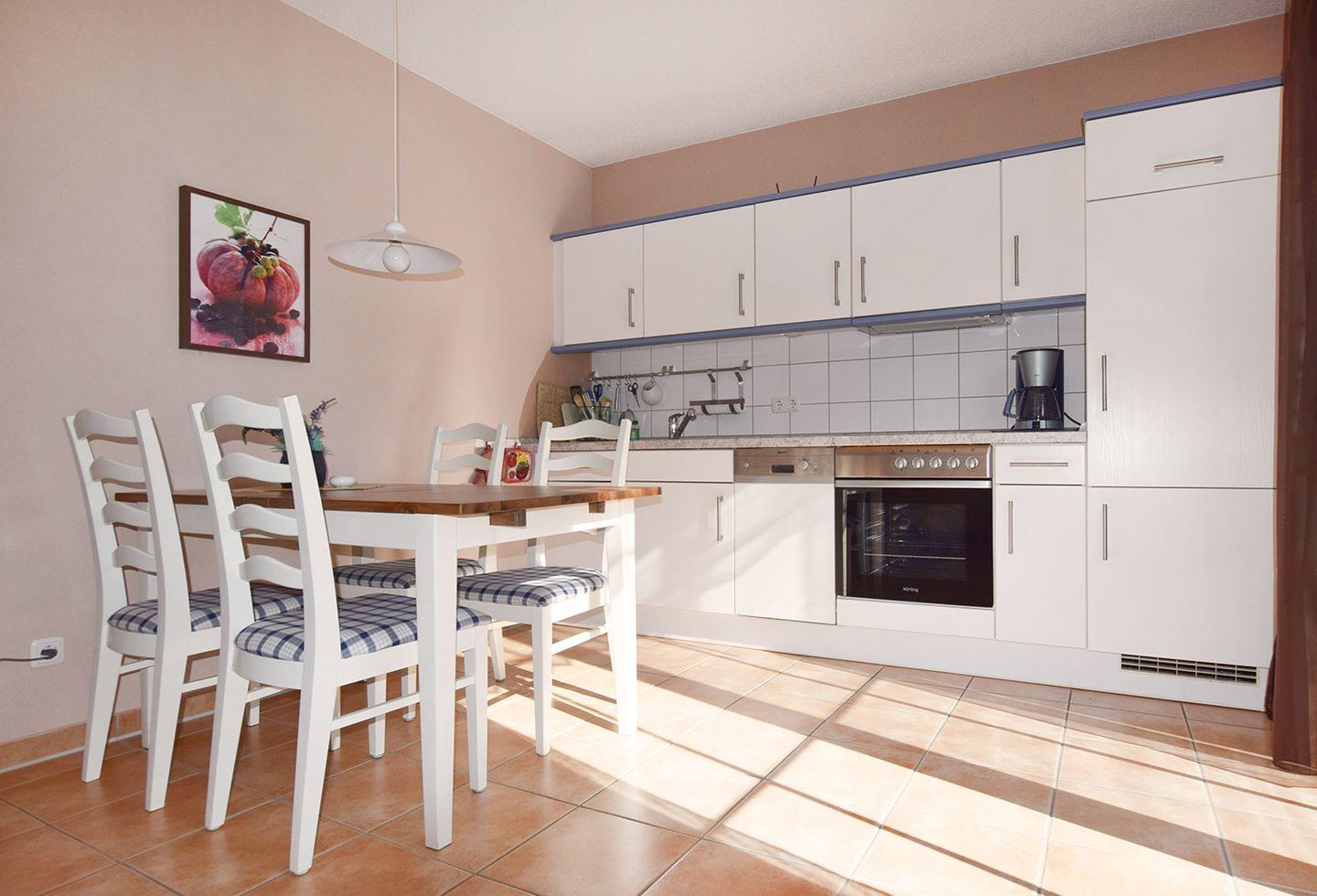Die gemütliche Ferienwohnung für bis zu 2 Personen bietet auf ca. 52 m² Wohnfläche alles für einen entspannten Aufenthalt. Im Obergeschoss erwartet Sie ein großzügiger Wohn-/Essbereich, ausgestattet mit einer bequemen Couchgarnitur, einem Esstisch, Radio mit CD-Player und SAT-TV. Die angrenzende Küchenzeile ist bestens ausgestattet mit einem Backofen, Geschirrspüler, Herd mit Cerankochfeld, Kaffeemaschine, Kühlschrank mit Gefrierfach, Toaster und Wasserkocher – hier können Sie sich nach Belieben selbst versorgen. Das Badezimmer ist mit einer Dusche, einem WC und einer Waschmaschine ausgestattet.