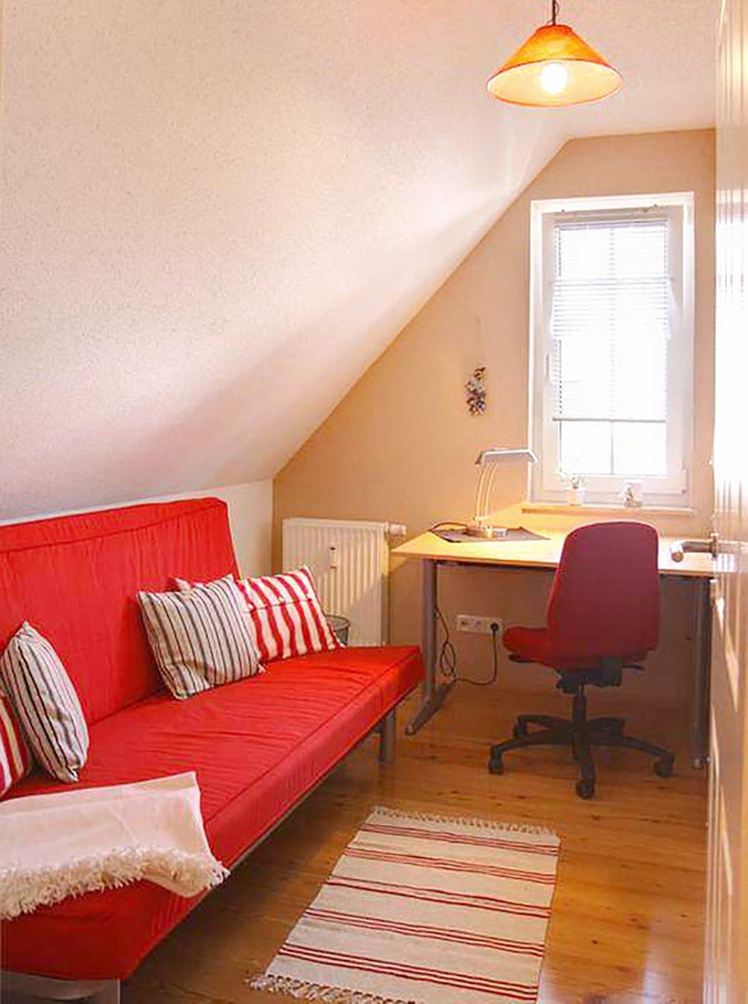Für einen erholsamen Schlaf sorgt das Schlafzimmer mit einem komfortablen Doppelbett (180 x 200 cm) und einem Kleiderschrank für Ihre Kleidung. Zusätzlich bietet die Ferienwohnung ein Arbeitszimmer mit einem Sofa und einem Schreibtisch – ideal für kleine Aufgaben oder zum Entspannen.