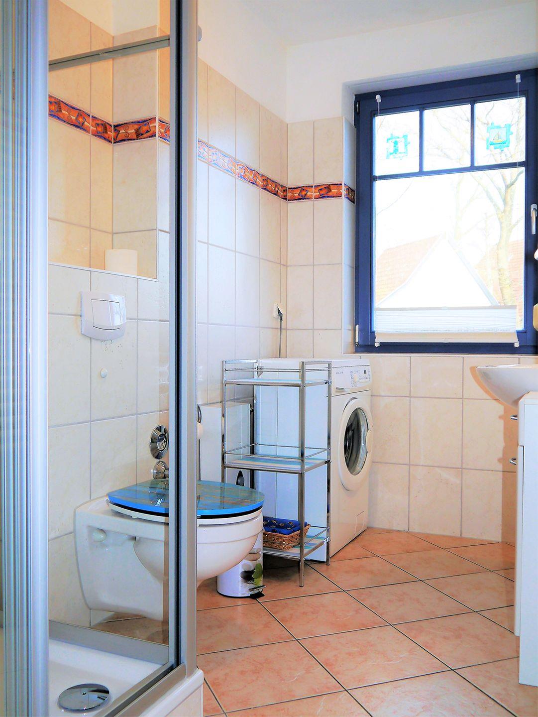 Das Bad verfügt über eine Dusche, ein WC und eine Waschmaschine.