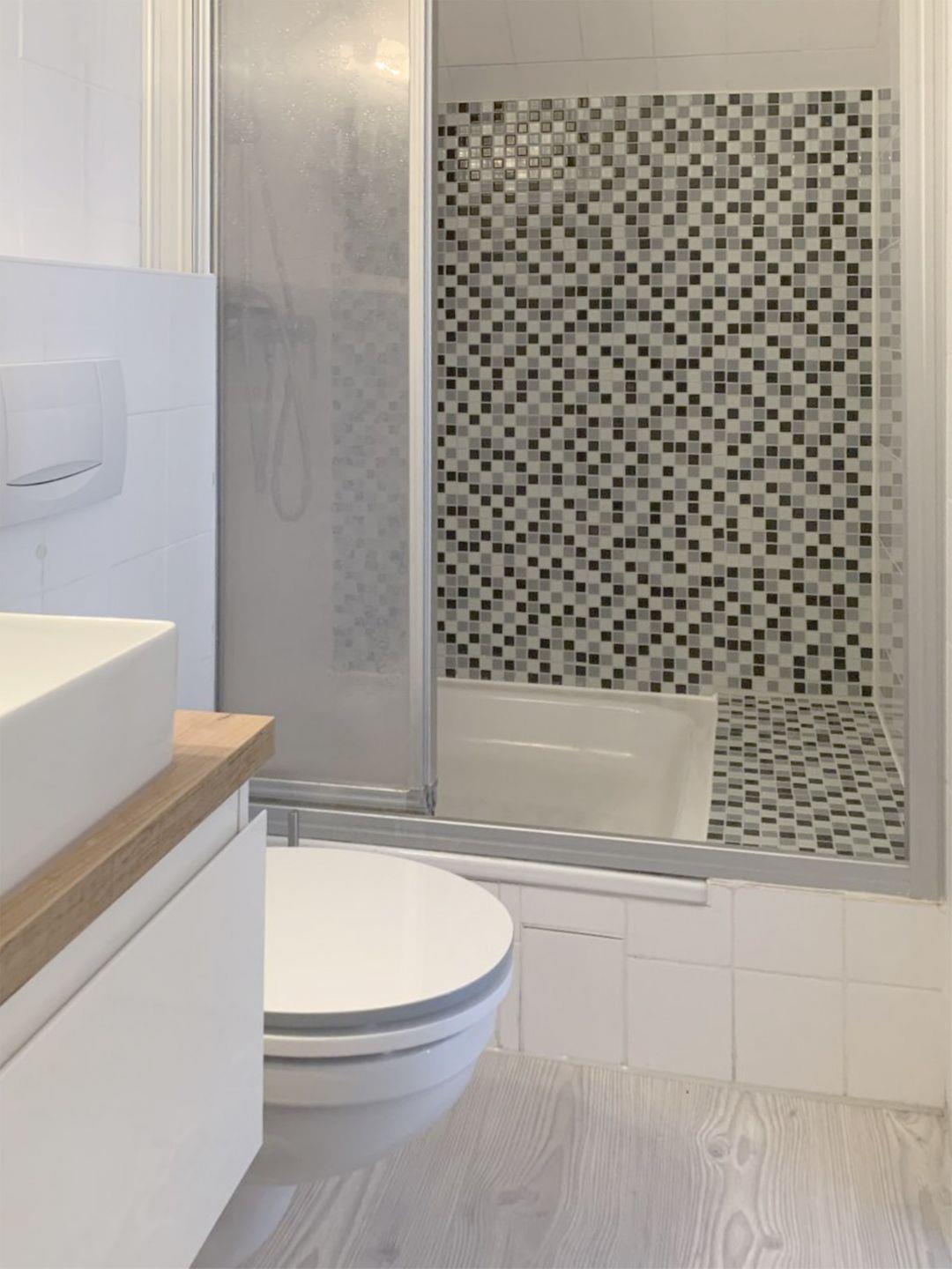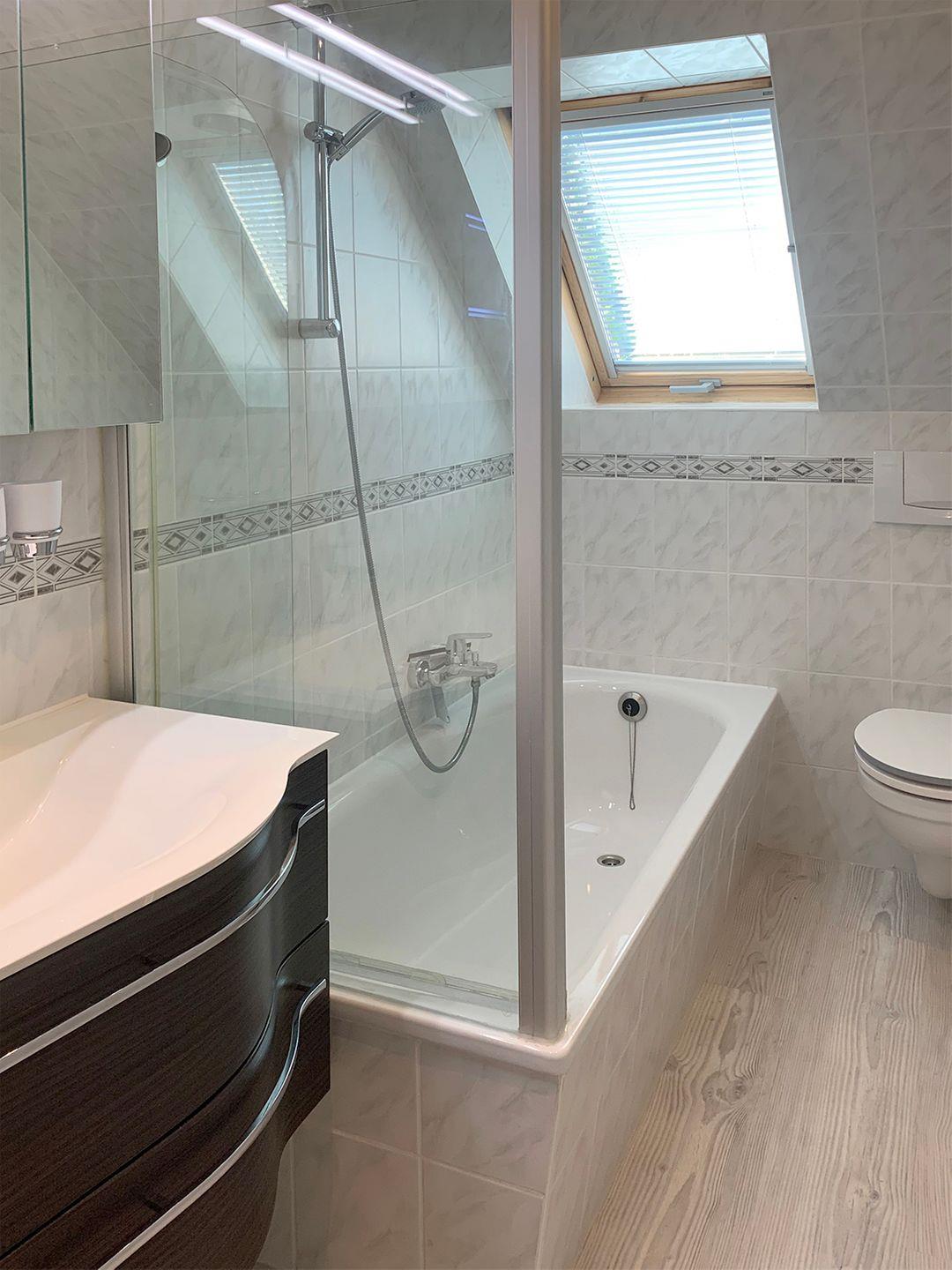 Im Dachgeschoss befindet sich ein weiteres Badezimmer mit Dusche, WC und einer Waschmaschine, die für zusätzlichen Komfort sorgt.