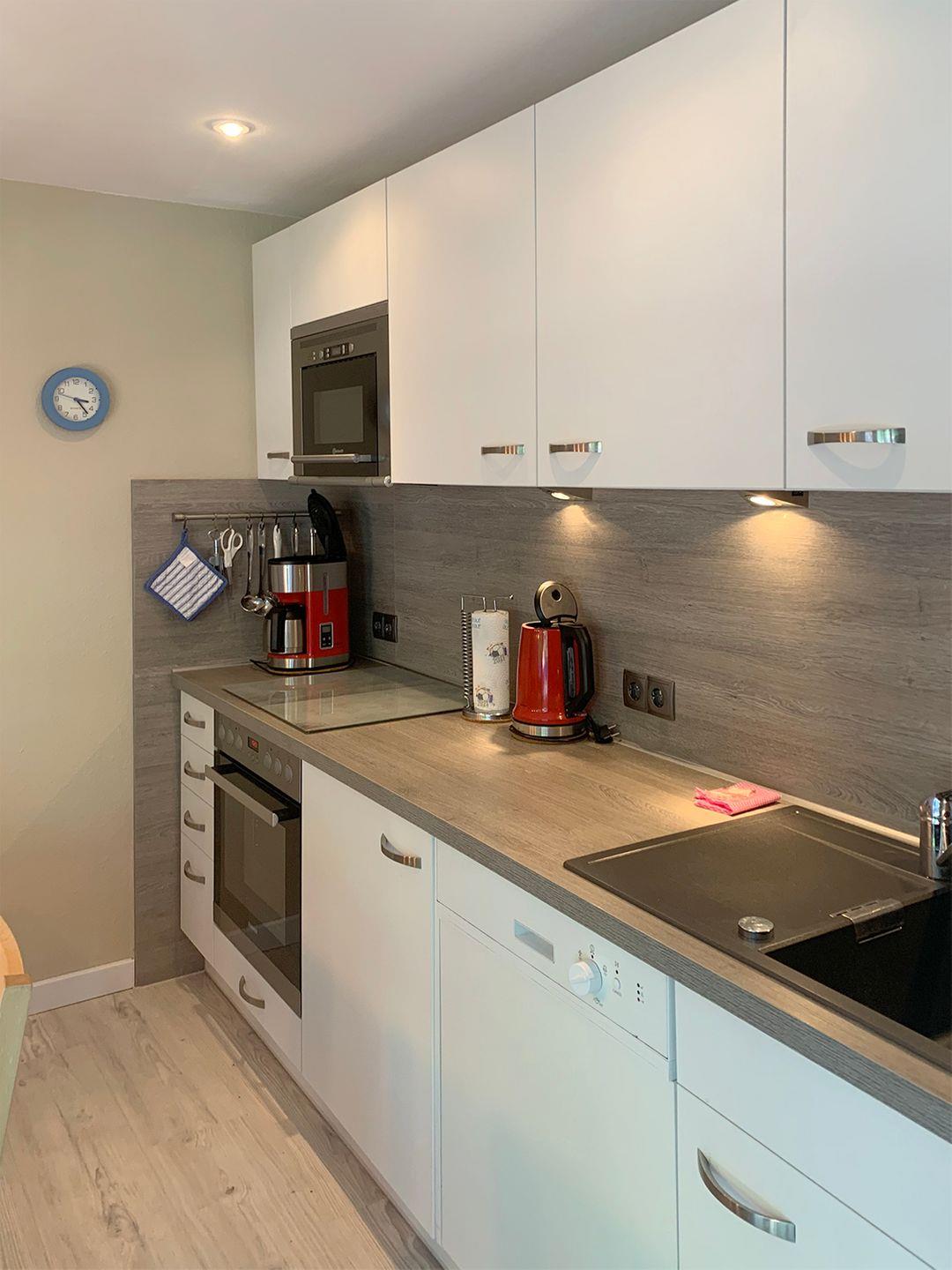 Die moderne Küchenzeile ist mit einem Backofen, Geschirrspüler, Herd, Kaffeemaschine, Kühlschrank mit Gefrierfach, Mikrowelle, Toaster und Wasserkocher ausgestattet.