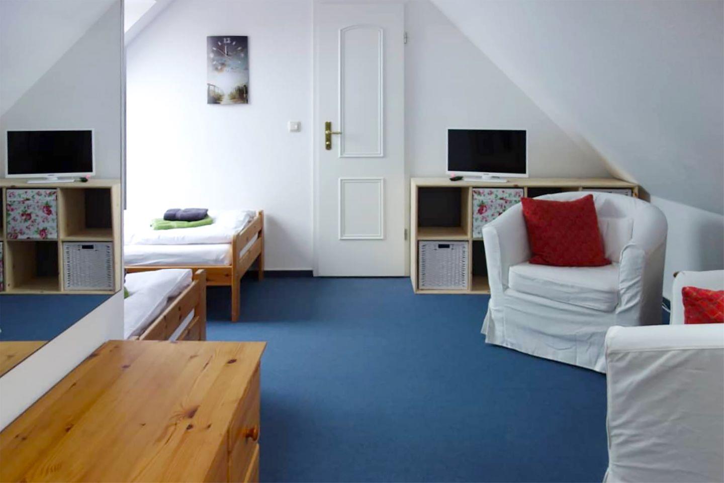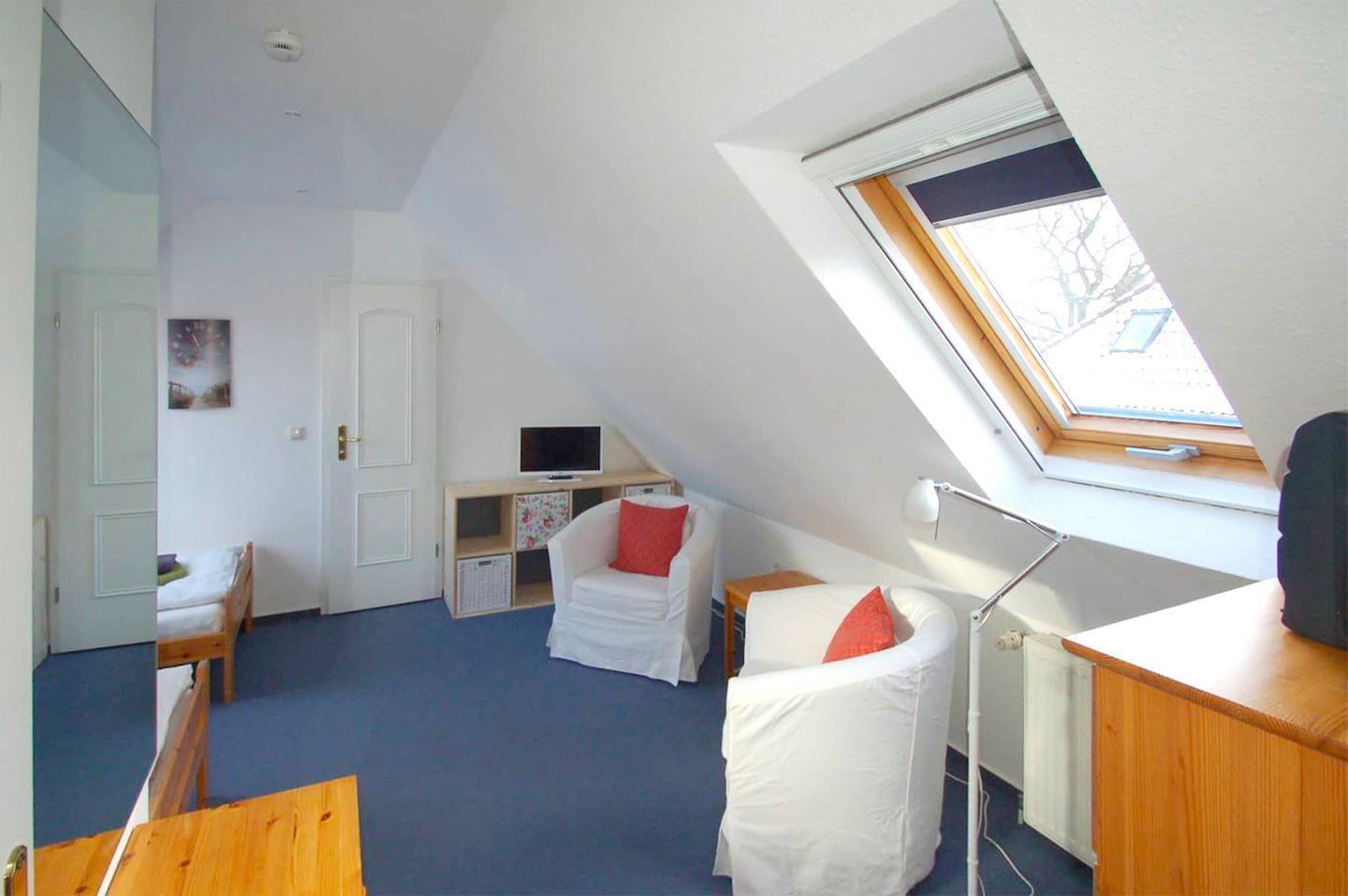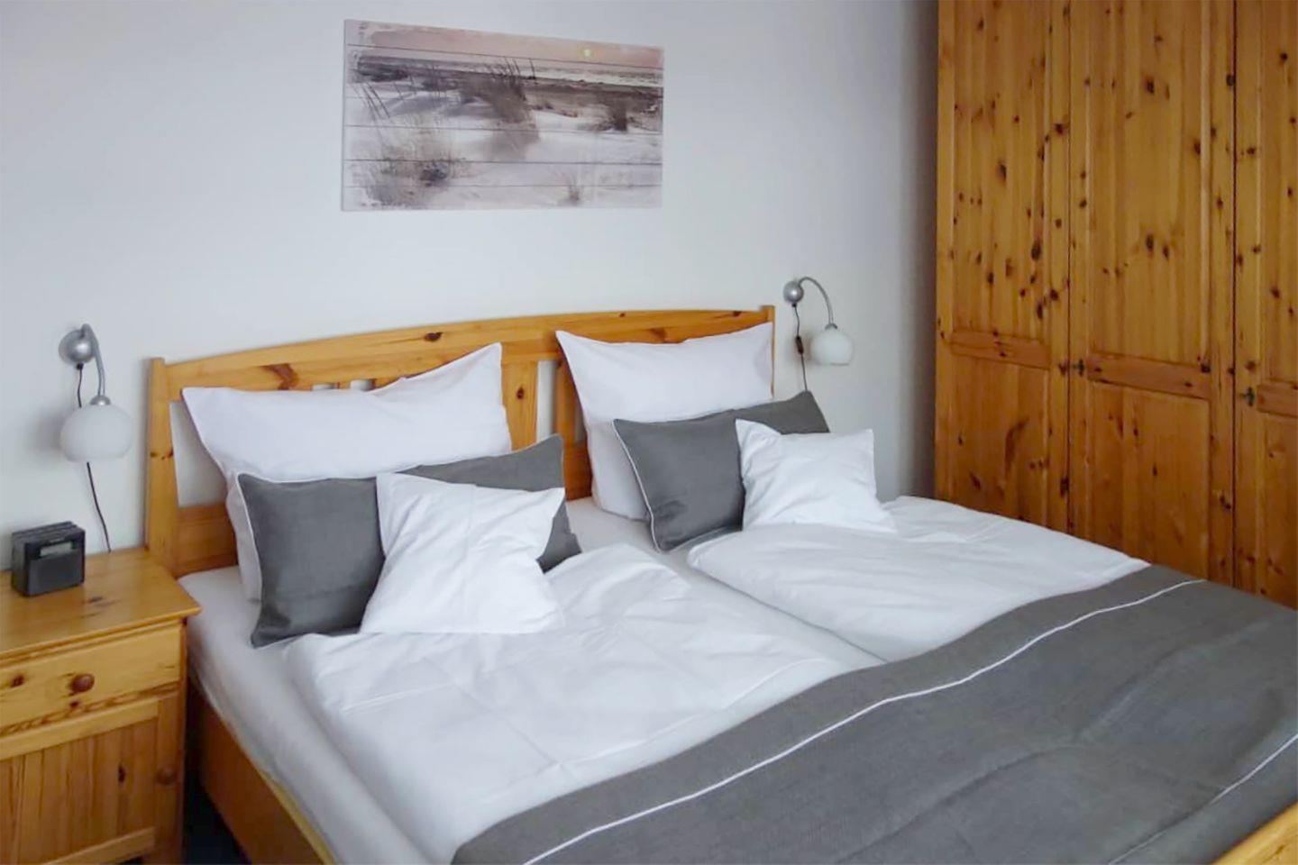 Die beiden Schlafzimmer sind komfortabel eingerichtet: Im Obergeschoss befindet sich ein Schlafzimmer mit einem Doppelbett (180 x 200 cm), im Dachgeschoss gibt es ein weiteres Schlafzimmer mit zwei Einzelbetten (90 x 200 cm) sowie ein SAT-TV.