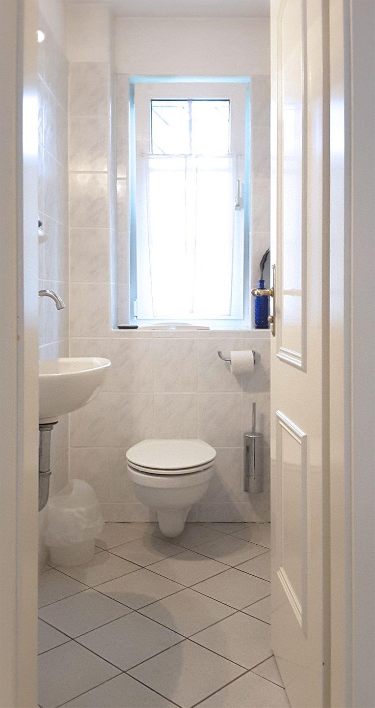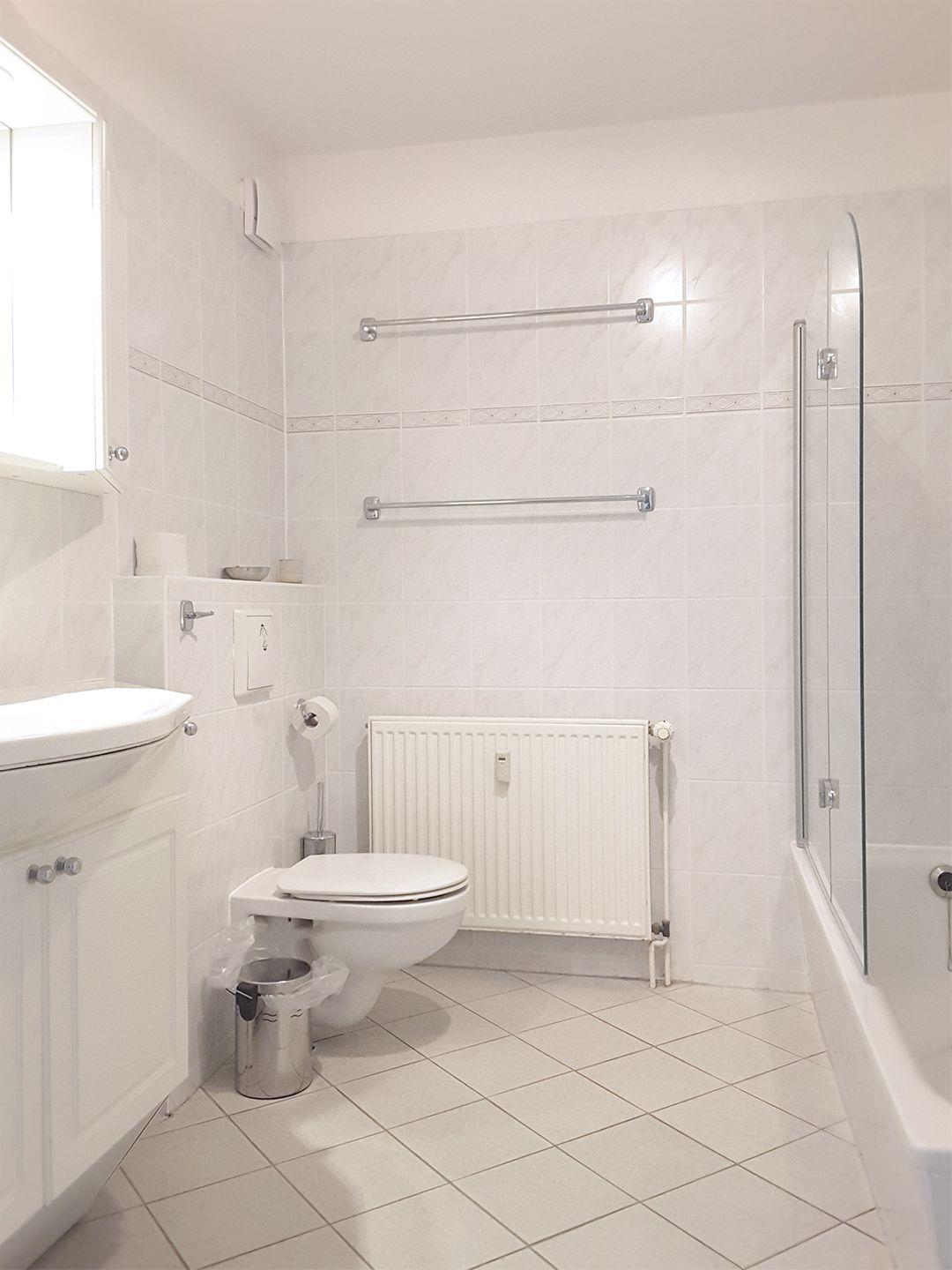 Das Badezimmer ist mit einer Badewanne und WC ausgestattet. Zusätzlich gibt es ein praktisches Gäste-WC.