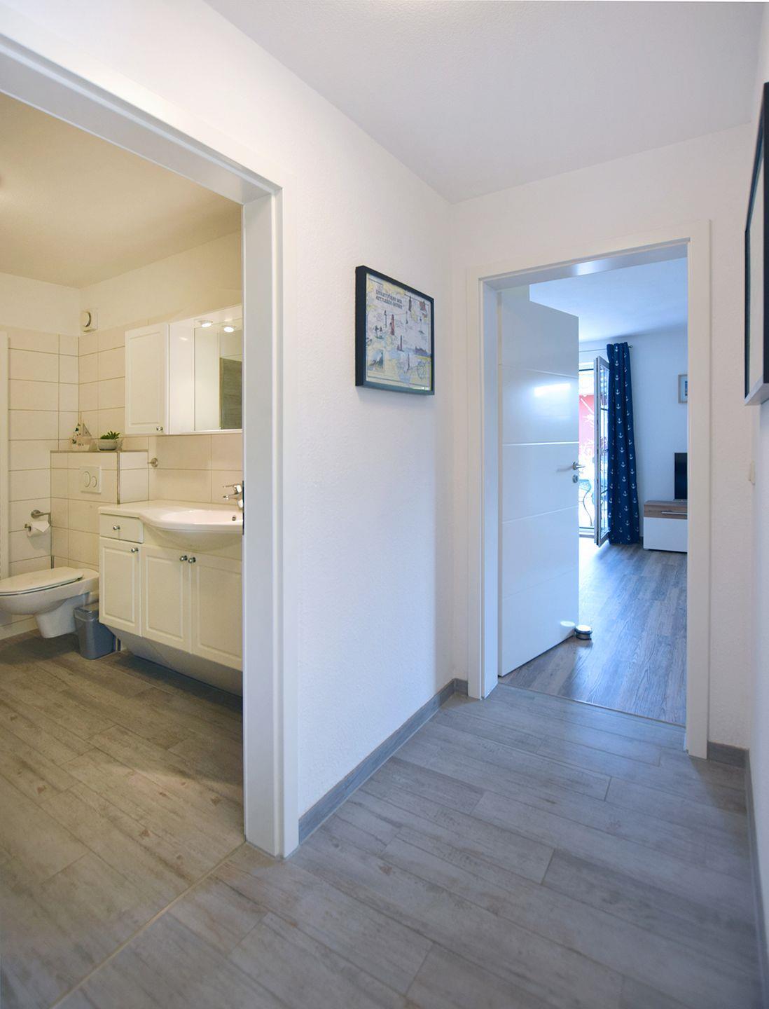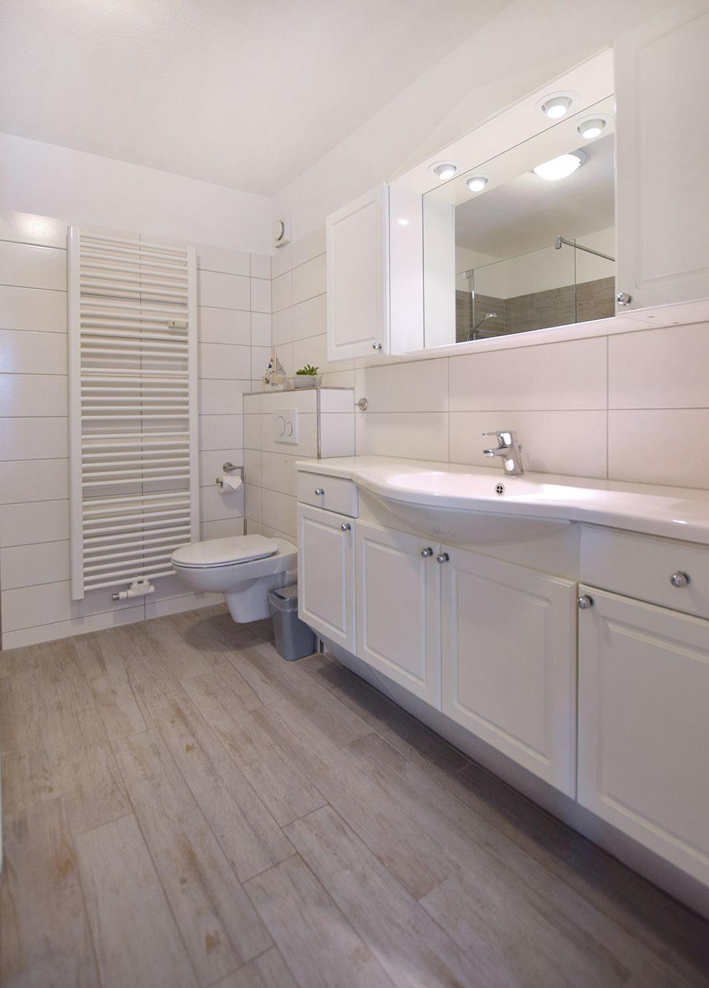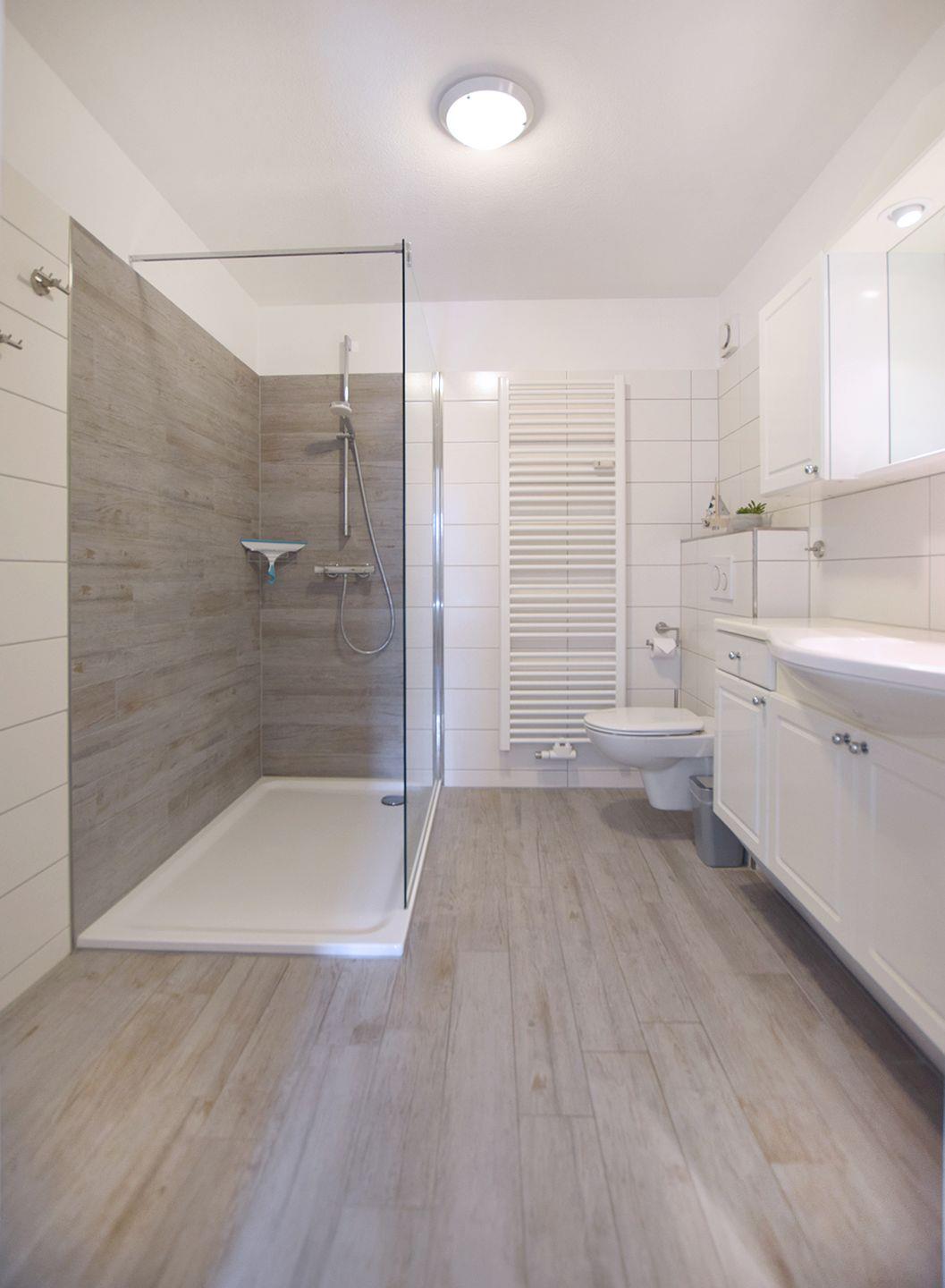 Das Badezimmer ist mit einer bodengleichen Dusche und WC ausgestattet, während das Gäste-WC zusätzlichen Komfort bietet.