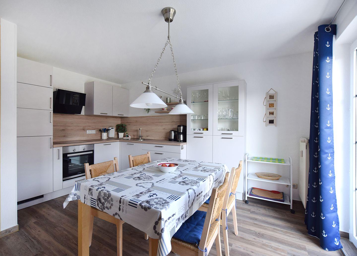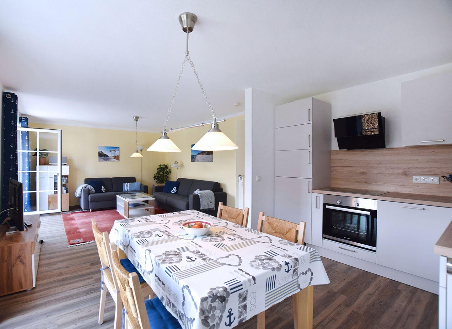 Diese gemütliche Ferienwohnung für bis zu 4 Personen (plus 1 Kleinkind) bietet auf ca. 84 m² eine ideale Unterkunft für Ihren Urlaub. Sie befindet sich im Erdgeschoss und besteht aus einem großzügigen Wohnbereich mit einer modernen Küchenzeile, zwei Schlafzimmern, einem Badezimmer und einem Gäste-WC.