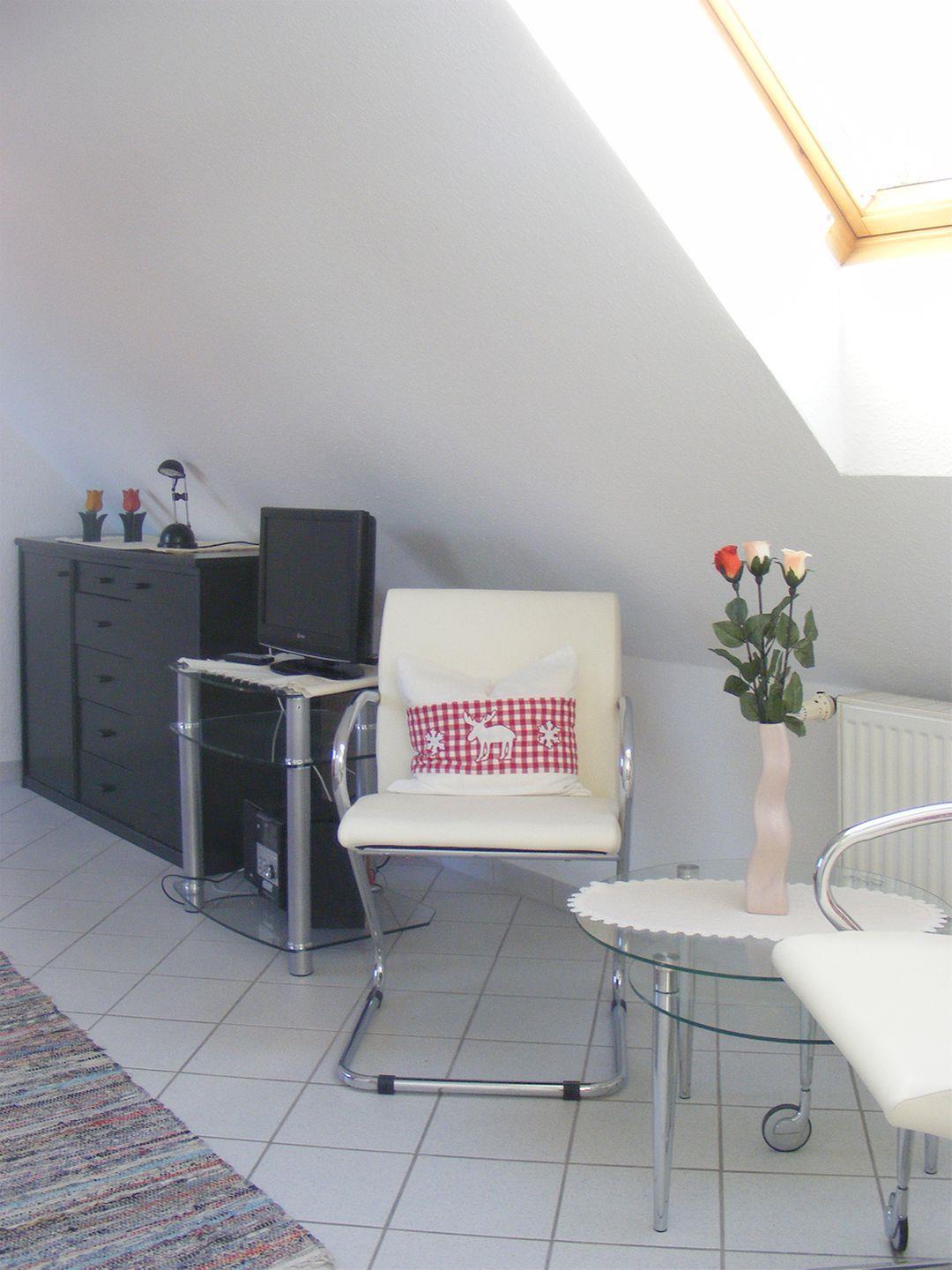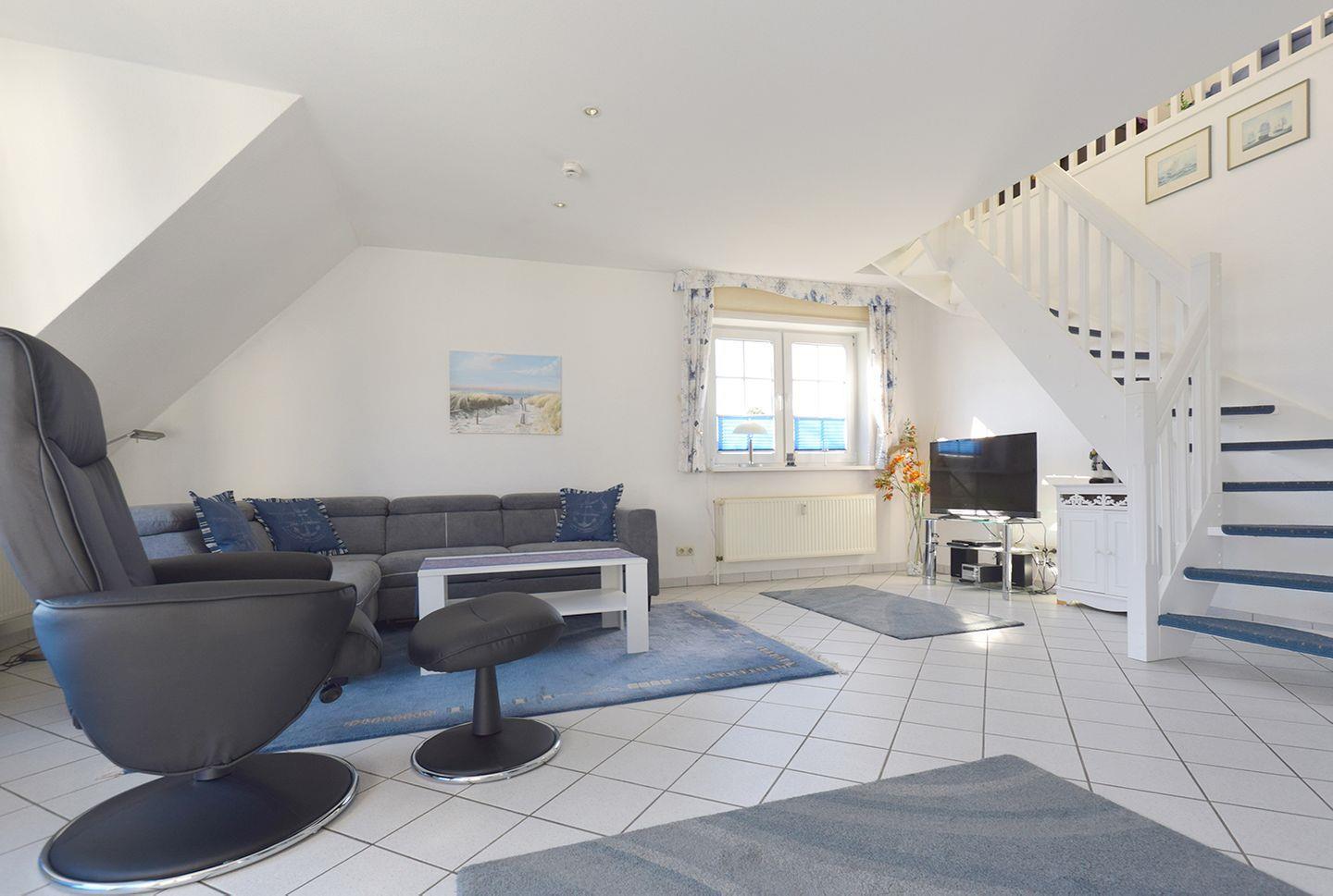Der großzügige Wohnbereich im Obergeschoss ist mit einer gemütlichen Sitzgarnitur, einem Esstisch sowie einem Radio mit CD-Player und SAT-TV ausgestattet. So können Sie gemeinsam entspannen und den Tag ausklingen lassen.