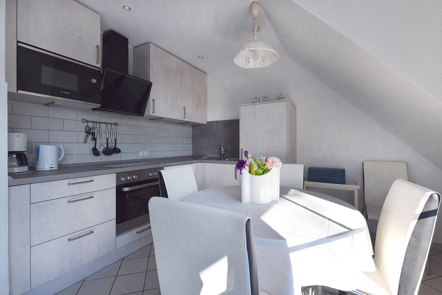 Ferienwohnung bis 4 Personen | Haustiere möglich | ca. 90 m² Wohnfläche | OG Wohnbereich mit Küchenzeile, Bad, 1 Schlafzimmer | DG Bad, 1 Schlafzimmer | Süd-Loggia | 1 Parkplatz | Wohnbereich Esstisch, Sitzgarnitur, Radio mit CD/DVD-Player, SAT-TV | Küchenzeile Backofen, Geschirrspüler, Herd, Kaffeemaschine, Kühlschrank mit Gefrierfach, Mikrowelle, Toaster, Wasserkocher | 2 Bäder Badewanne, WC im OG | Dusche, WC im DG | 2 Schlafzimmer 1 Doppelbett (180 x 200 cm) im OG | 1 Doppelbett (180 x 200 cm) im DG | WLAN