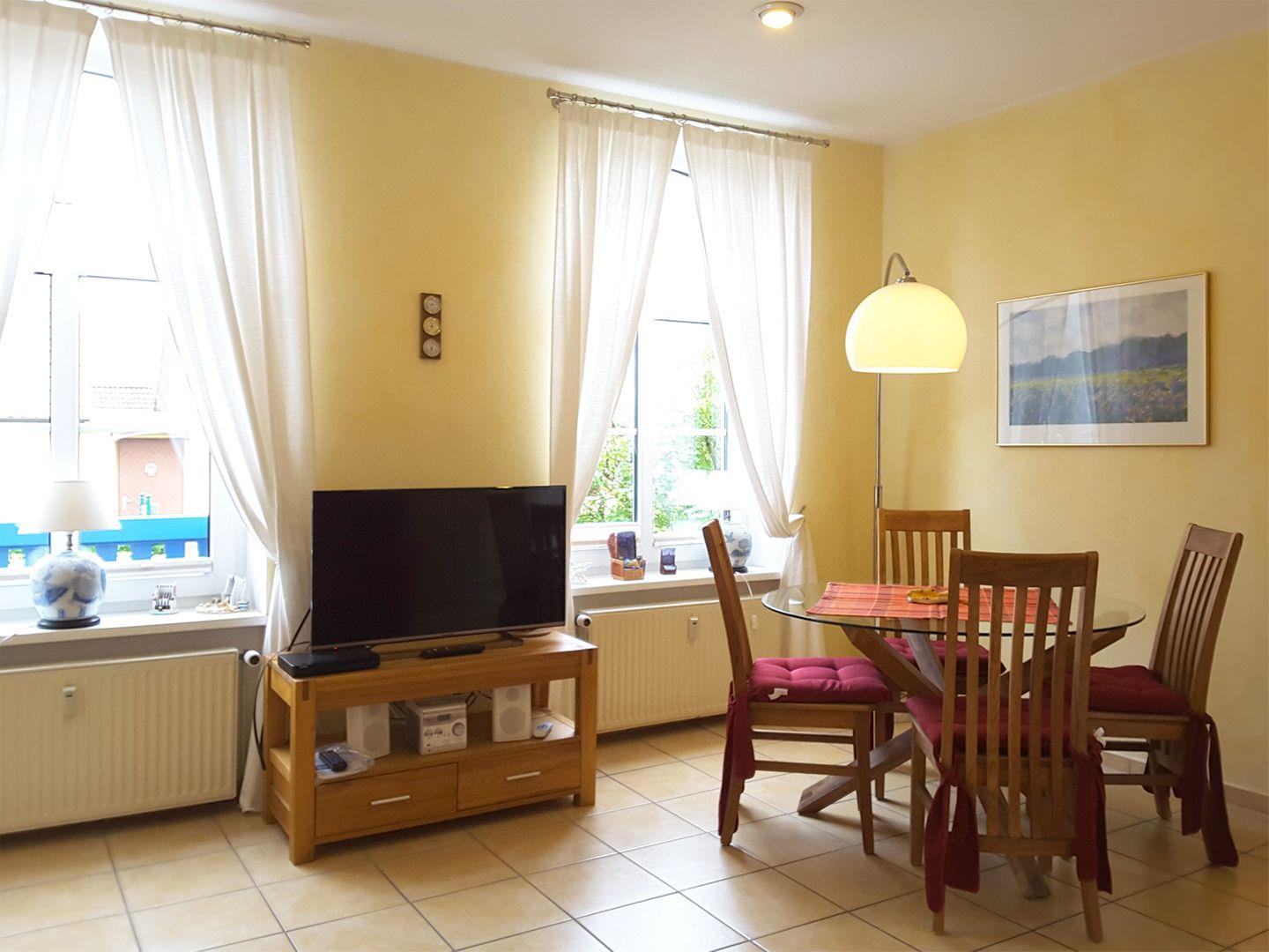 Ferienwohnung bis 4 Personen | Haustiere möglich | ca. 60 m² Wohnfläche | EG Wohnzimmer, Küche, Bad, 1 Schlafzimmer | Süd-Terrasse | 1 Parkplatz | Wohnzimmer Esstisch, Schlafsofa, Radio mit CD-Player, TV SAT/Kabel | Küche Esstisch, komplett eingerichtete Einbauküche mit Backofen, Geschirrspüler, Herd, Kaffeemaschine, Kühlschrank mit Gefrierfach, Mikrowelle, Toaster, Wasserkocher | Bad Badewanne, WC | 1 Schlafzimmer 1 Doppelbett (180 x 200 cm) | ab 7 ÜN inkl. Bettwäsche, Strandkorb, WLAN