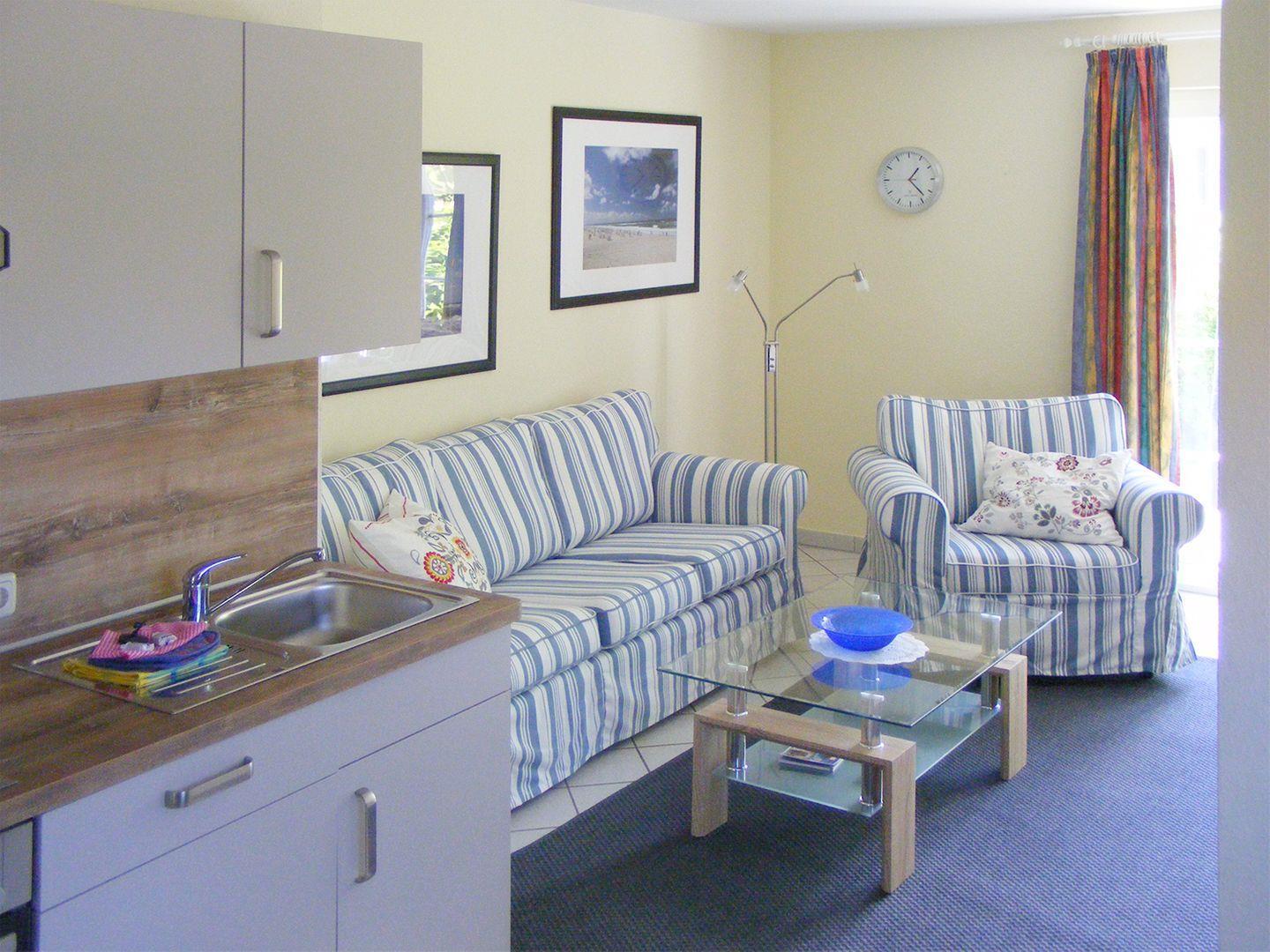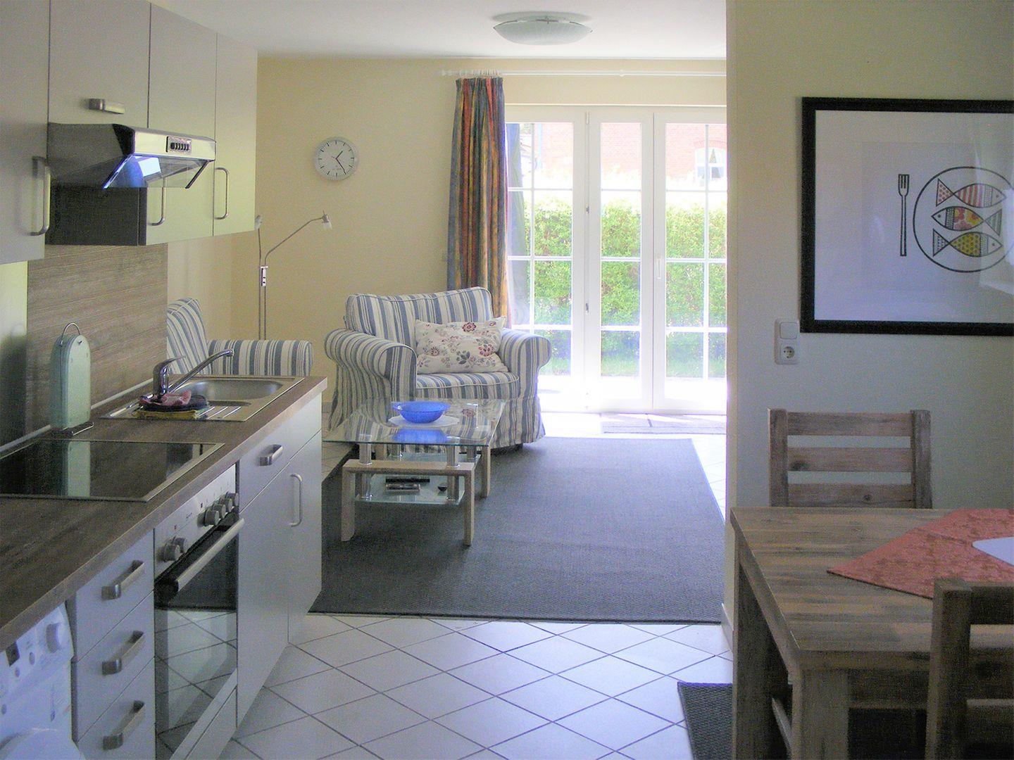 Diese gemütliche Ferienwohnung für bis zu 4 Personen bietet auf ca. 60 m² Wohnfläche eine komfortable Unterkunft im Erdgeschoss. Der Wohnbereich ist mit einer modernen Sitzgarnitur, einem Esstisch, sowie einem Radio mit CD-Player und SAT-TV ausgestattet – ideal zum Entspannen nach einem ereignisreichen Tag. Die offene Küchenzeile lässt keine Wünsche offen und bietet alles, was Sie für die Zubereitung Ihrer Mahlzeiten benötigen: Einen Backofen, Geschirrspüler, Herd, Kaffeemaschine, Kühlschrank mit Gefrierfach, Mikrowelle, Toaster und Wasserkocher. Eine Waschmaschine steht Ihnen ebenfalls zur Verfügung. Das Badezimmer ist mit einer Badewanne und einem WC ausgestattet.