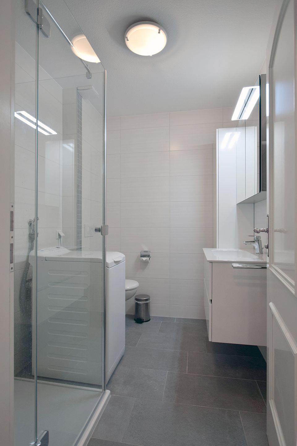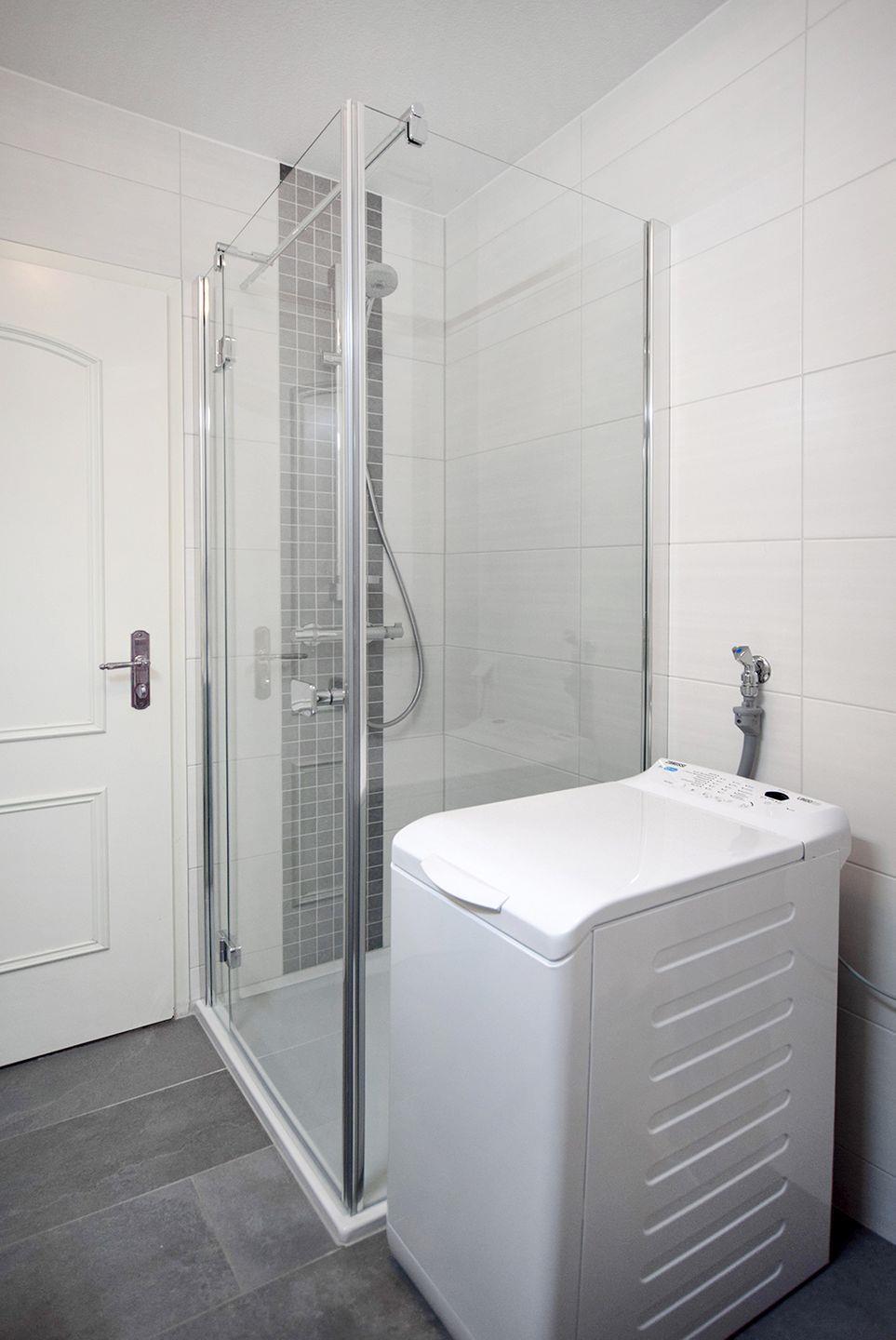 Das Duschbad verfügt über eine moderne Einrichtung mit WC und Waschmaschine, was besonders praktisch für längere Aufenthalte ist.