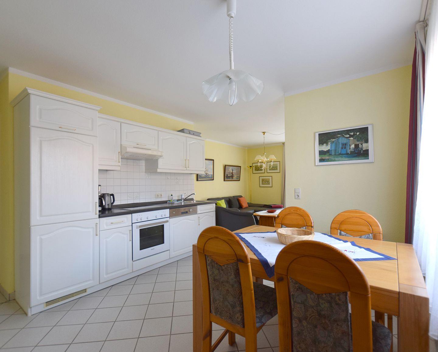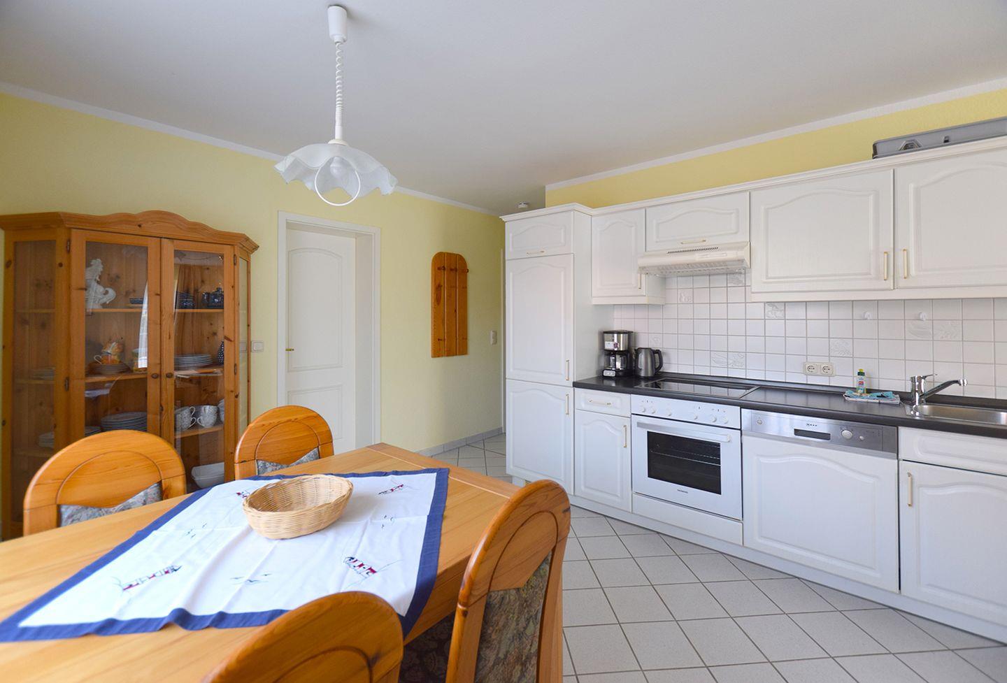 Die angrenzende Küchenzeile ist voll ausgestattet mit einem Backofen, Geschirrspüler, Herd, Kaffeemaschine, Kühlschrank, Toaster und Wasserkocher, sodass Sie sich problemlos selbst versorgen können.