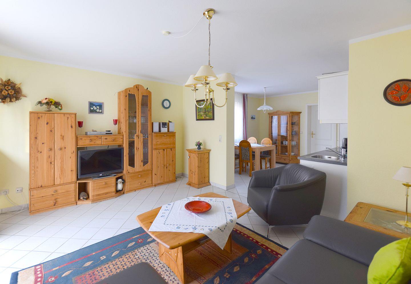 Die Ferienwohnung mit ca. 60 m² Wohnfläche bietet Platz für bis zu 4 Personen und befindet sich im Erdgeschoss. Ideal für Familien oder kleine Gruppen, die eine komfortable Unterkunft in ruhiger Lage suchen. Der Wohnbereich ist gemütlich eingerichtet und umfasst eine Sitzgarnitur, einen Esstisch sowie ein Radio mit CD-Player und SAT-TV für Ihre Unterhaltung.