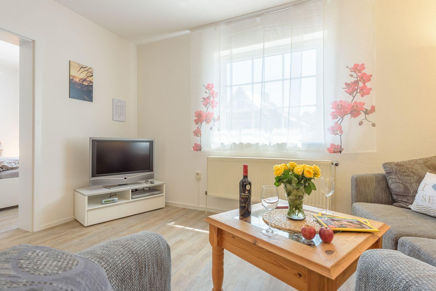 Ferienwohnung bis 2 Personen (+1 Kind bis 6 Jahre) | ca. 35 m2 Wohnfläche | 1. OG Wohnbereich mit Küchenzeile, Bad, 1 Schlafzimmer | eigene Terrasse im gemeinschaftlichen Garten inkl. Möbeln | 1 Parkplatz | Wohnbereich Sitzgarnitur mit Schlaffunktion und Sessel, Flachbild-SAT-TV, DVD-Player, Radio | Küchenzeile 2-Platten-Cerankochfeld, Backofen, Geschirrspüler, Kaffeemaschine, Toaster, Wasserkocher, Kühlschrank mit Gefrierfach, Esstisch mit vier Stühlen | Bad Dusche, WC | Schlafzimmer 1 Doppelbett (180 x 200 cm) und 1 Kinderhochbett (140 x 70 cm), WLAN vorhanden