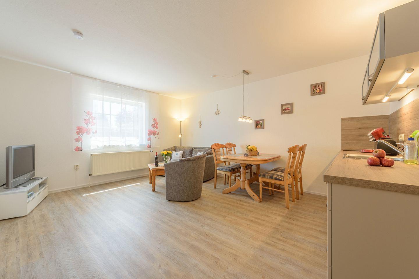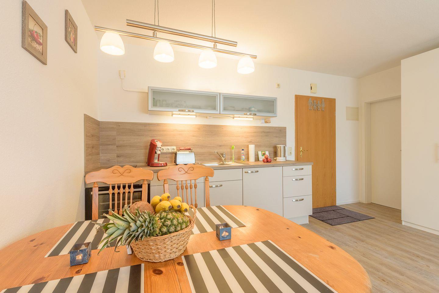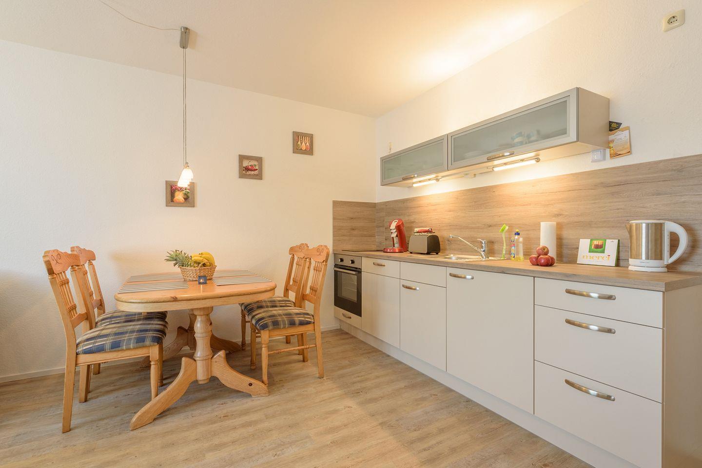 Die angrenzende Küchenzeile ist funktional mit einem 2-Platten-Cerankochfeld, Backofen, Geschirrspüler, Kaffeemaschine, Toaster, Wasserkocher sowie einem Kühlschrank mit Gefrierfach ausgestattet. Ein Esstisch mit vier Stühlen rundet die Ausstattung ab.