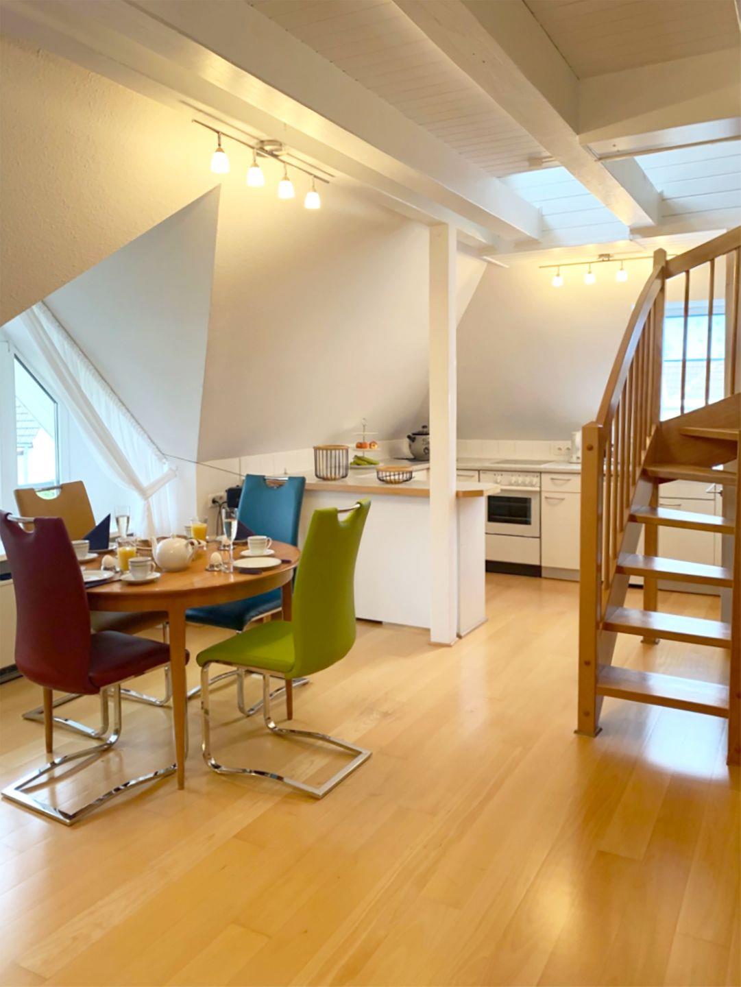 Ferienwohnung bis 4 Personen | ca. 57 qm Wohnfläche | OG Wohnbereich mit Einbauküche, Bad, 2 Schlafzimmer | 1 Parkplatz | Wohnbereich Esstisch, Sitzgarnitur, Radio mit CD-Player, TV SAT | Einbauküche Backofen, Geschirrspüler, Herd, Kaffeemaschine, Kühlschrank mit Gefrierfach, Mikrowelle, Toaster, Wasserkocher, Waschmaschine | Bad Dusche, WC | 2 Schlafzimmer 1 Doppelbett (160 x 200 cm), 2 Einzelbetten (90 x 200 cm) | DG Galerie mit Sofa und Schaukelstuhl | WLAN, Waschmaschine, Haustiere erlaubt