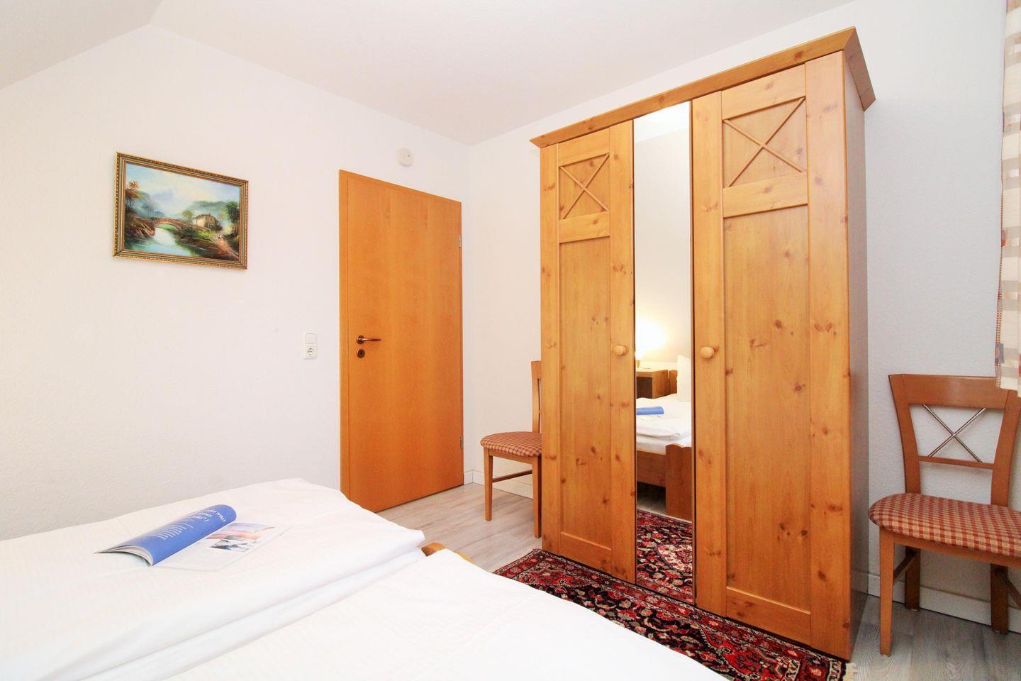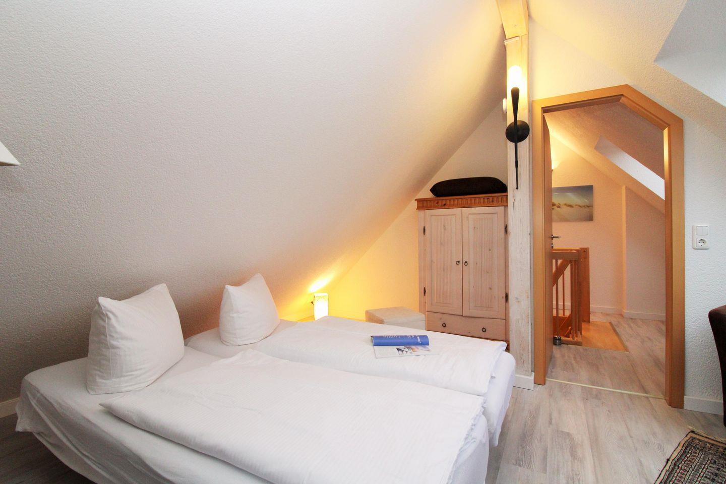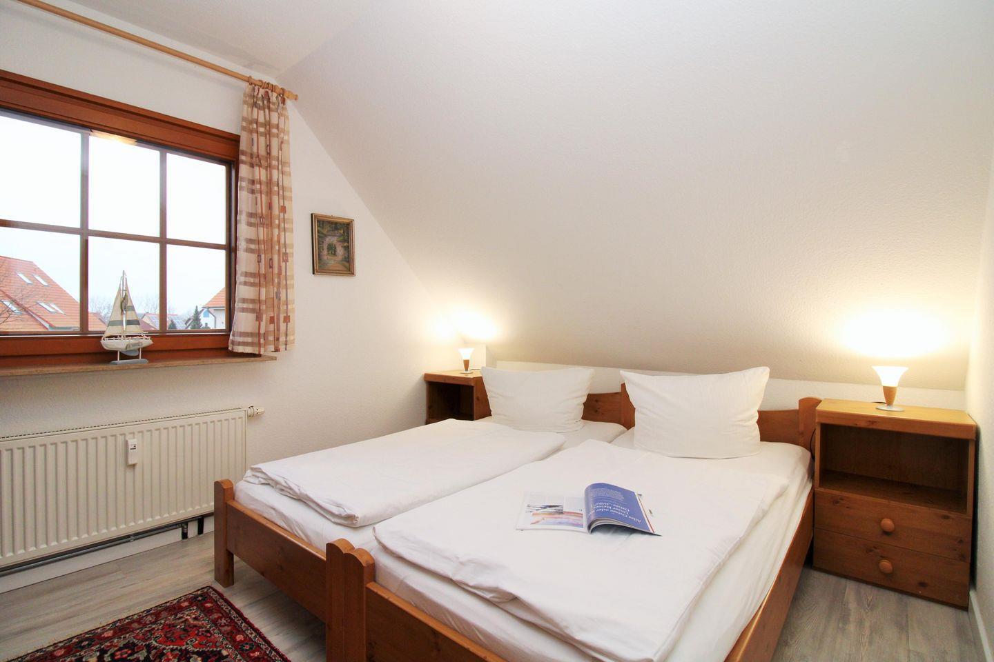 Das gemütliche 1. Schlafzimmer (in der unteren Etage) ist mit 2 bequemen zusammenstehenden Einzelbetten, 2 Nachttischen, einem geräumigen Kleiderschrank sowie 2 Stühlen eingerichtet.