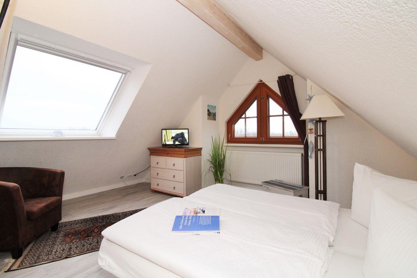 Im 2. Obergeschoss befindet sich das geräumige und separate 2. Schlafzimmer. Dieses verfügt über eine (Schlaf)-Couch, die mit wenigen Handgriffen zu einem bequemen Bett für 2 Personen umgebaut werden kann, eine Kommode, einen geräumigen Wäscheschrank sowie einen Sessel. Darüber hinaus steht Ihnen in diesem Zimmer ein zusätzliches TV-Gerät zur Verfügung.