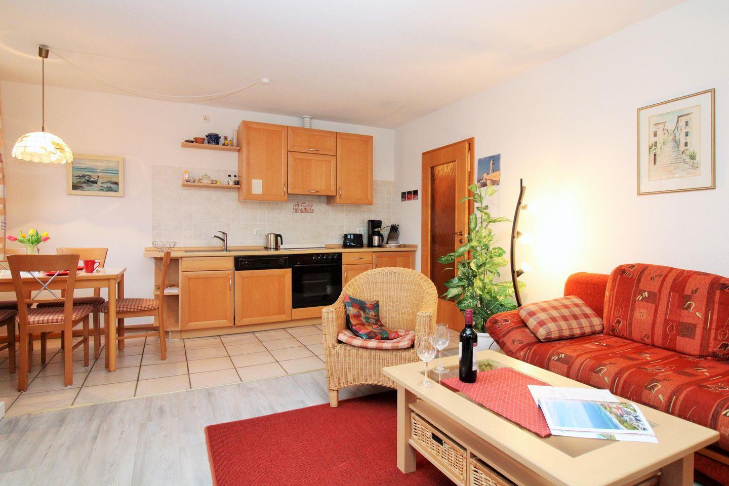 Die offene Küche beinhaltet eine voll ausgestattete Einbauküchenzeile Ausstattung mit 4-Platten-Ceran-Kochfeld, Backofen, Dunstabzug, Mikrowelle, Kühlschrank mit Gefrierfach, Geschirrspülmaschine, Kaffeemaschine, Wasserkocher und Toaster. Die Küche ist mit Geschirr, Gläsern, Besteck und Töpfen komplett ausgestattet.