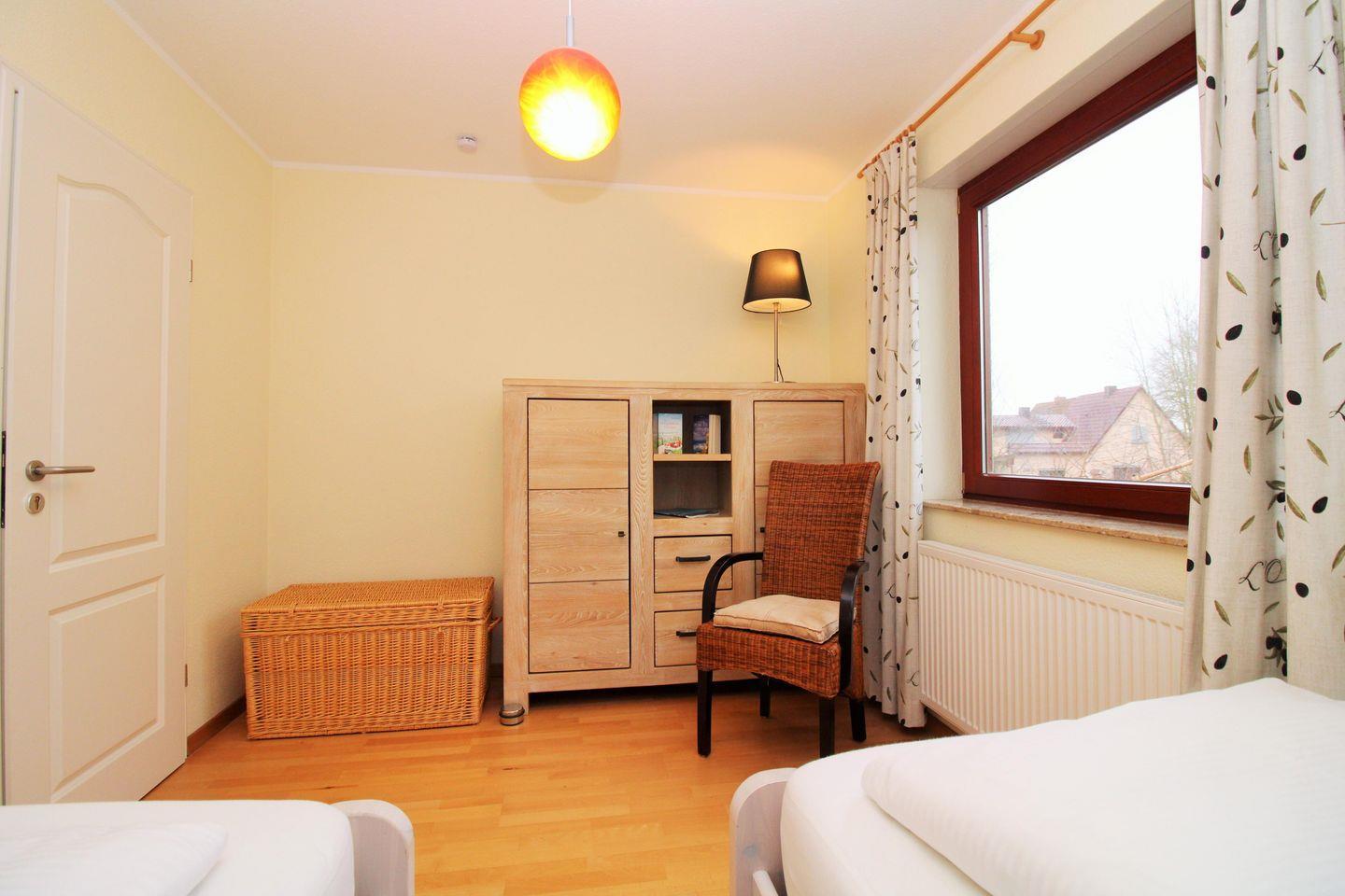 Das zusätzliche 3. Schlafzimmer verfügt über 2 getrennte Einzelbetten mit Nachttisch, einen Sessel sowie einen geräumigen Wäscheschrank.