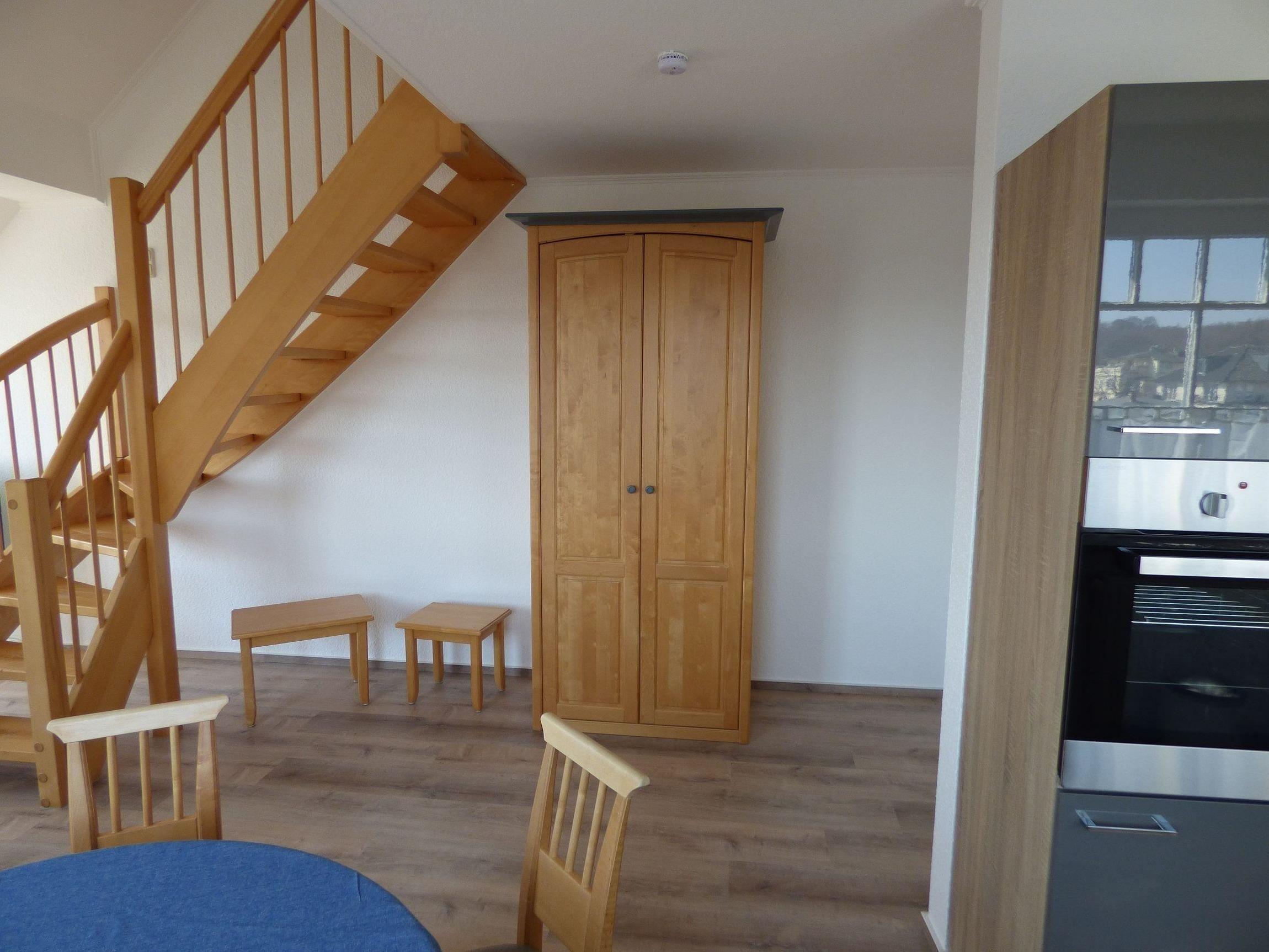 Der Wohnbereich hat eine offene Küche. Im Wohnzimmer befinden sich eine ausziehbare Schlafcouch für 1-2 Personen und ein Fernseher. Im Essbereich ist ein runder Esstisch mit 6 Stühlen (2 weitere Stühle befinden sich im Schlafzimmer). Es gibt ein Schlafzimmer mit einem Doppelbett und ein Babybett. Ein zweites Schlafzimmer befindet sich im Obergeschoß mit 1 Doppelbett und 2 Einzelbetten. (Zusammen stehen Ihnen 6 Schlafgelegenheiten in Betten, 2 Schlafgelegenheiten auf der Schlafcouch und 1 Babybett zur Verfügung).