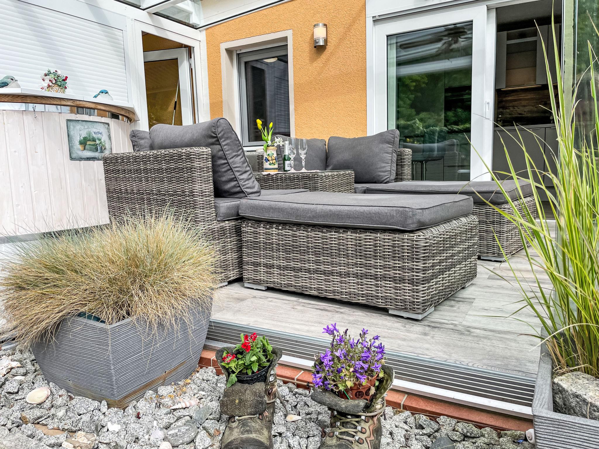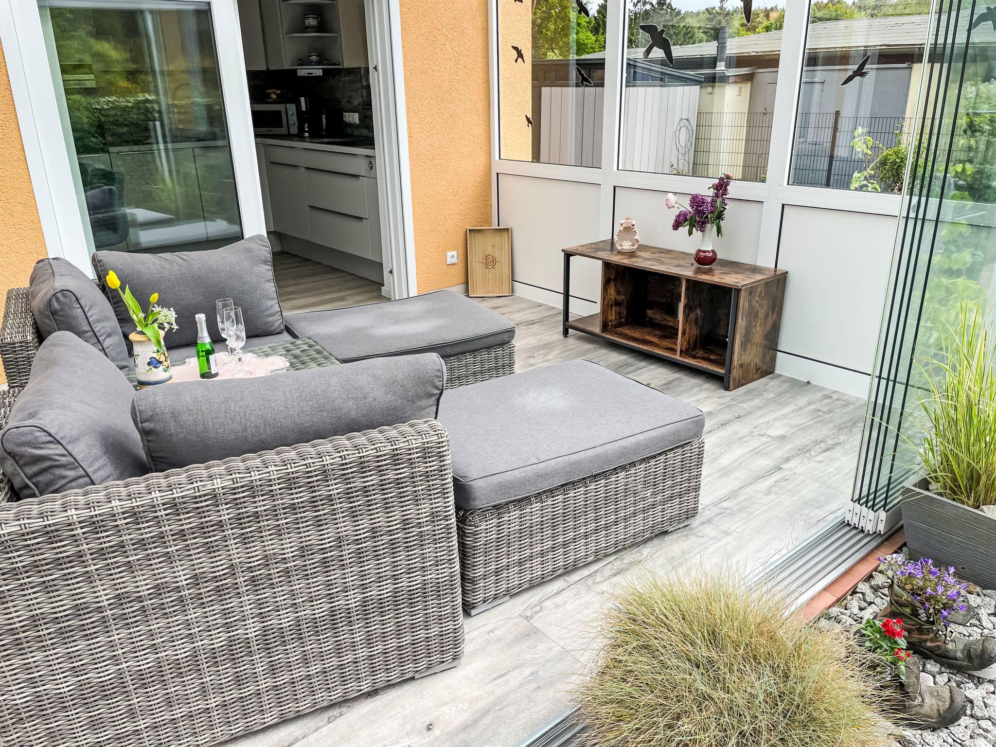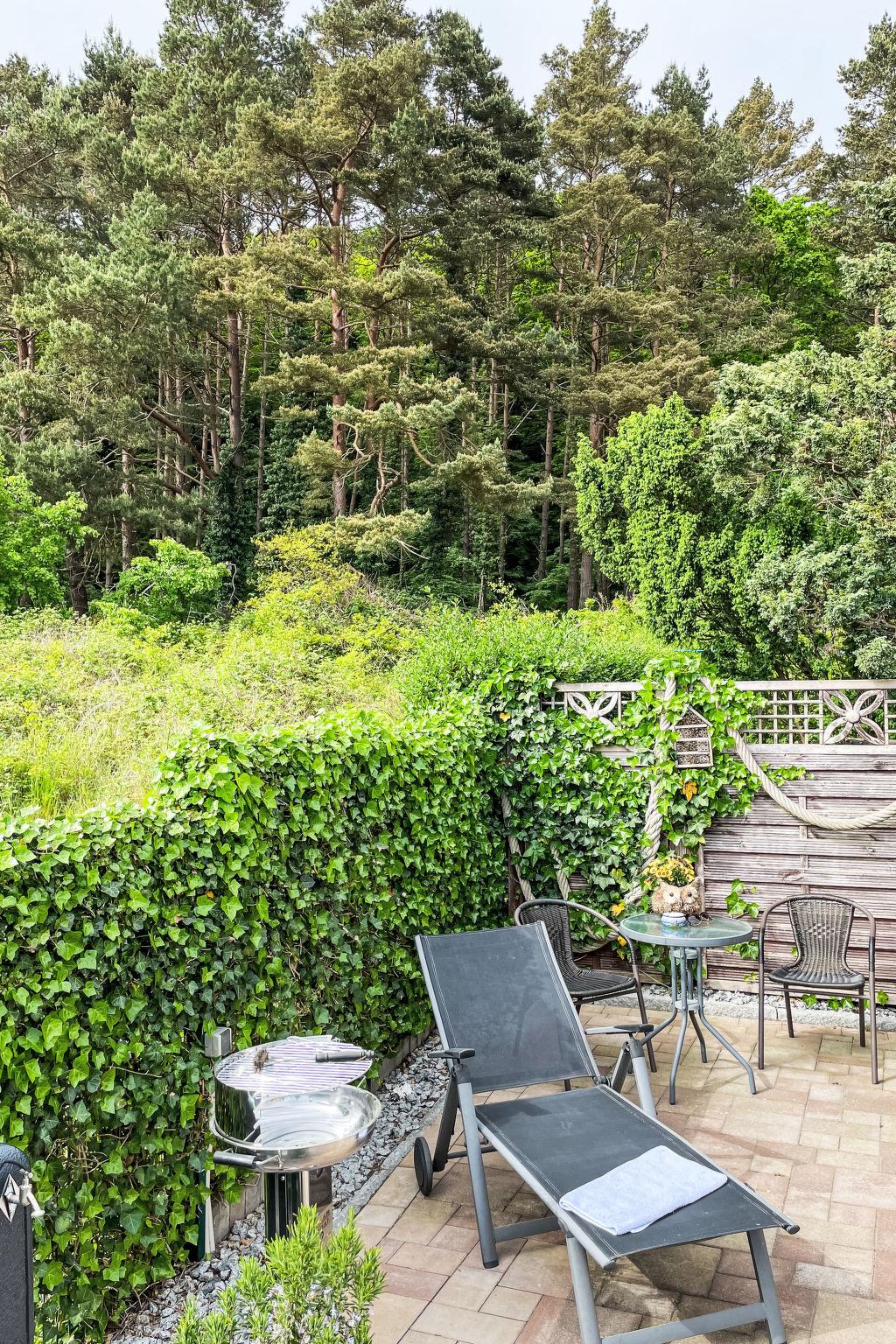 Gemütlicher moderner Bungalow mit Terrasse und Waldblick, nahe Sellin und Ostsee, ideal für erholsame Tage zu zweit.
