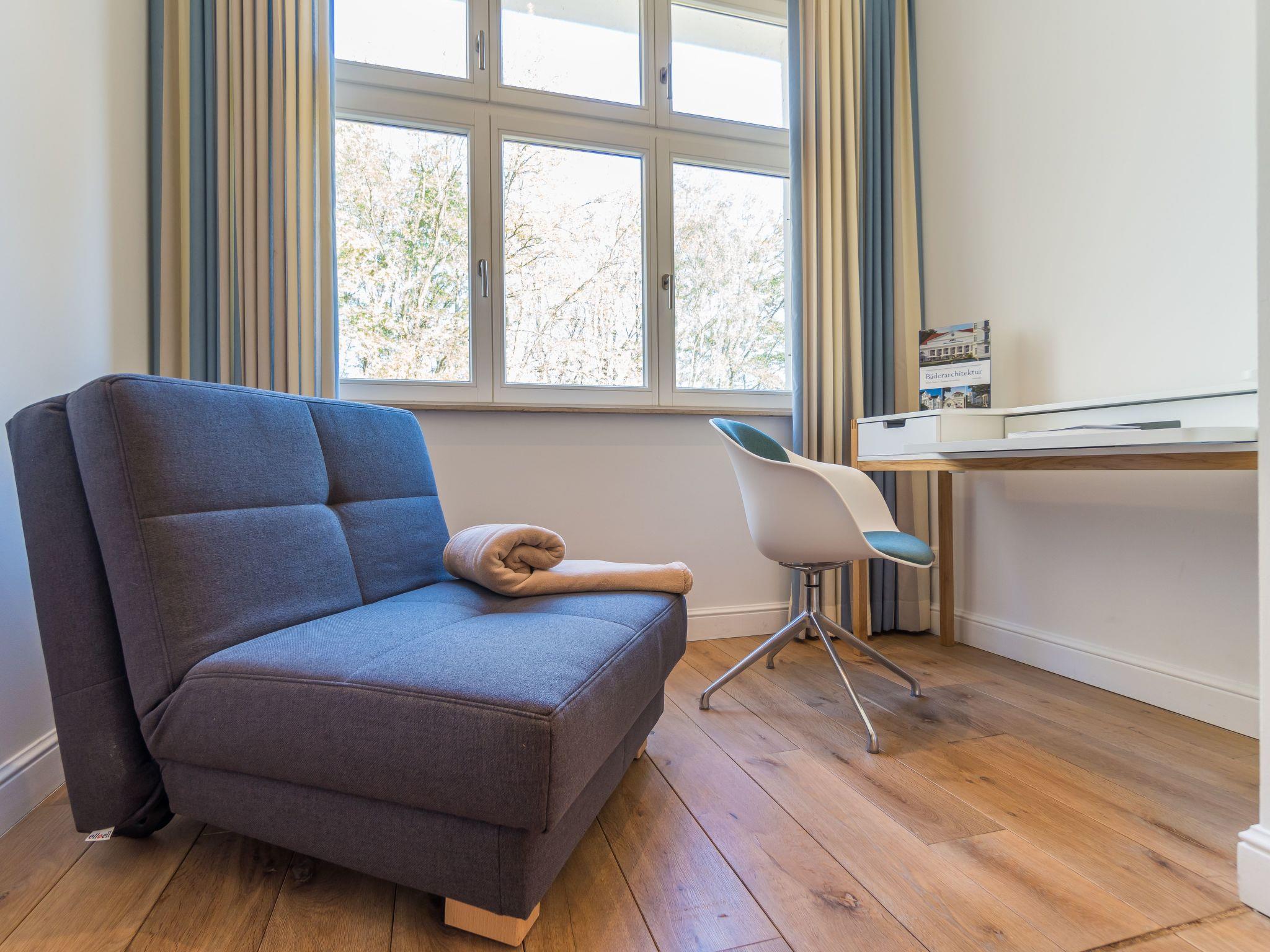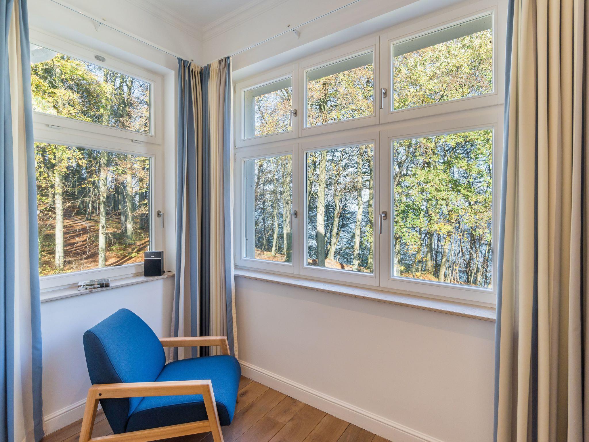Hier genießen Sie einen fantastischen Blick auf den Buchenwald und ab der Laubfärbung in den Wintermonaten sogar auf die Ostsee. Bei geöffnetem Fenster ist das Rauschen der See unüberhörbar. Das einfallende Tageslicht sorgt jederzeit für eine angenehme und exklusive Wohlfühlatmosphäre.