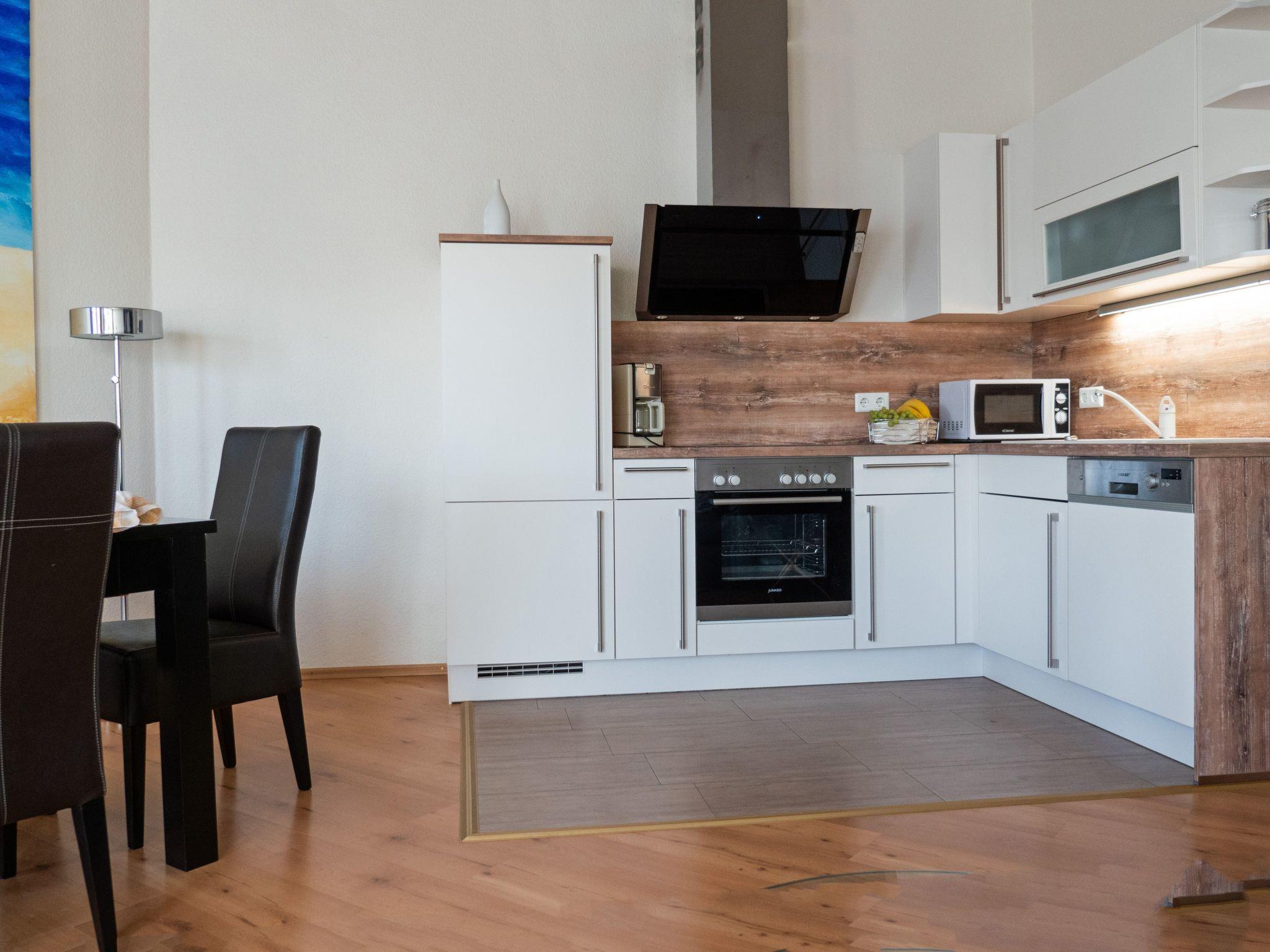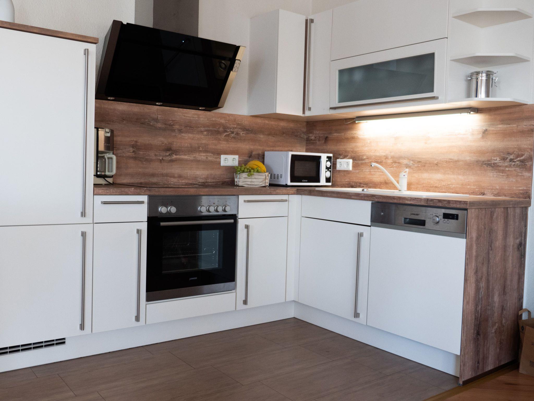 Integrierte Wohnküche, gut ausgestattet mit Spülmaschine, Mikrowelle, Backofen und Kaffeemaschine
