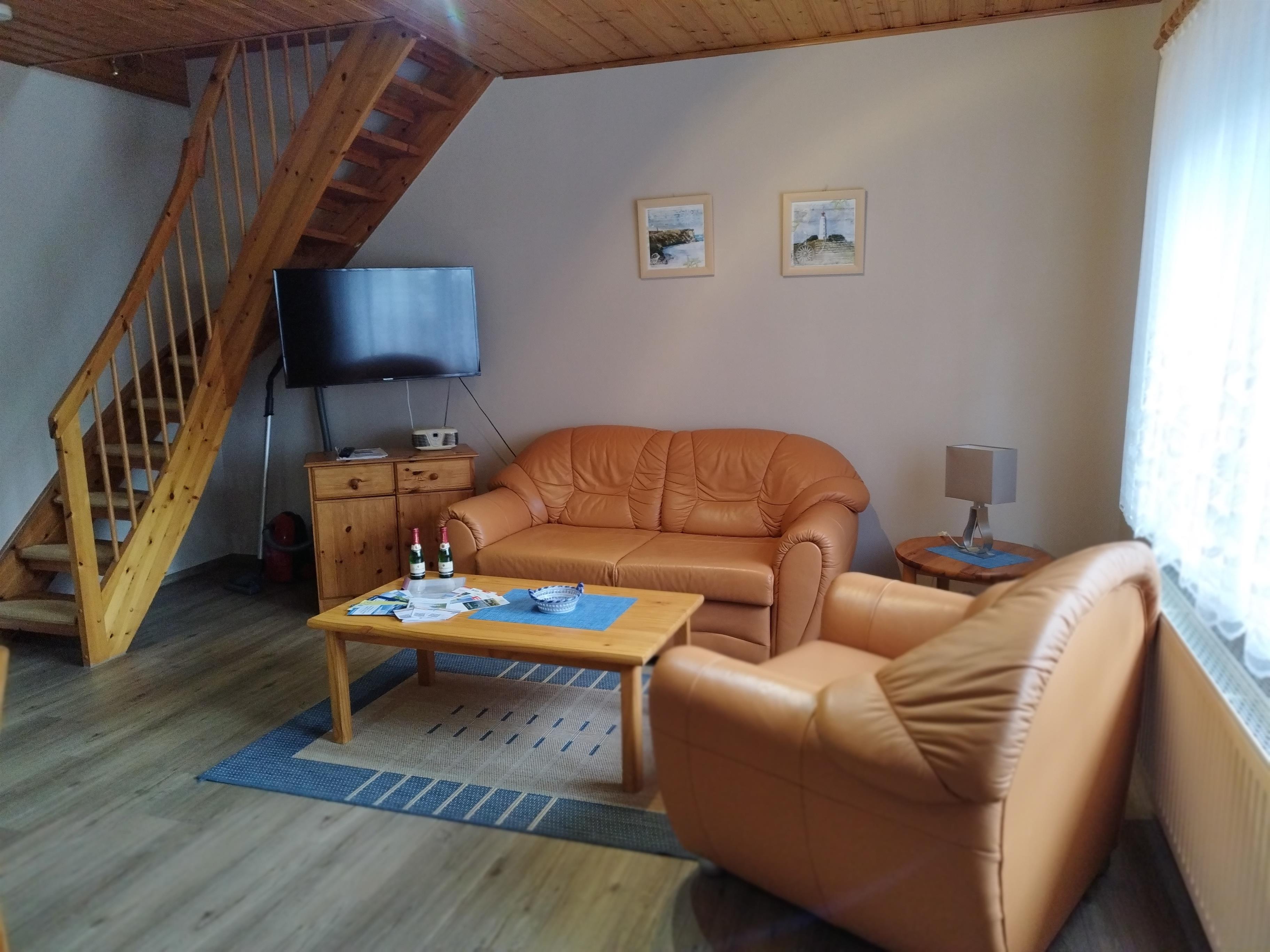 Im Erdgeschoss befindet sich das Wohnzimmer mit Küchenzeile und das Badezimmer mit Dusche/WC.