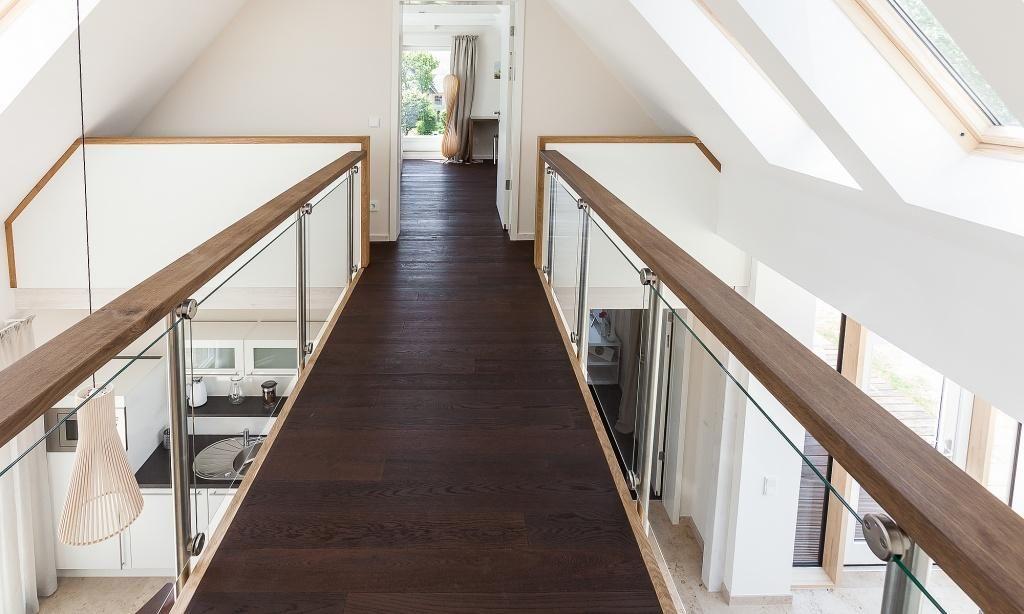 Im Obergeschoss befindet sich ein weiteres Schlafzimmer mit flexibel nutzbaren Einzel- oder Doppelbetten (Schiebesystem) sowie ein zusätzliches Bad mit Dusche/WC. Von hier genießt du einen kleinen Blick auf die Ostsee.