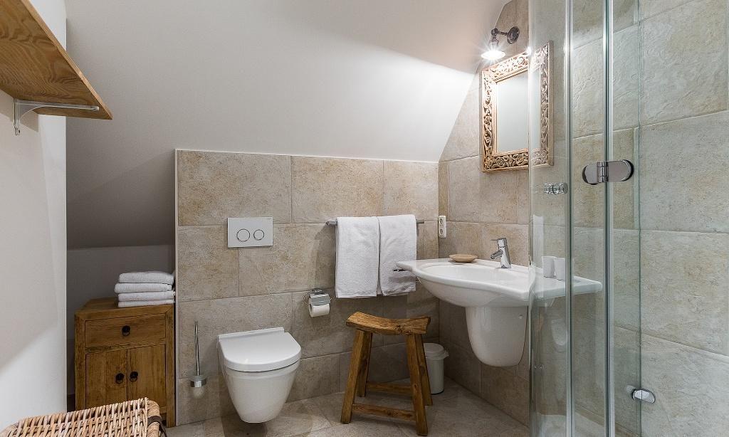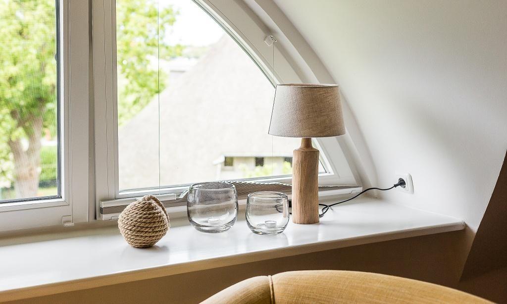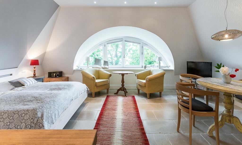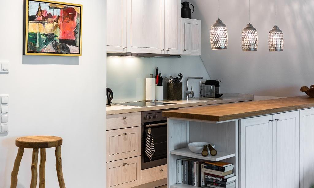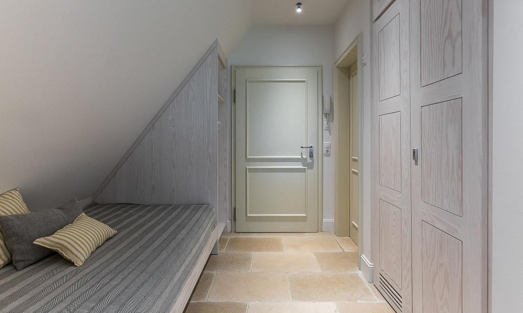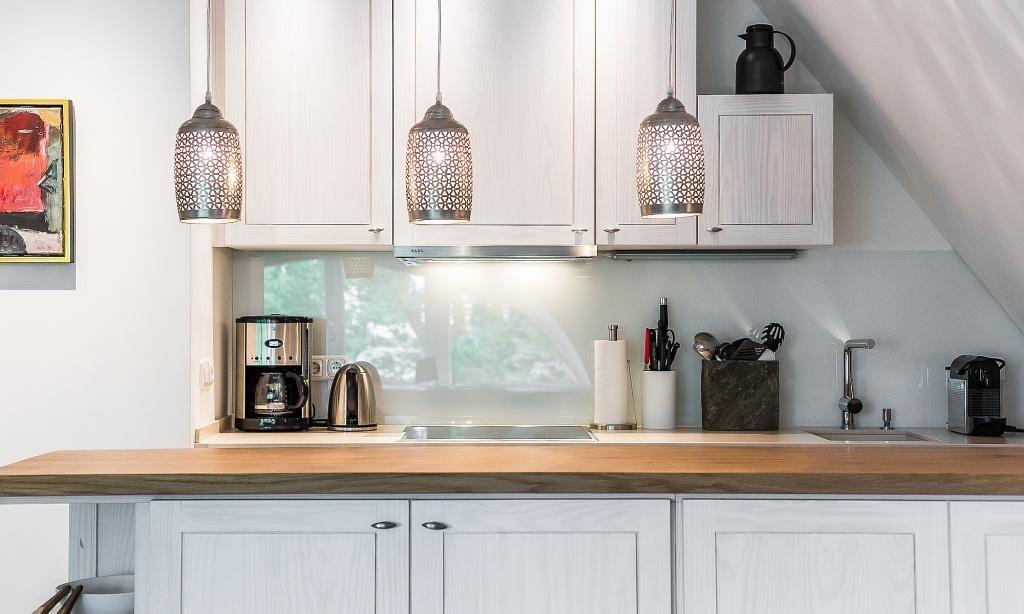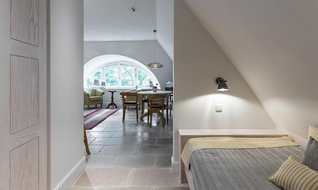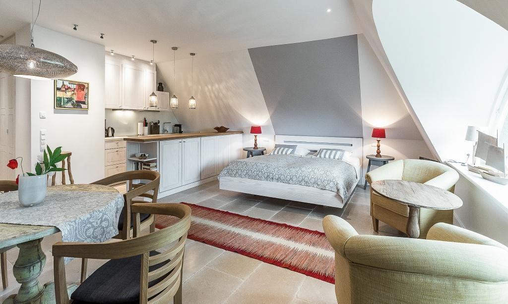 Die Studiowohnung im Dachgeschoss begeistert durch ihre stilvolle Einrichtung und komfortable Aufteilung. Es erwartet dich ein eleganter Wohn- und Schlafraum mit einem gemütlichen Sitzplatz am Gaubenfenster mit traumhaftem Boddenblick, ein Esstisch, ein exquisites Doppelbett und eine moderne Küchenzeile. Sanfte Naturtöne und -materialien sowie ausgesuchte Deko-Elemente machen den Wohlfühl- und Wohnkomfort perfekt. Eine separate Schlafnische mit einem Einzelbett und ein elegantes Bad mit Dusche/WC vervollständigen die komfortable und 50 Quadratmeter große Ferienwohnung.