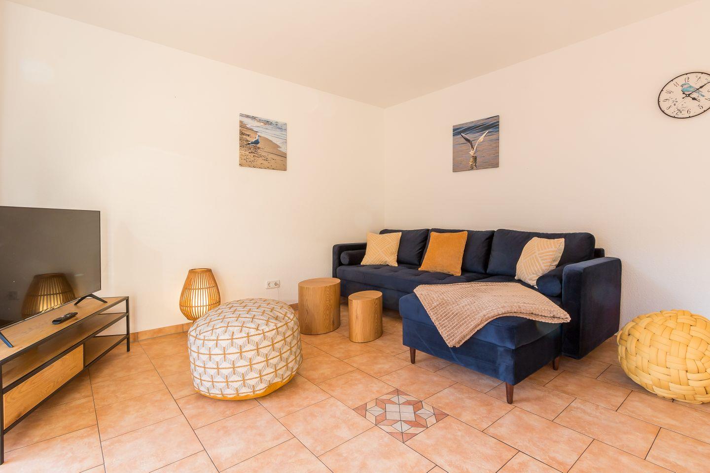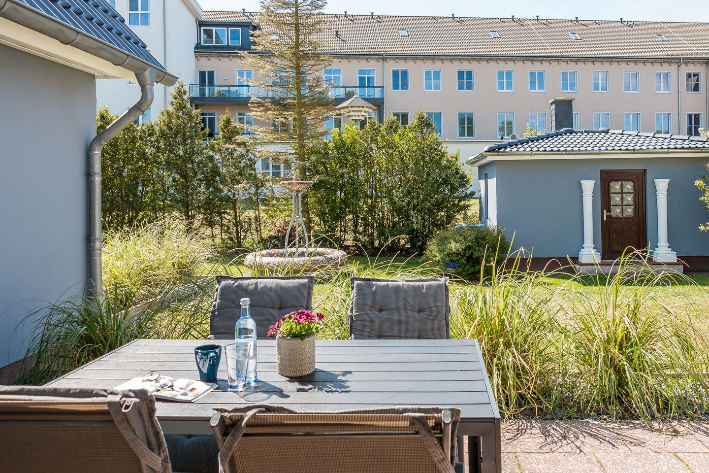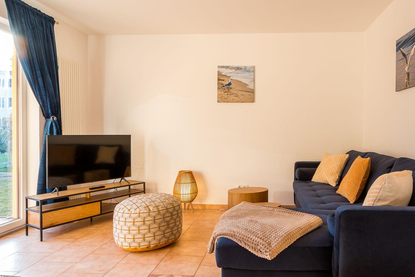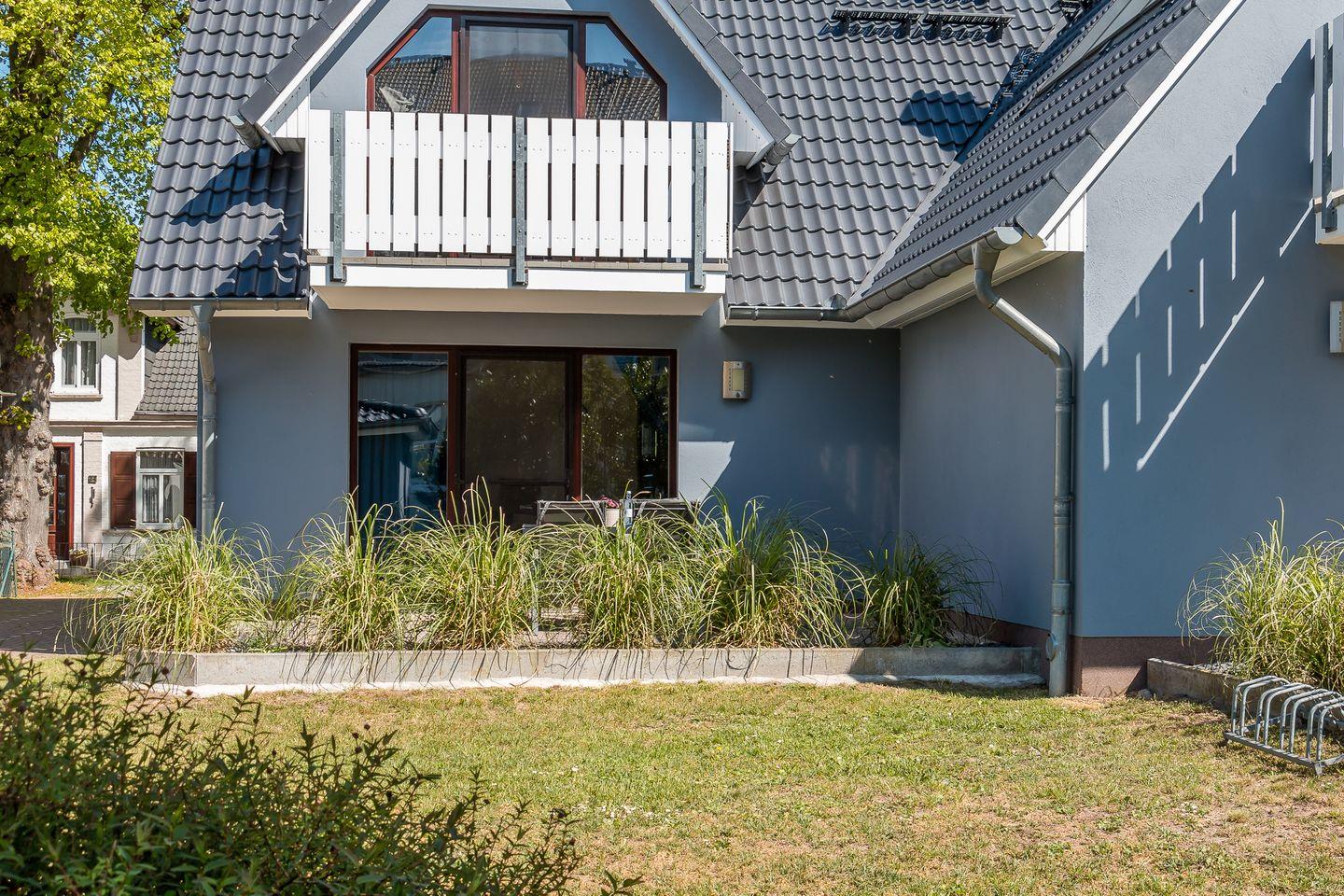 Eine kleine Terrasse gehört ebenfalls zur Ferienunterkunft und kann vom Wohnbereich betreten werden. Hier kannst du deinen Urlaubstag bei einem sonnigen Frühstück starten oder am Abend ausklingen lassen. Auf dem 650 Quadratmeter großen Grundstück mit kleiner Rasenfläche befindet sich eine Sitzbank. In dem Nebengebäude steht ein Grill für alle Feriengäste des Hauses zur Verfügung. Ein Pkw-Stellplatz je Wohnung steht zur Verfügung.