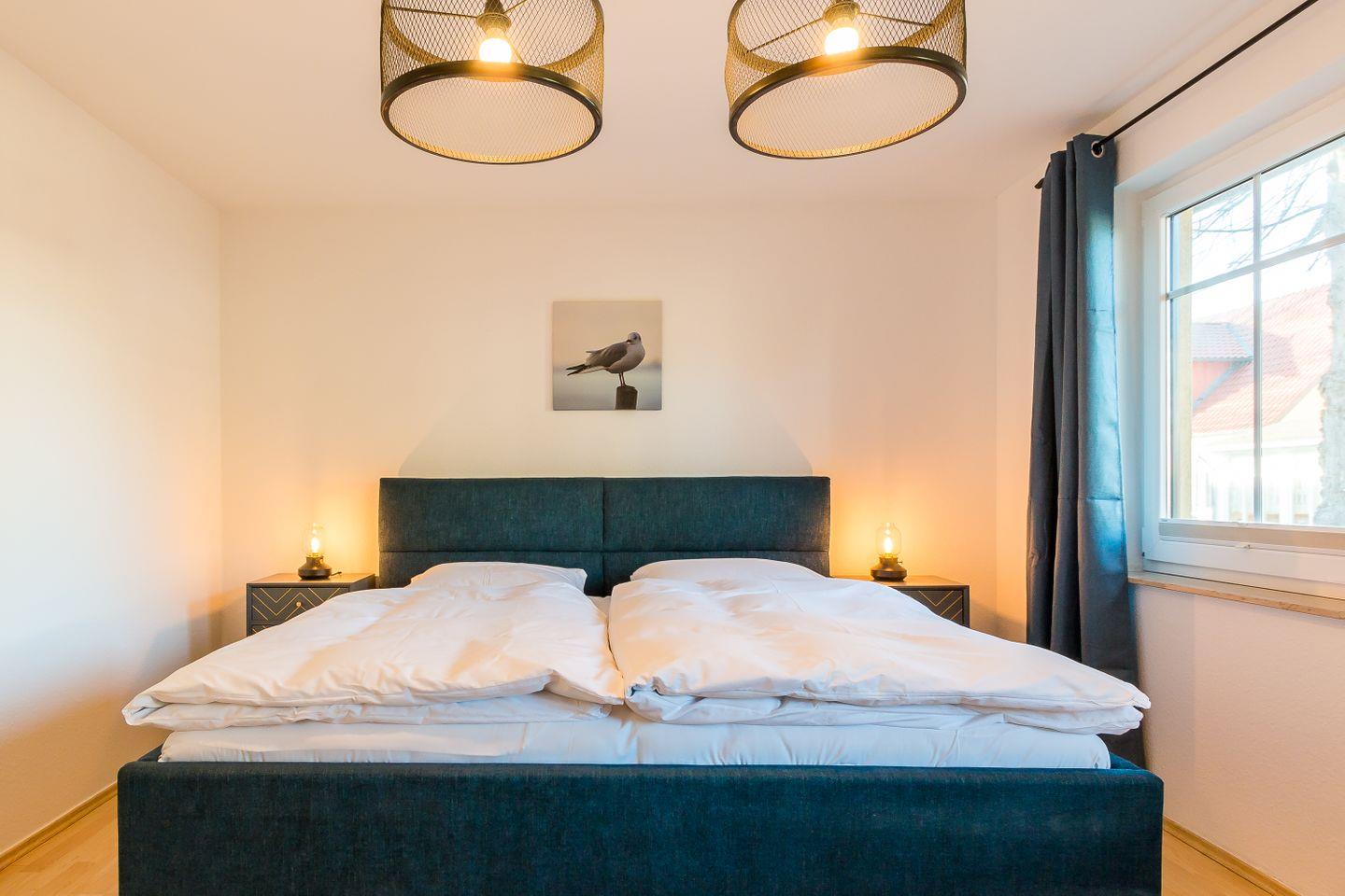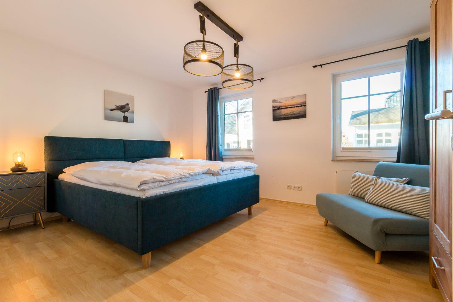 Durch einen kleinen Flur betrittst du die Erdgeschosswohnung. Hier erwartet dich ein großzügiger Wohn- und Küchenbereich. Dank der gemütlichen Sofalandschaft kannst du hier herrlich klönen, während es aus dem Kaminofen knistert. Das Sofa kann als Aufbettung für ein bis zwei Personen genutzt werden. Die Küchenzeile und der Esstisch an bodentiefen Fenstern sind ebenfalls im Wohnraum integriert. Das separate Schlafzimmer ist mit einem Doppelbett ausgestattet und verspricht entspannte Nächte für einen erholsamen Urlaub. Abgerundet wird die Ferienwohnung mit dem Tageslichtbad, ausgestattet mit Dusche und WC.