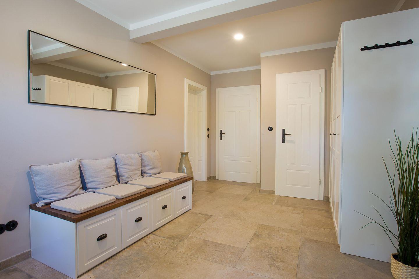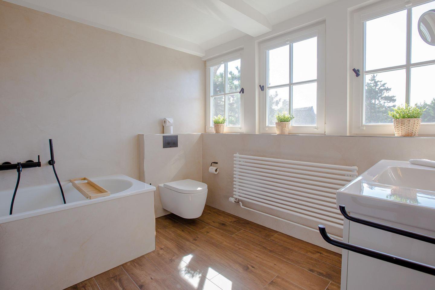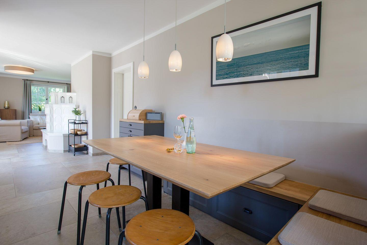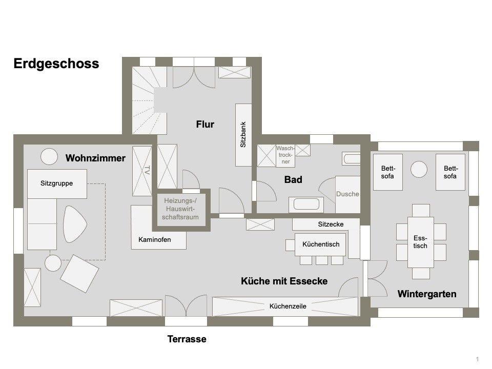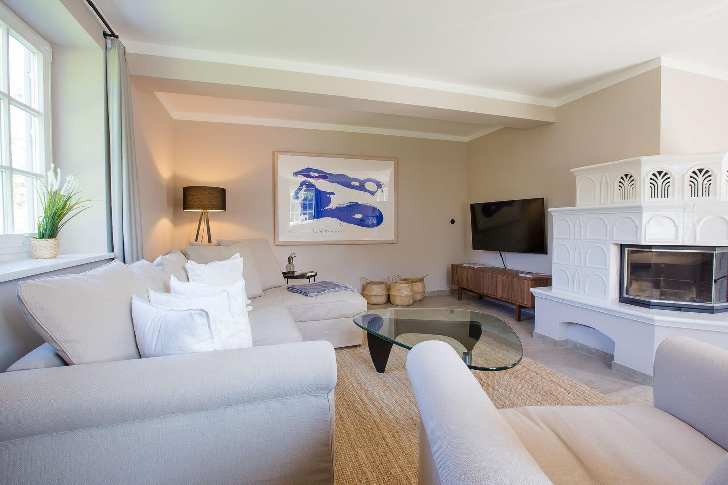 Das anmutige Haus wurde Anfang 2020 luxuriös renoviert und erstrahlt seither in zeitloser Eleganz. Bereits im Eingangsbereich mit Garderobe und Sitzbank sticht der hochwertige, muschelkalkartige Steinboden ins Auge, der sich über das gesamte Erdgeschoss erstreckt, an kälteren Tagen wohlig temperiert durch eine Fußbodenheizung. Vom Eingangsbereich gelangst du in den stilvollen Wohnbereich, der nach rechts in das großzügige Wohnzimmer mit Kaminofen, Sofalandschaft und großem Flachbild-TV übergeht, nach links in die mit Miele-Einbaugeräten vollausgestattete Küche inklusive gemütlicher Essecke. Für die elegante Wohnatmosphäre sorgt ein durchgängiges Farbkonzept, das seinen Höhepunkt im lichtdurchfluteten Wintergarten findet, der nur durch ein Loftfenster von der Küche getrennt ist. Hier erwartet dich ein massiver, ausziehbarer Esstisch, der für ein ausgiebiges Brunch ebenso geeignet ist wie für lange gesellige Abende. Alternativ bietet der komplett verdunkelbare Wintergarten eine Aufbettungsmöglichkeit für zwei Personen in Form zweier Lounge-Bettsofas. Ebenfalls im Erdgeschoss befindet sich ein luxuriöses Bad, in dem sich fugenloses Marmor-Steinzeug über die gesamte Wandhöhe erstreckt und eine Fußbodenheizung für behagliche Wärme sorgt. Hinter einem Einbauschrank versteckt sich ein Miele-Waschtrockner.