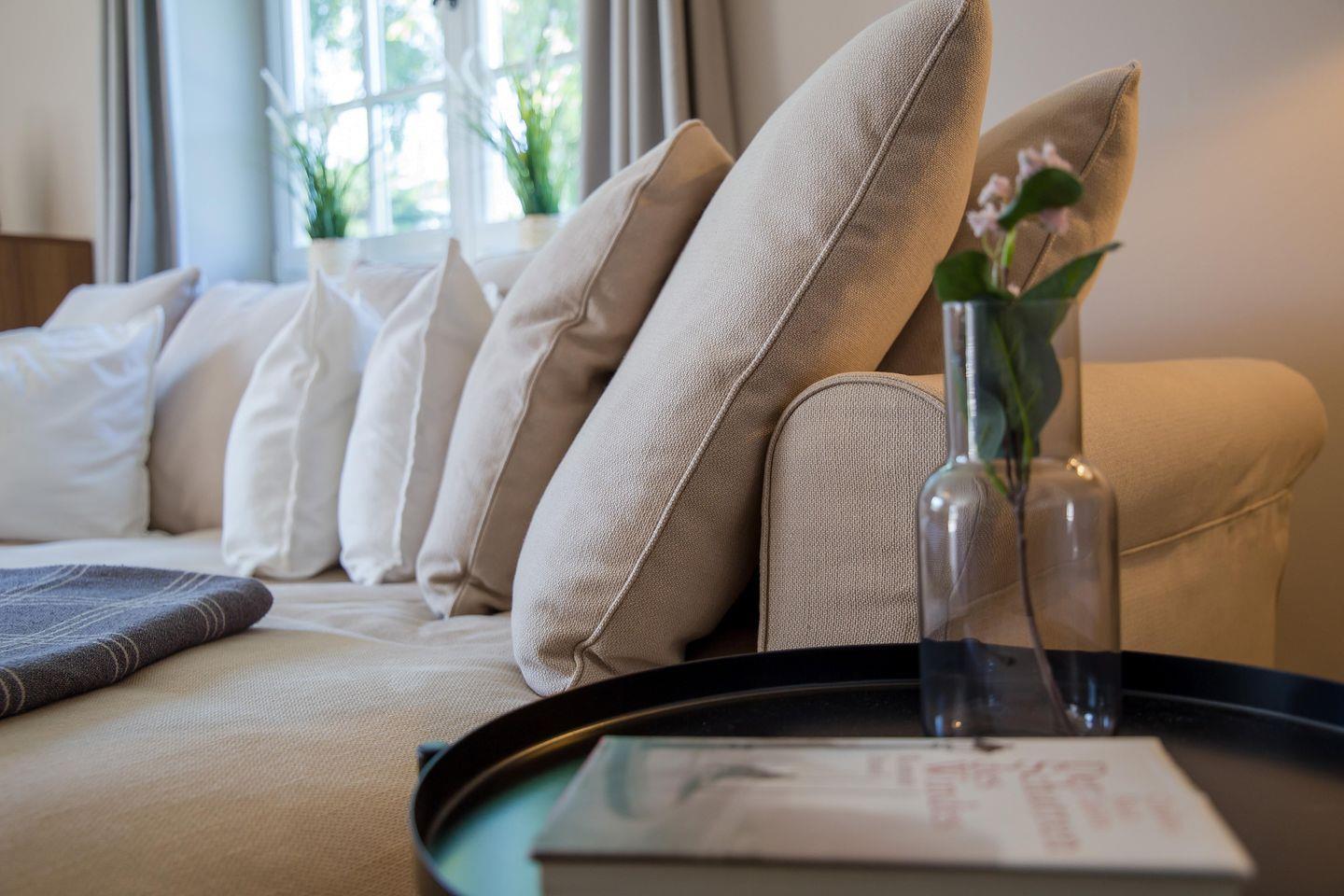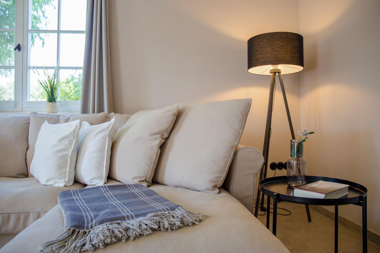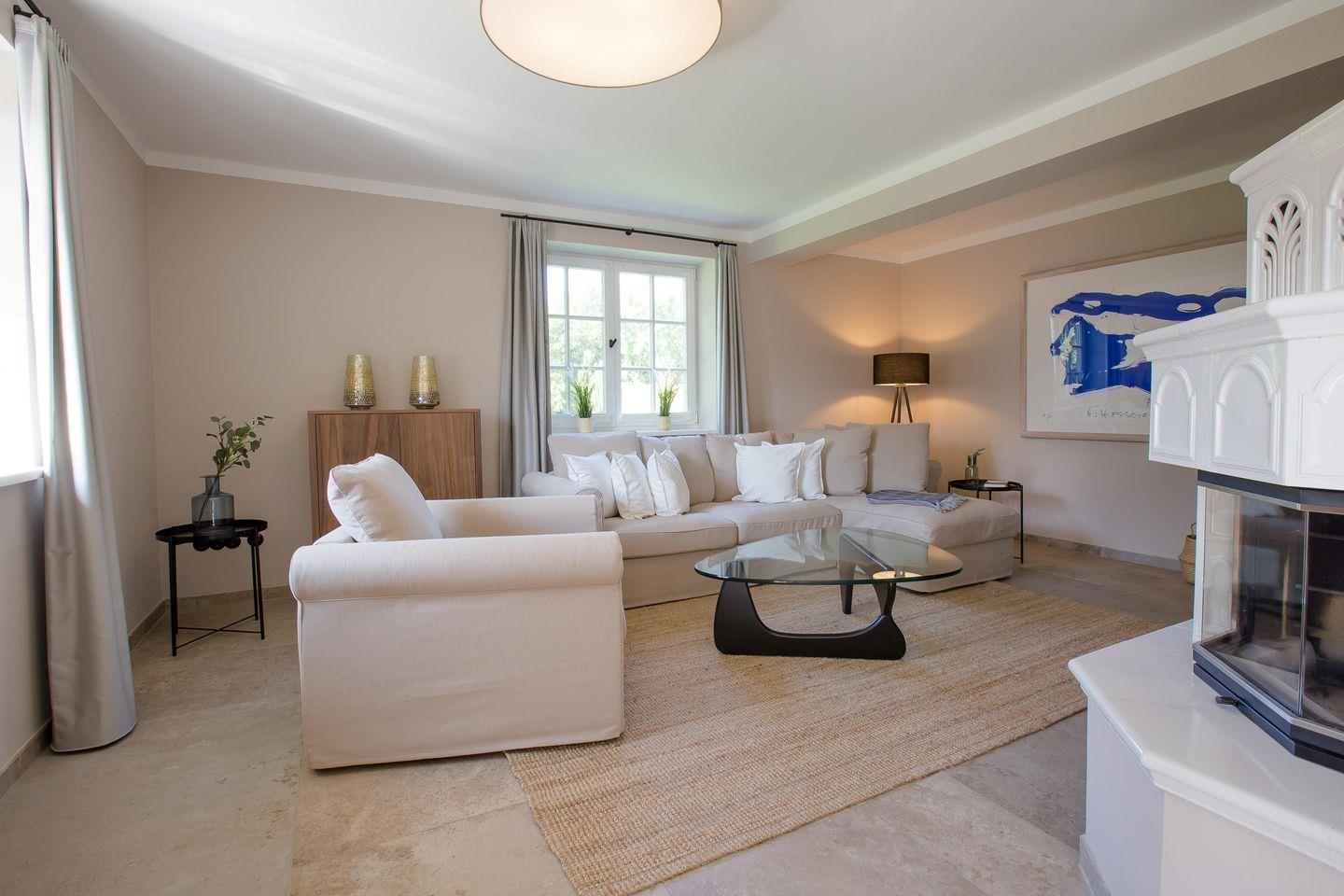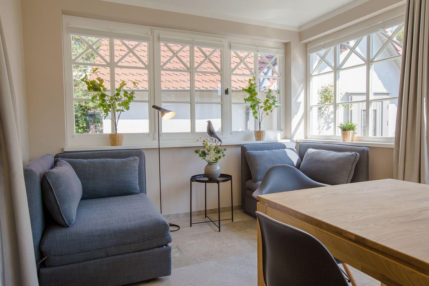 Das anmutige Haus wurde Anfang 2020 luxuriös renoviert und erstrahlt seither in zeitloser Eleganz. Bereits im Eingangsbereich mit Garderobe und Sitzbank sticht der hochwertige, muschelkalkartige Steinboden ins Auge, der sich über das gesamte Erdgeschoss erstreckt, an kälteren Tagen wohlig temperiert durch eine Fußbodenheizung. Vom Eingangsbereich gelangst du in den stilvollen Wohnbereich, der nach rechts in das großzügige Wohnzimmer mit Kaminofen, Sofalandschaft und großem Flachbild-TV übergeht, nach links in die mit Miele-Einbaugeräten vollausgestattete Küche inklusive gemütlicher Essecke. Für die elegante Wohnatmosphäre sorgt ein durchgängiges Farbkonzept, das seinen Höhepunkt im lichtdurchfluteten Wintergarten findet, der nur durch ein Loftfenster von der Küche getrennt ist. Hier erwartet dich ein massiver, ausziehbarer Esstisch, der für ein ausgiebiges Brunch ebenso geeignet ist wie für lange gesellige Abende. Alternativ bietet der komplett verdunkelbare Wintergarten eine Aufbettungsmöglichkeit für zwei Personen in Form zweier Lounge-Bettsofas. Ebenfalls im Erdgeschoss befindet sich ein luxuriöses Bad, in dem sich fugenloses Marmor-Steinzeug über die gesamte Wandhöhe erstreckt und eine Fußbodenheizung für behagliche Wärme sorgt. Hinter einem Einbauschrank versteckt sich ein Miele-Waschtrockner.