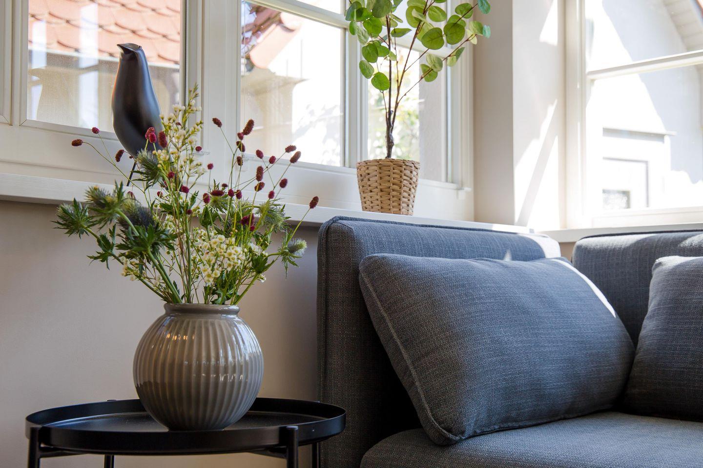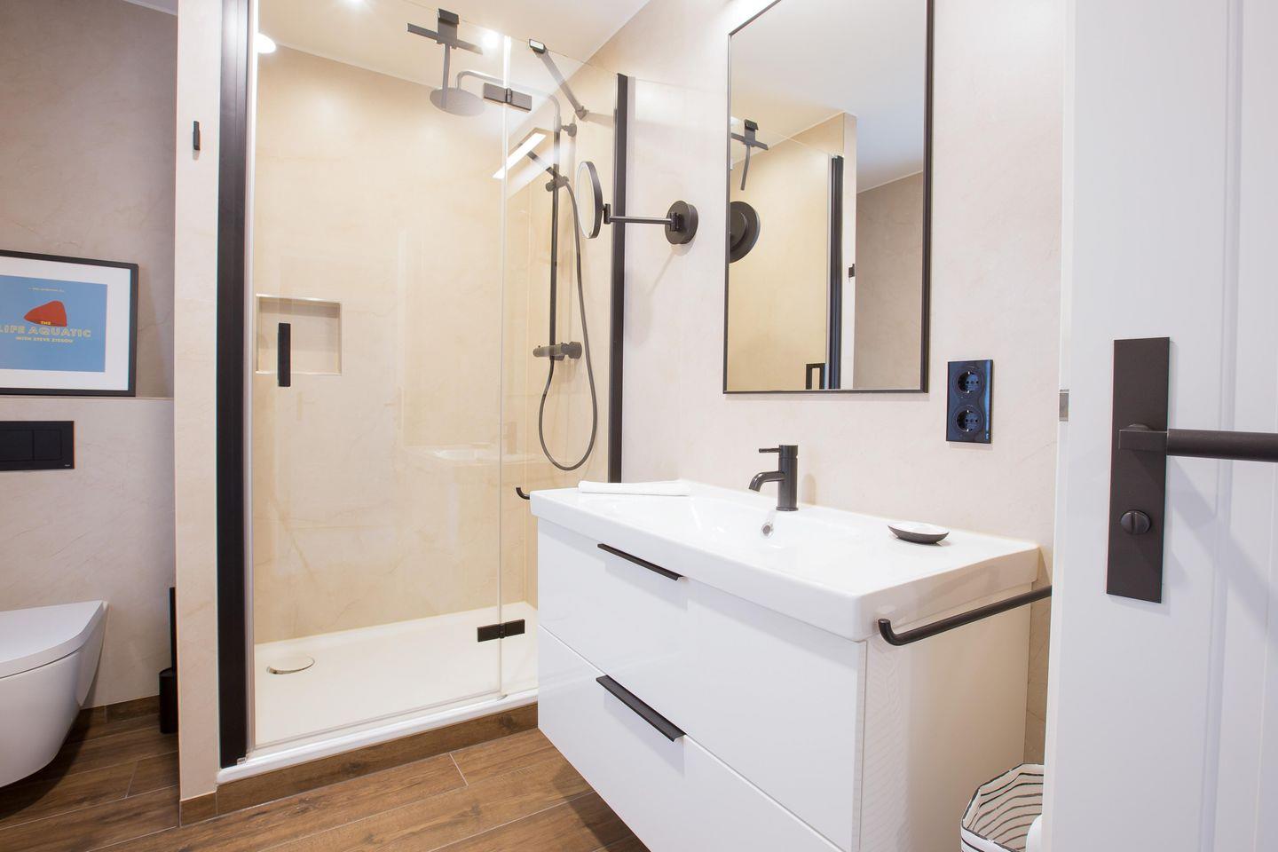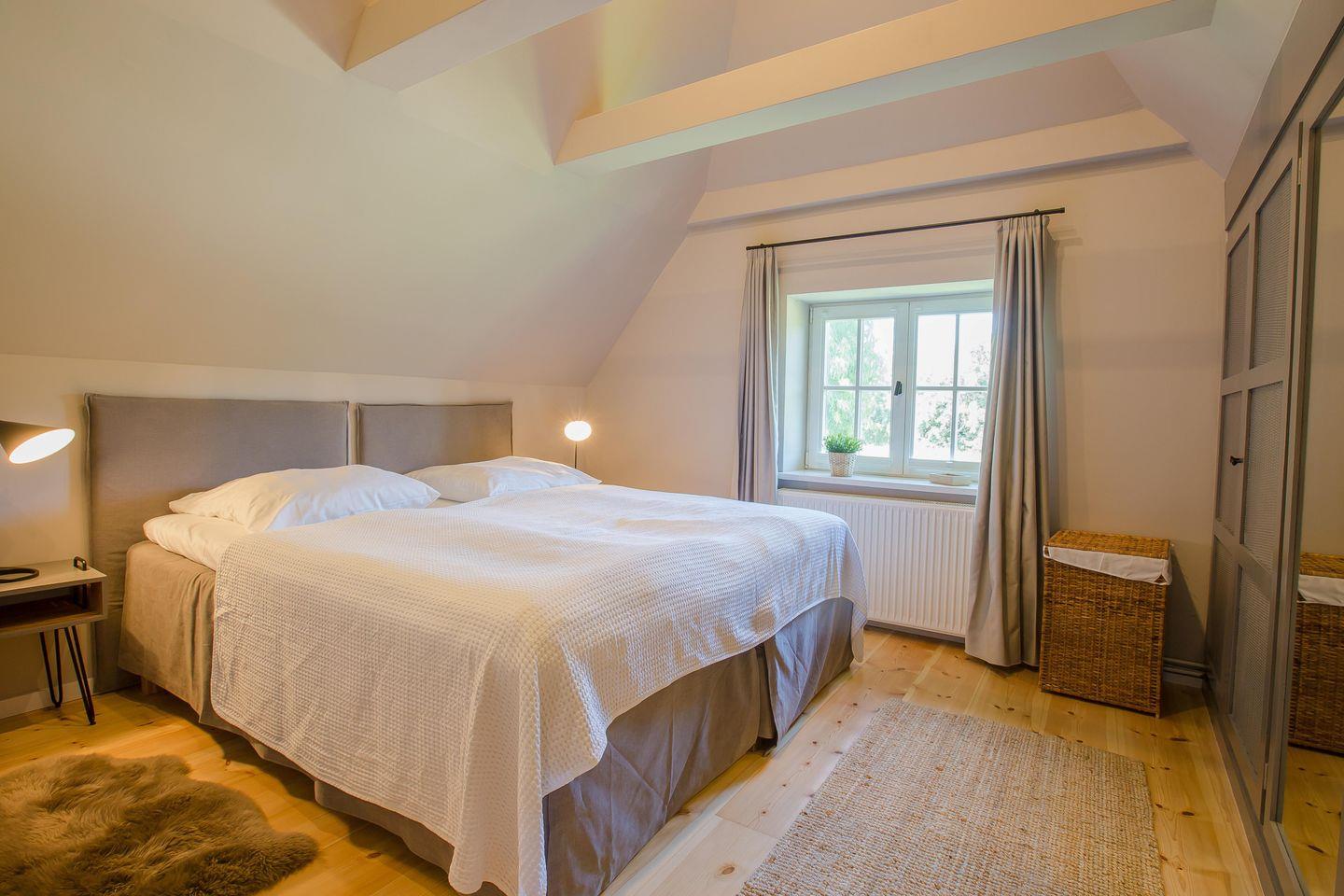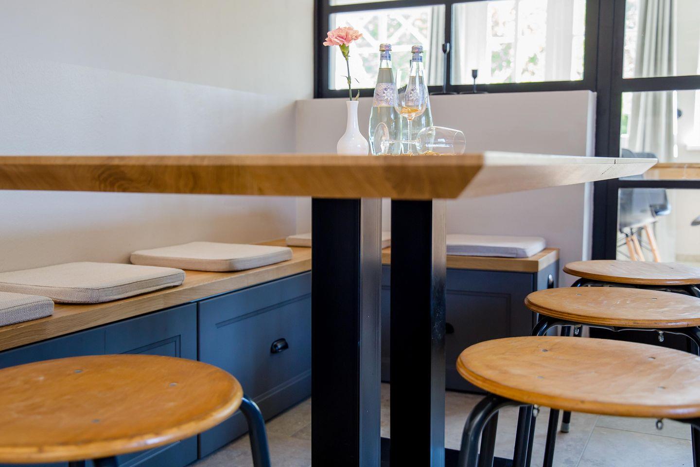 Das anmutige Haus wurde Anfang 2020 luxuriös renoviert und erstrahlt seither in zeitloser Eleganz. Bereits im Eingangsbereich mit Garderobe und Sitzbank sticht der hochwertige, muschelkalkartige Steinboden ins Auge, der sich über das gesamte Erdgeschoss erstreckt, an kälteren Tagen wohlig temperiert durch eine Fußbodenheizung. Vom Eingangsbereich gelangst du in den stilvollen Wohnbereich, der nach rechts in das großzügige Wohnzimmer mit Kaminofen, Sofalandschaft und großem Flachbild-TV übergeht, nach links in die mit Miele-Einbaugeräten vollausgestattete Küche inklusive gemütlicher Essecke. Für die elegante Wohnatmosphäre sorgt ein durchgängiges Farbkonzept, das seinen Höhepunkt im lichtdurchfluteten Wintergarten findet, der nur durch ein Loftfenster von der Küche getrennt ist. Hier erwartet dich ein massiver, ausziehbarer Esstisch, der für ein ausgiebiges Brunch ebenso geeignet ist wie für lange gesellige Abende. Alternativ bietet der komplett verdunkelbare Wintergarten eine Aufbettungsmöglichkeit für zwei Personen in Form zweier Lounge-Bettsofas. Ebenfalls im Erdgeschoss befindet sich ein luxuriöses Bad, in dem sich fugenloses Marmor-Steinzeug über die gesamte Wandhöhe erstreckt und eine Fußbodenheizung für behagliche Wärme sorgt. Hinter einem Einbauschrank versteckt sich ein Miele-Waschtrockner.