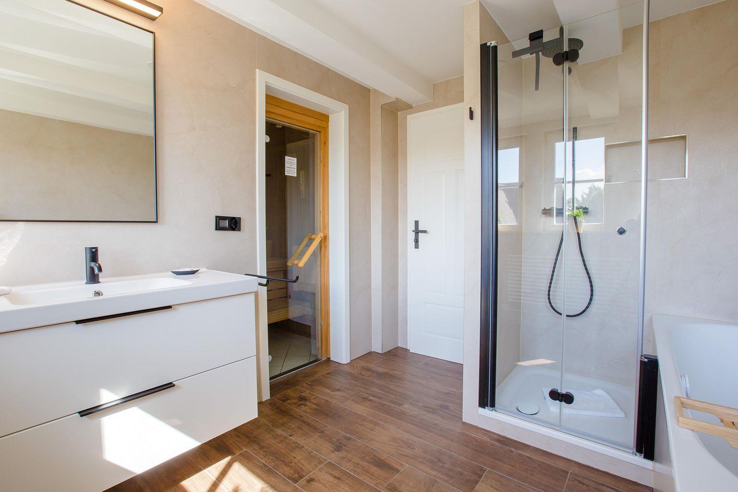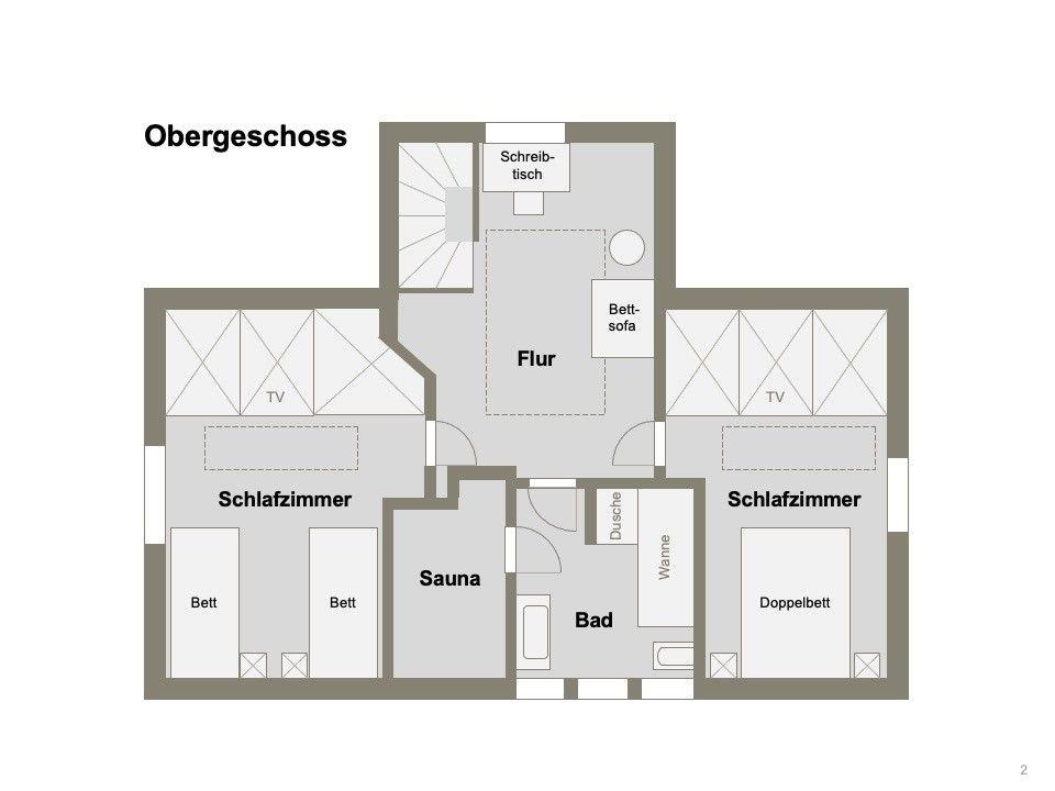 Über eine Holztreppe gelangst du ins Obergeschoss. Hier befindet sich eine weiträumige Galerie, die zum Verweilen und Entspannen oder auch zum Studieren einlädt. Die beiden Schlafzimmer, die jeweils mit hochwertigen Einbauschränken, großen Spiegeltüren und integrierten Flachbild-TVs ausgestattet sind, erreichst du von der Galerie aus. Links findest du ein Boxspring-Doppelbett, rechts zwei Boxspring-Einzelbetten, die bei Bedarf zu einem Doppelbett verbunden werden können. Ein zweites, ebenfalls fußbodenbeheiztes Badezimmer mit Badewanne, Dusche und WC sowie angeschlossenem Saunarium runden das Obergeschoss für den perfekten Urlaub ab.