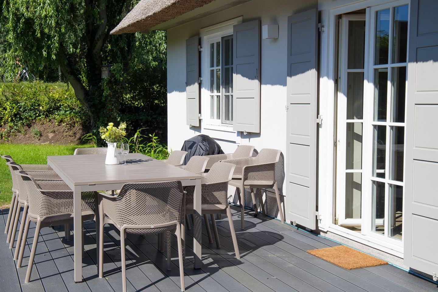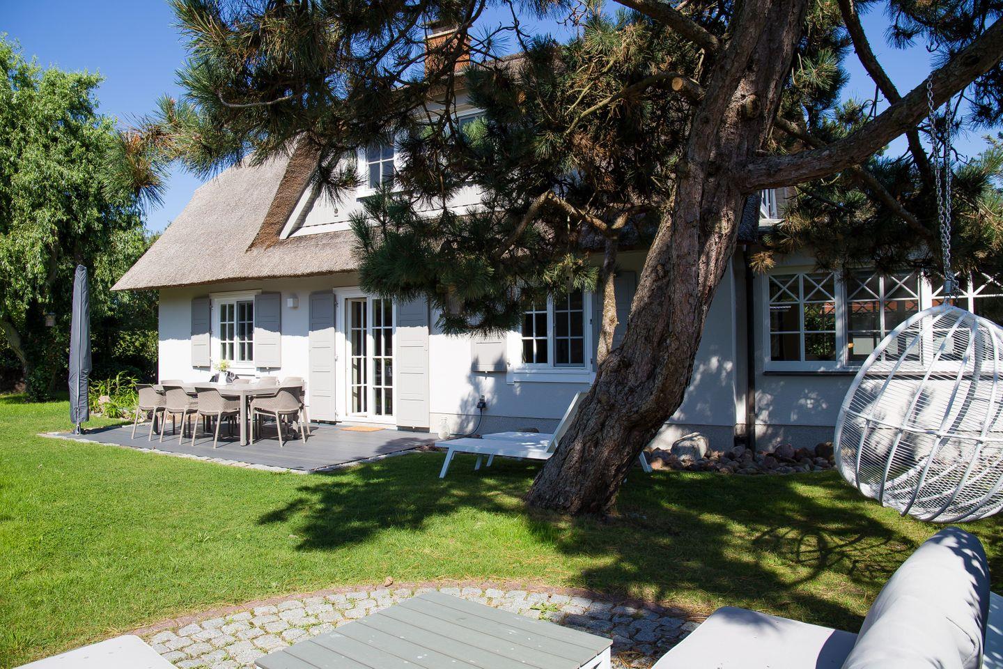Der Außenbereich begeistert mit einem 650 Quadratmeter großen Grundstück. Der wunderschöne Garten ist vollständig mit Sträuchern und Hecken eingefriedet und bietet sich daher auch perfekt für einen Urlaub mit Hund an. Direkt an das Haus grenzt eine großzügige Terrasse mit überdimensionalem Sonnenschirm und ausziehbarem Esstisch an, die ganztägig vom warmen Sonnenlicht der Ostsee beschienen wird. Hier steht auch ein Elektro-Grill bereit. Unter einer malerischen Kiefer finden sich außerdem eine elegante Lounge-Sofa-Ecke, ein Hängesessel sowie zwei Sonnenliegen für entspannte Momente zum "Chillen", ebenfalls eingebunden in das stimmige Farbkonzept des Hauses. Hier genießt du die Ruhe und hast Abstand vom Alltagsgeschehen. Ein großzügiger Stellplatz für bis zu zwei PKWs und eine Ladestation für E-Autos stehen dir kostenfrei zur Verfügung.