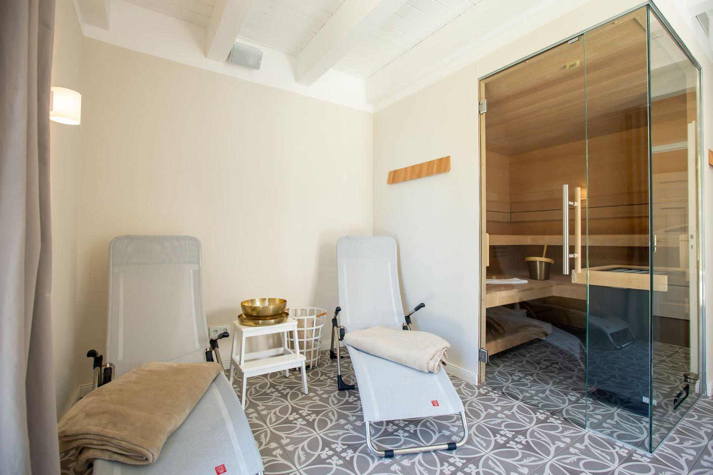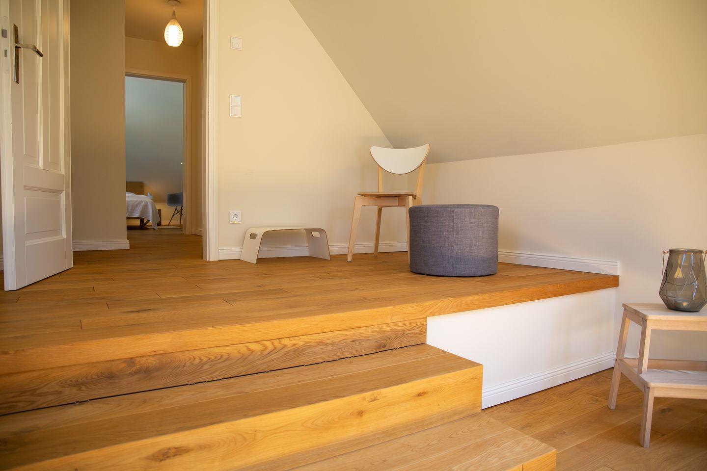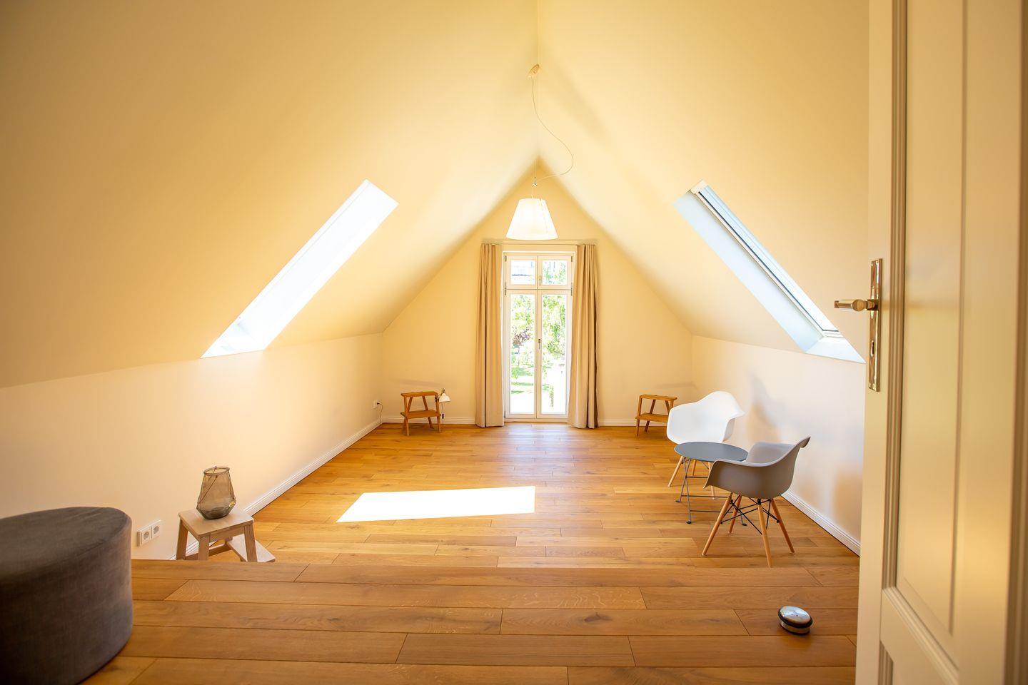 Abgerundet wird dieses wundervolle Urlaubs-Ensemble mit dem Multifunktionsraum, der sich ganz nach Belieben für Yoga, Gruppenarbeit, Coaching, Meditation oder als zusätzlicher Schlafraum (zwei Hotelzustellbetten) nutzen lässt. Insgesamt lassen sich bis zu vier hochwertige Aufbettungen im Gibelzimmer aufstellen, so dass bei Bedarf, dass Haus bis max. 12 Personen genutzt werden kann.