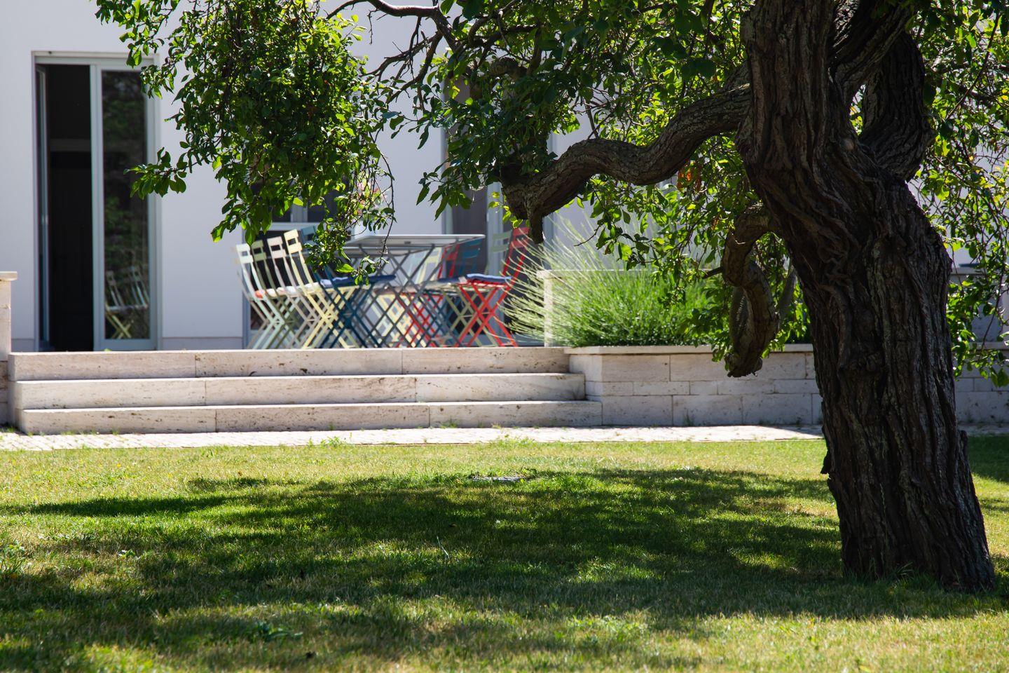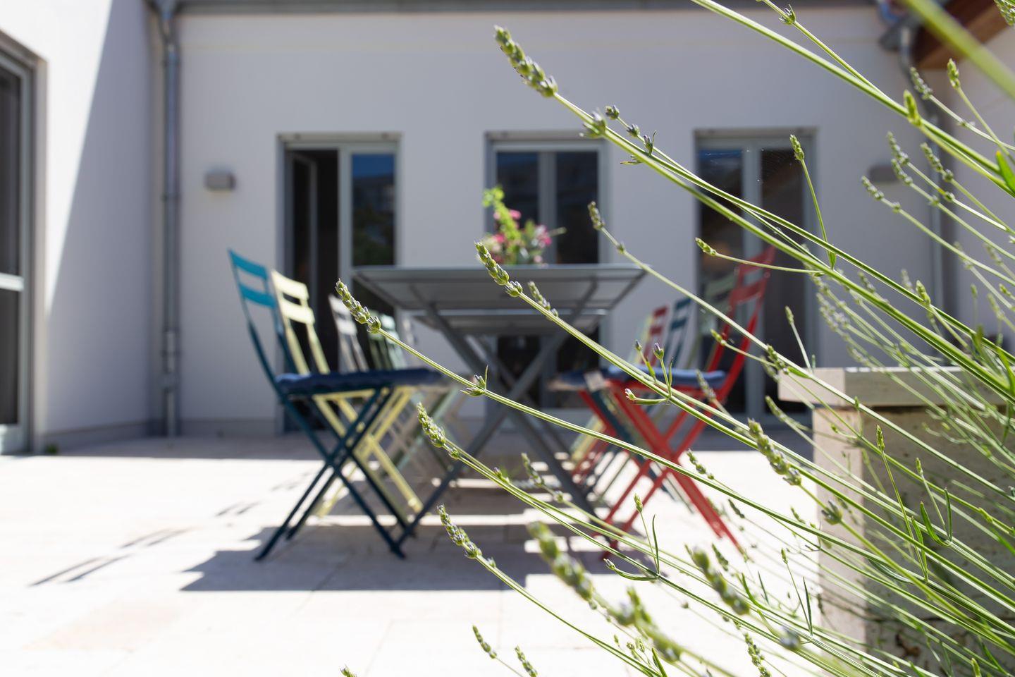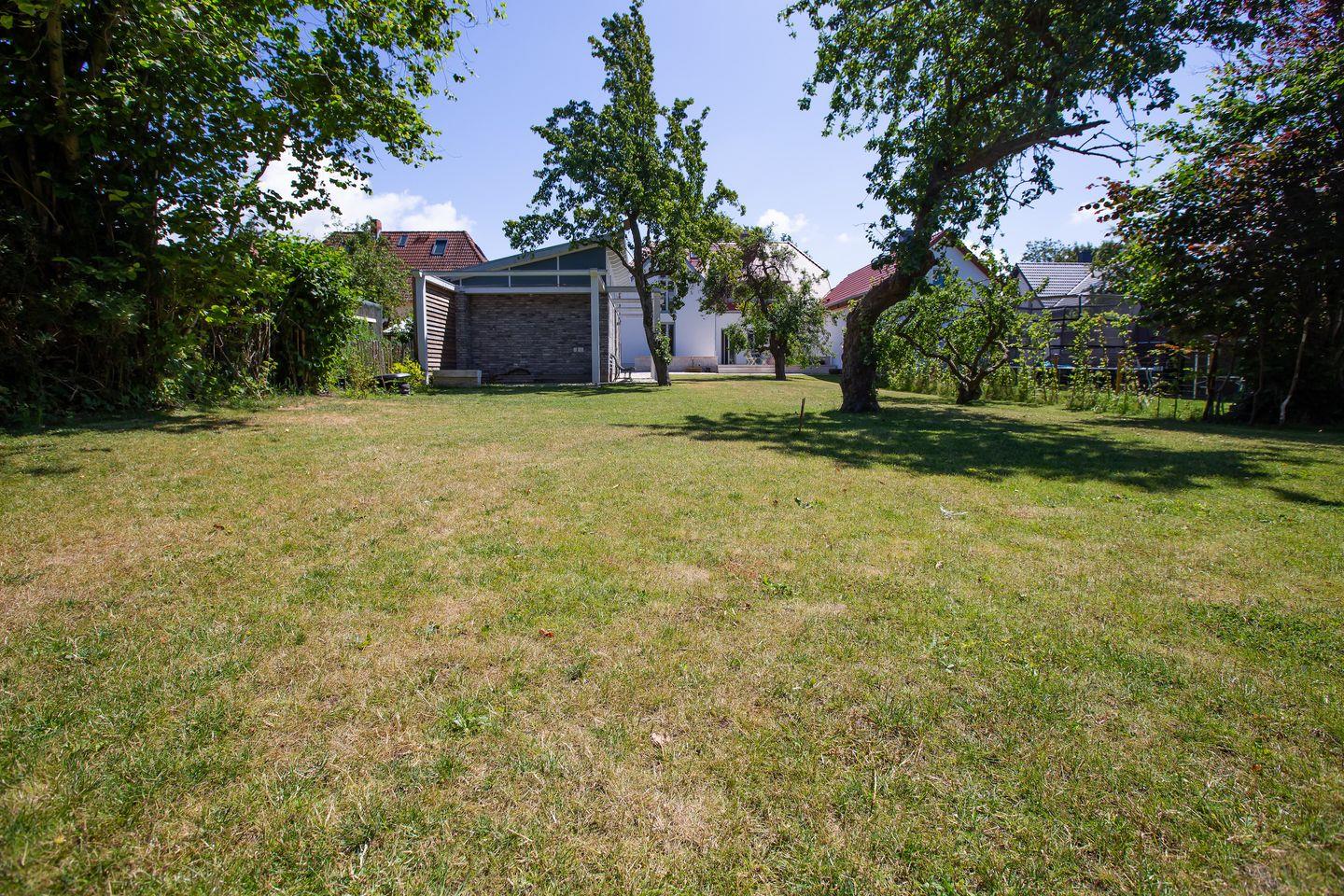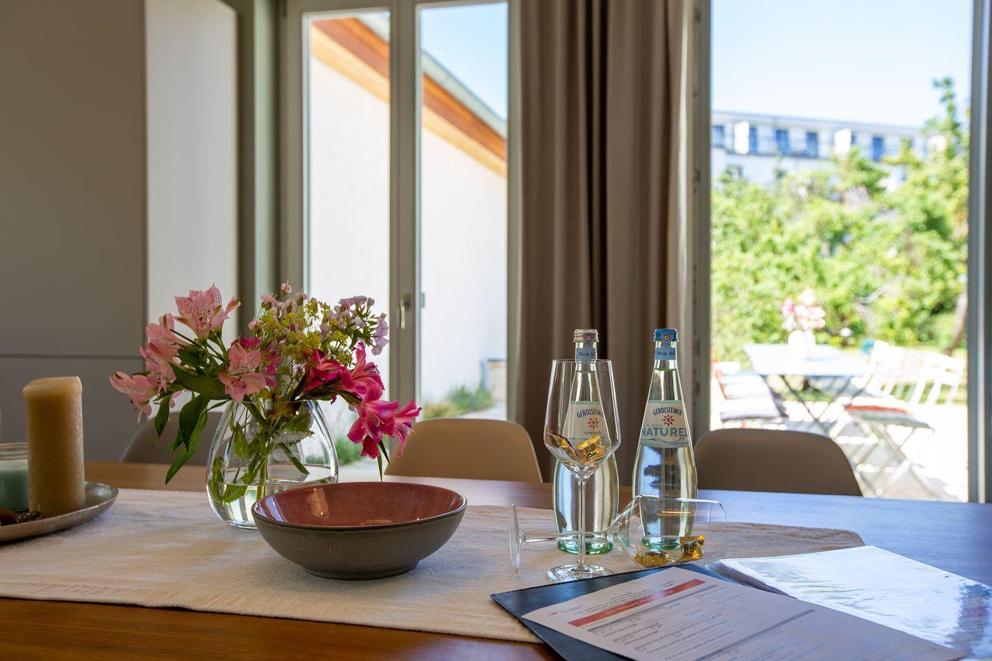 Der Außenbereich wird durch eine große Steinterrasse mit Bestuhlung ergänzt. Von hieraus genießt man einen tollen Blick in den Garten. Vor allem an wärmeren Tagen lädt der mit Lavendel und Gräsern bepflanzte Outdoor-Bereich zum geselligen Essen, Relaxen und Miteinander ein. Des Weiteren gehören zum Ferienhaus vier PKW-Stellplätze, abschließbare Fahrradstellplätze im Gartenhaus, ein Weber-Holzkohlegrill und ein Bollerwagen, in dem die Strandsachen gemütlich transportiert werden können.