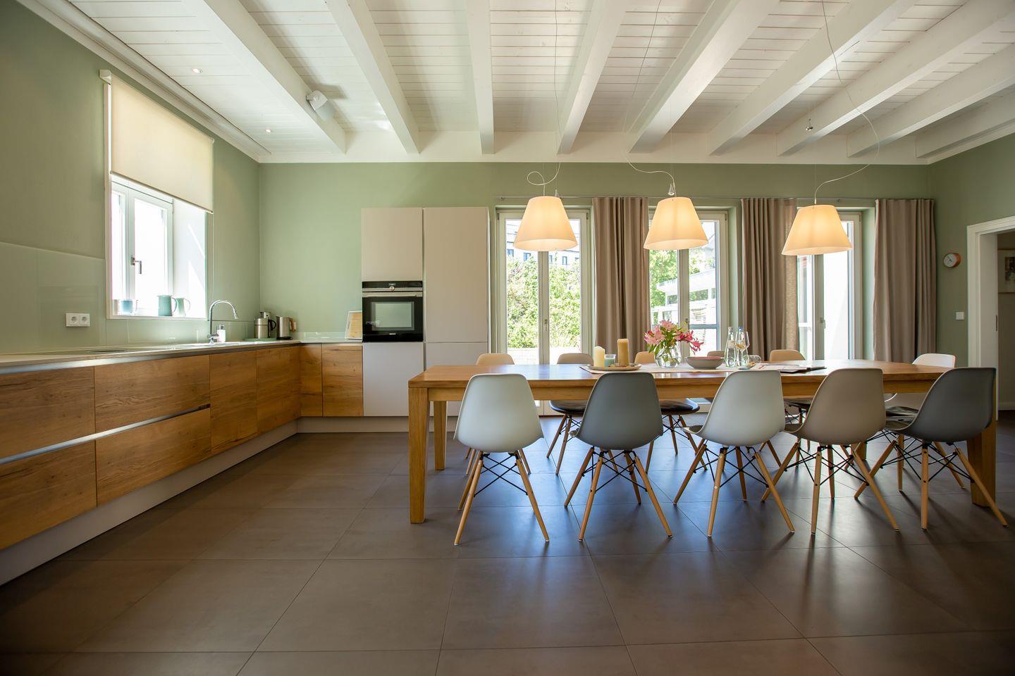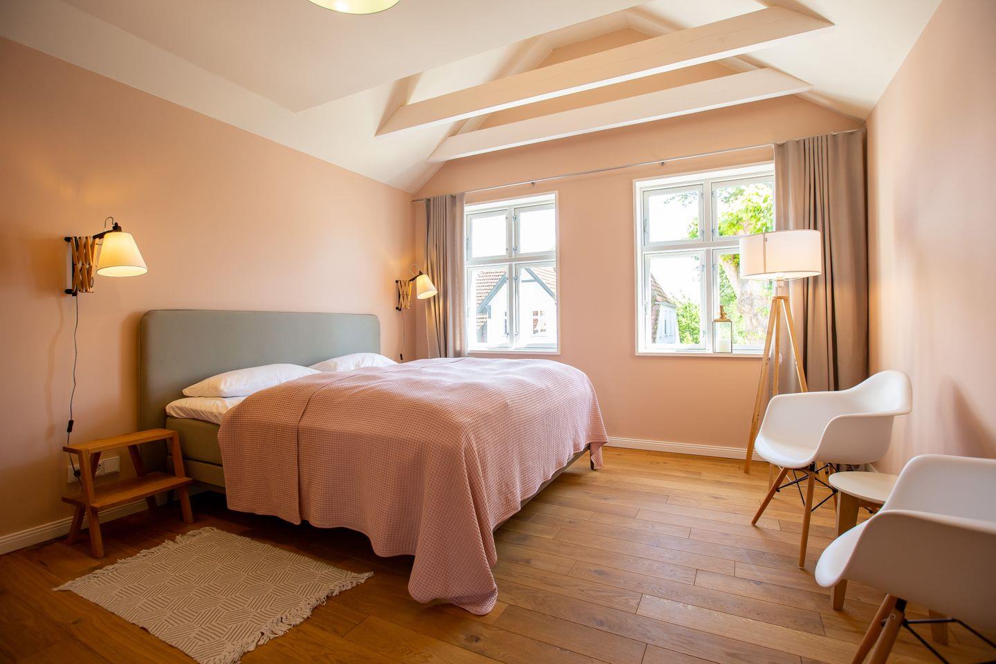 Mit viel Gefühl für die alte Baukultur und Liebe zum Detail wurde das ehemalige Kapitänshaus meisterhaft saniert und restauriert. Herausgekommen ist ein traumhaft schönes Ferienhaus, in dem sowohl die Familie als auch Freunde oder eine Gruppe ausreichend Platz für erholsame Urlaubstage finden. Mittelpunkt des Hauses ist die großzügige und vollausgestattete Küche mit Kamin und Austritt auf die sonnige Terrasse. Hier lässt es sich nach Herzenslust Kochen und Klönen. Das Wohnzimmer mit gemütlicher Sofalandschaft ist durch eine Flügeltür getrennt. Auch der hauseigene Wellnessbereich befindet sich im Erdgeschoss. Dank großzügiger Sauna, Regendusche und Ruhebereich und separatem WC lässt es sich hier zu jeder Jahreszeit und mit allen Sinnen genießen. Über die Holztreppe im Flur gelangt man zu den vier liebevoll gestalteten Schlafzimmern, die mit je einem Doppelbett ausgestattet sind. Zwei stylische Tageslicht-Bäder sowie eine Leseecke mit kleiner Büchergalerie befinden sich ebenfalls im Obergeschoss.