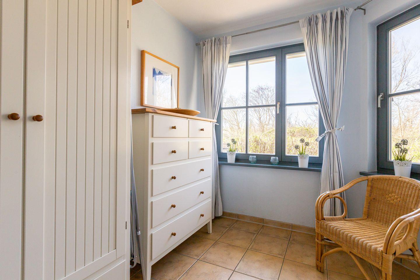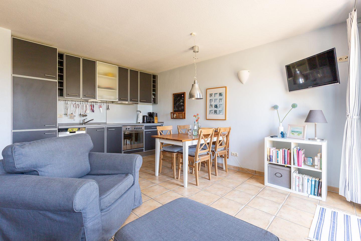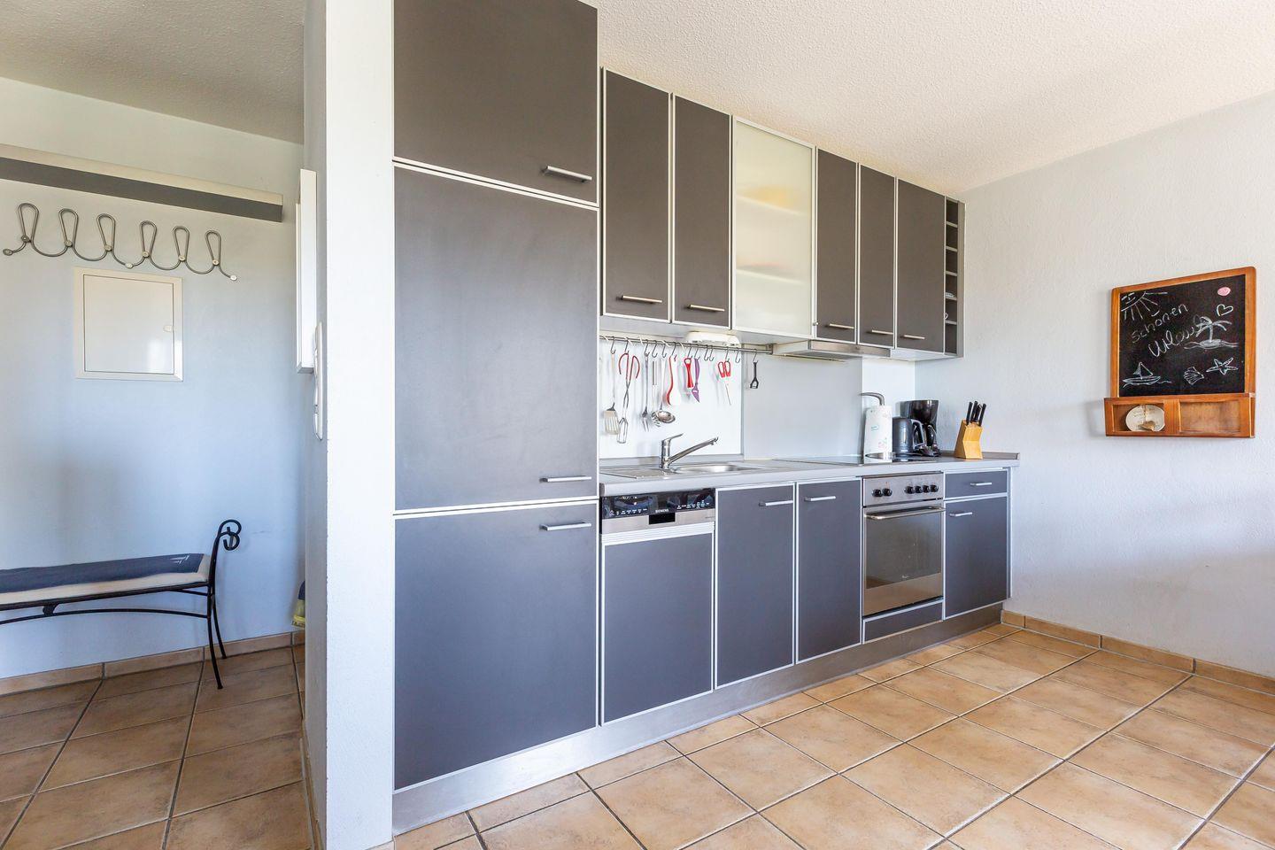 Willkommen in deinem Ostseeurlaub. In der gemütlichen Ferienwohnung wurde das Interieur und die Farben liebevoll im Seaside-Stil gestaltet, passend zum Meer und der strandnahen Umgebung. Das Herzstück der Wohnung ist der offene gestalte Wohn- und Küchenraum. Die Küchenzeile ist vollwertig ausgestattet, so dass du den fangfrischen Fisch nicht nur im Restaurant, sondern auch selbst zubereitet genießen kannst. Und nach einem ausgiebigen Strandtag stehen Sofa und Kamin zum Klönen bereit. Vom Flur gehen beide Schlafzimmer der Wohnung ab - eins mit Doppelbett und eins mit zwei getrennten Betten. Dank je einem Kleiderschrank und einer Kommode bieten die Schlafzimmer genügend Stauraum für deine Sachen. Das großzügige Badezimmer mit Dusche, WC, Fön und Handtuchhalter runden den Wohnkomfort für bis zu vier Personen rundum ab.