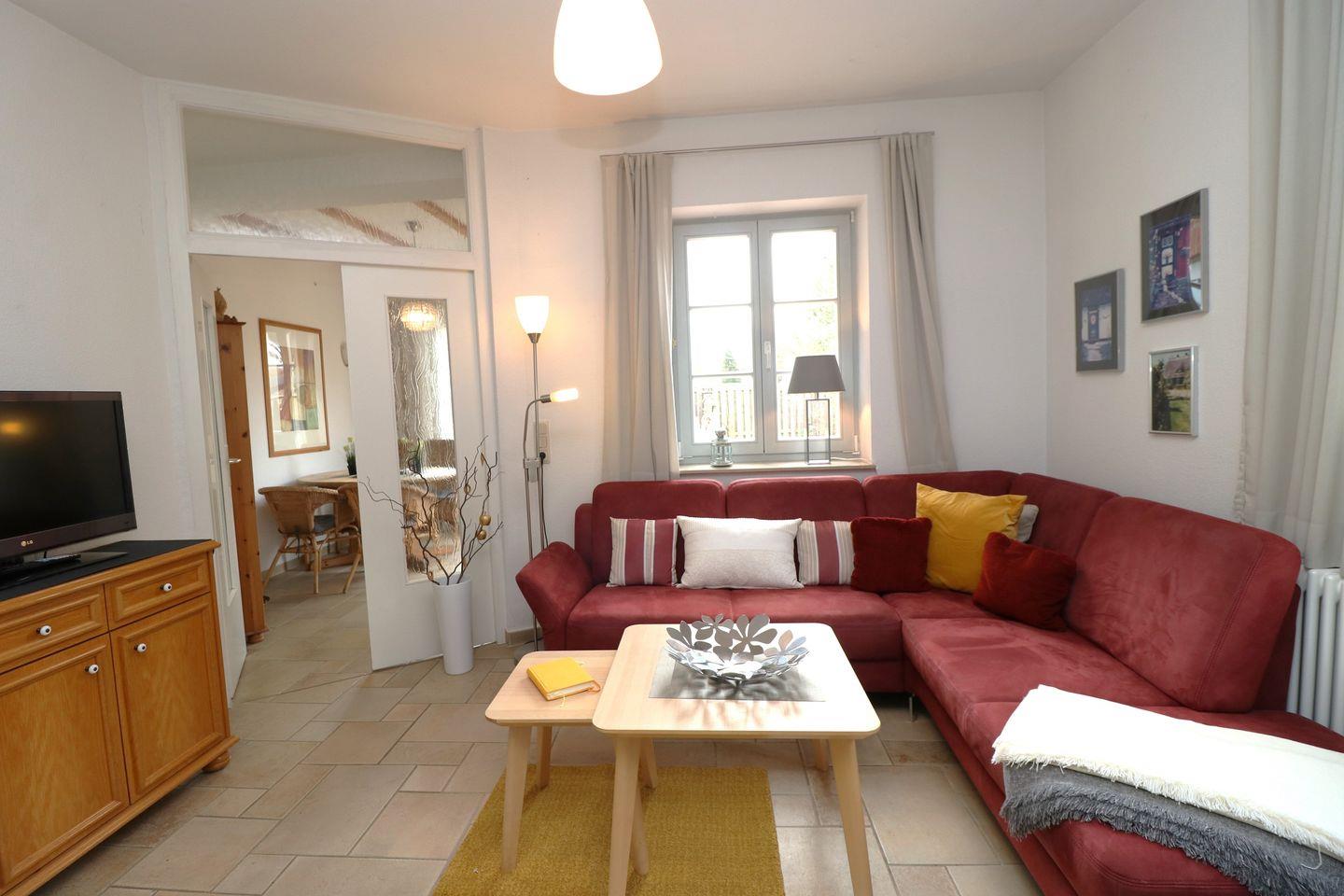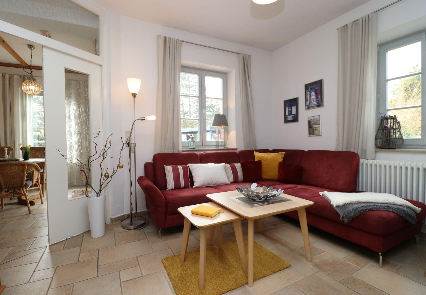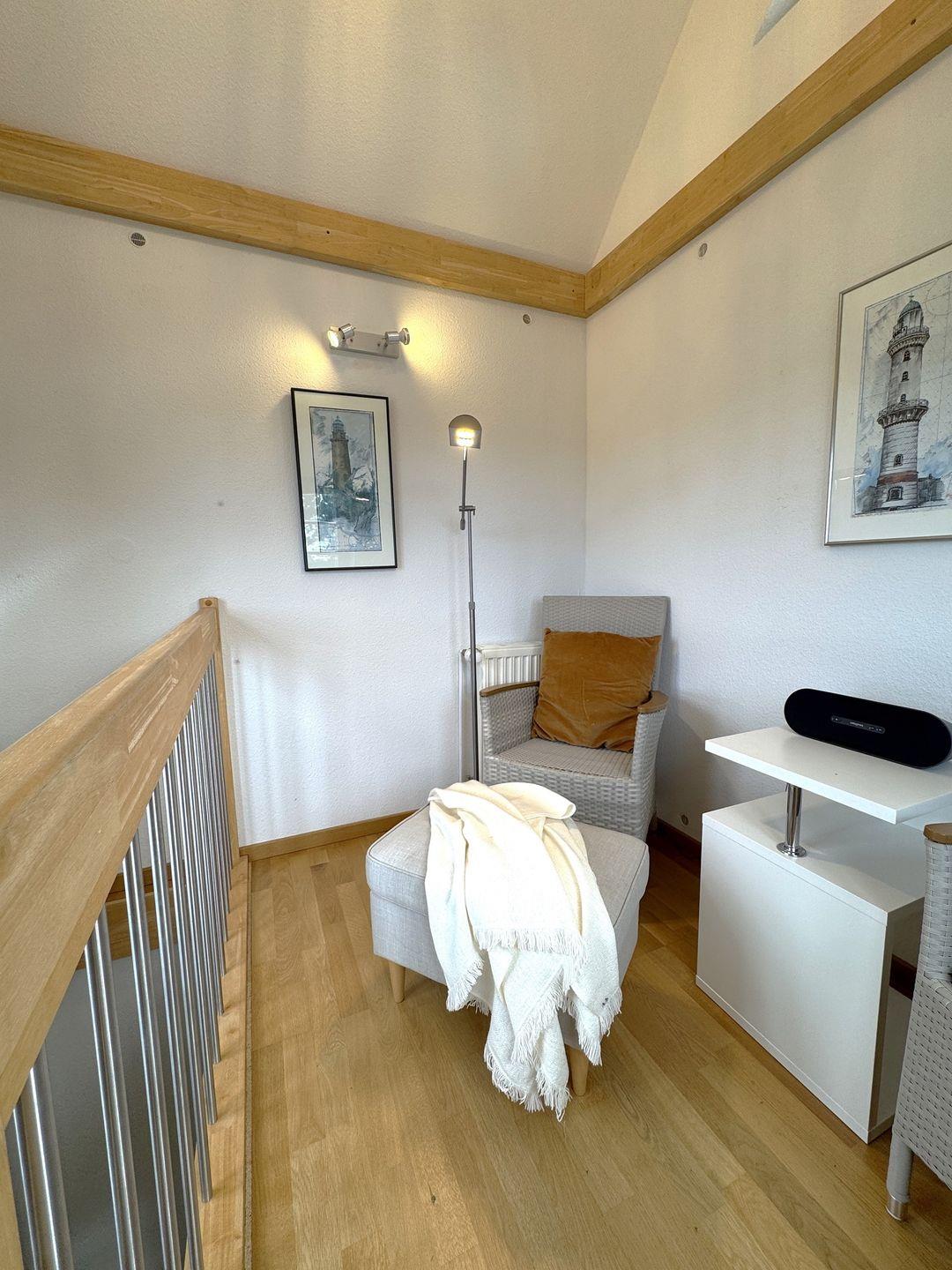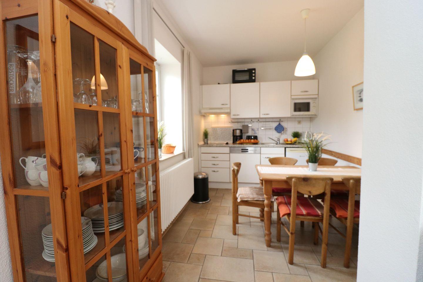 In der „Großen Wohnung“ erwartet Sie ein gemütliches Ambiente, das zum Entspannen einlädt. Die Unterkunft verteilt sich über zwei Etagen und bietet eine ansprechende Raumgestaltung. Im Erdgeschoss finden Sie die offene Küche, die mit modernen Annehmlichkeiten wie einem Herd, Backofen, Kühlschrank, Geschirrspüler und allerhand Küchenutensilien ausgestattet ist. Hier können Sie köstliche Mahlzeiten zubereiten und in geselliger Runde im Essbereich genießen. Im angrenzenden Wohnzimmer mit komfortabler Sofaecke können Sie nach einem erlebnisreichen Tag am Strand entspannen und den Abend bei einem Film auf dem digitalen Sat-TV ausklingen lassen.