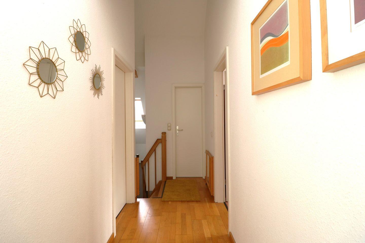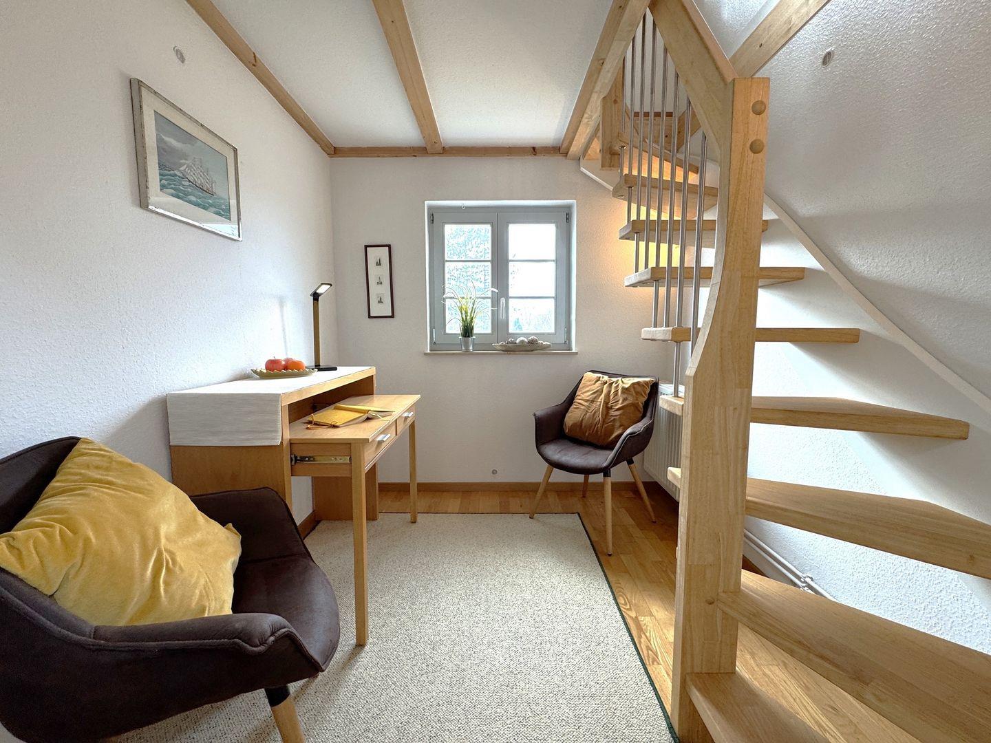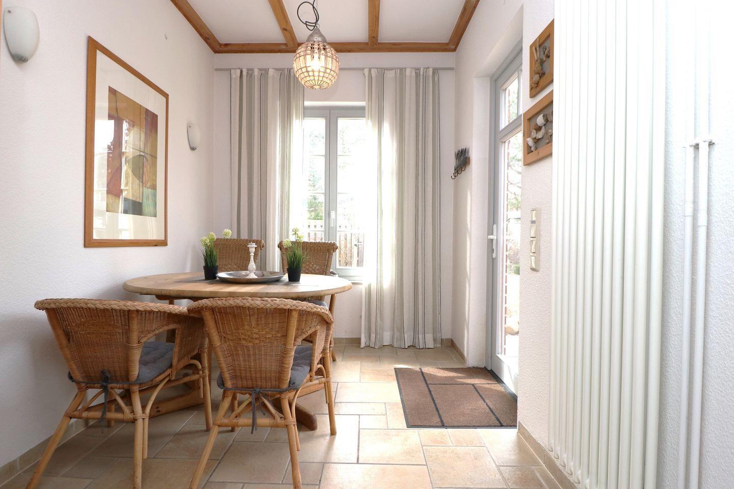 In der „Großen Wohnung“ erwartet Sie ein gemütliches Ambiente, das zum Entspannen einlädt. Die Unterkunft verteilt sich über zwei Etagen und bietet eine ansprechende Raumgestaltung. Im Erdgeschoss finden Sie die offene Küche, die mit modernen Annehmlichkeiten wie einem Herd, Backofen, Kühlschrank, Geschirrspüler und allerhand Küchenutensilien ausgestattet ist. Hier können Sie köstliche Mahlzeiten zubereiten und in geselliger Runde im Essbereich genießen. Im angrenzenden Wohnzimmer mit komfortabler Sofaecke können Sie nach einem erlebnisreichen Tag am Strand entspannen und den Abend bei einem Film auf dem digitalen Sat-TV ausklingen lassen.