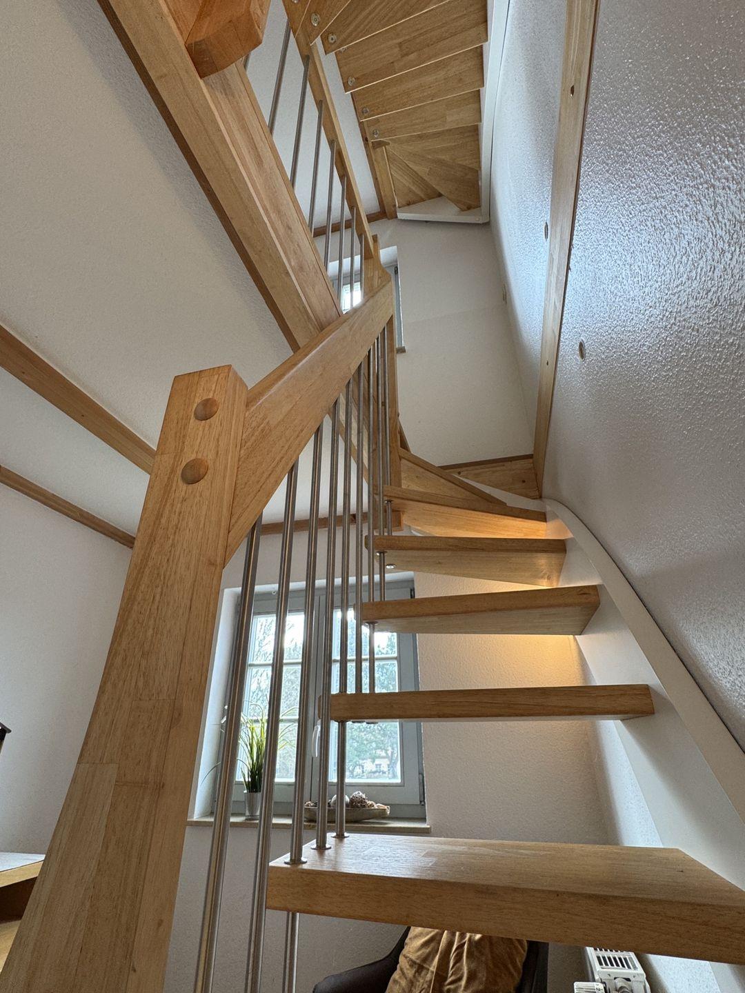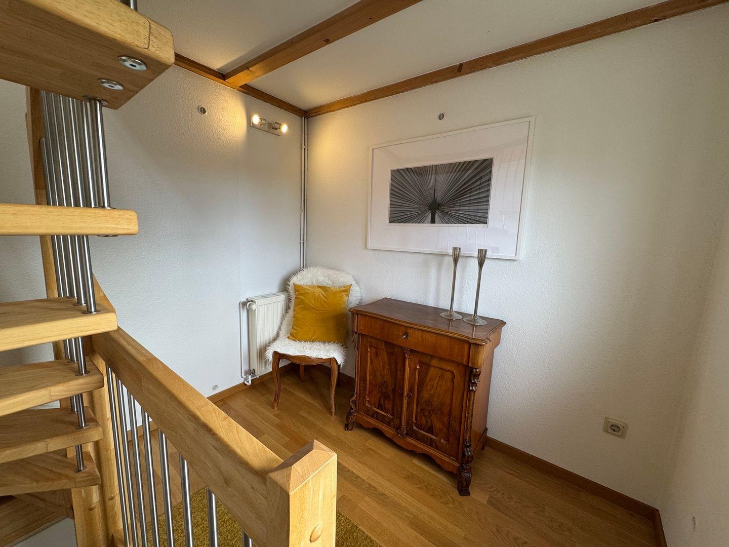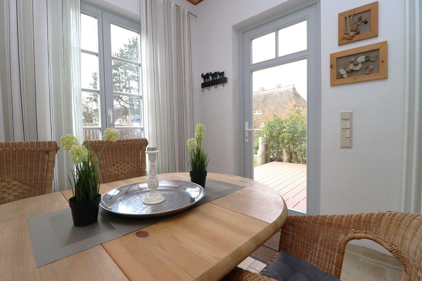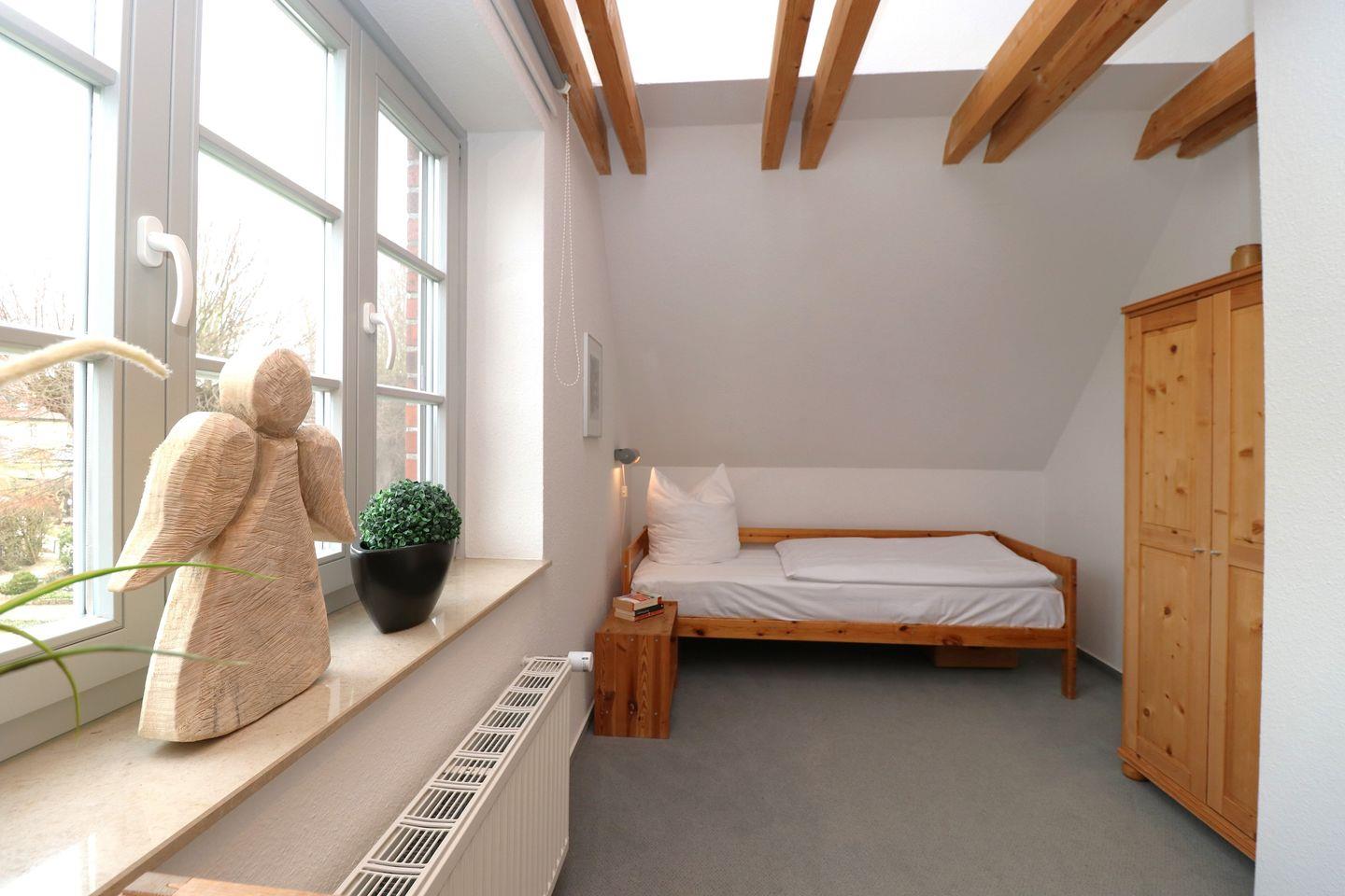 In der „Großen Wohnung“ erwartet Sie ein gemütliches Ambiente, das zum Entspannen einlädt. Die Unterkunft verteilt sich über zwei Etagen und bietet eine ansprechende Raumgestaltung. Im Erdgeschoss finden Sie die offene Küche, die mit modernen Annehmlichkeiten wie einem Herd, Backofen, Kühlschrank, Geschirrspüler und allerhand Küchenutensilien ausgestattet ist. Hier können Sie köstliche Mahlzeiten zubereiten und in geselliger Runde im Essbereich genießen. Im angrenzenden Wohnzimmer mit komfortabler Sofaecke können Sie nach einem erlebnisreichen Tag am Strand entspannen und den Abend bei einem Film auf dem digitalen Sat-TV ausklingen lassen.