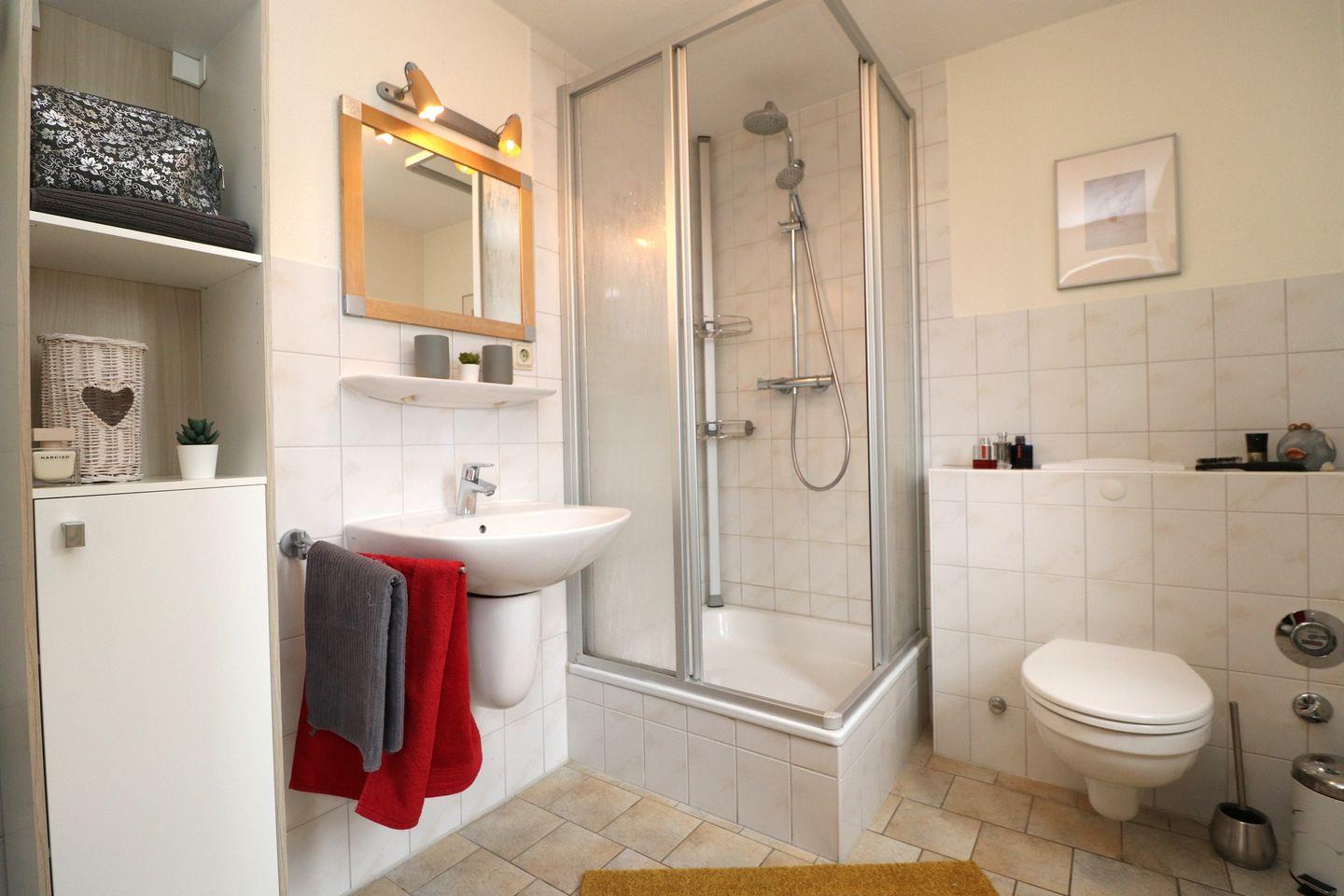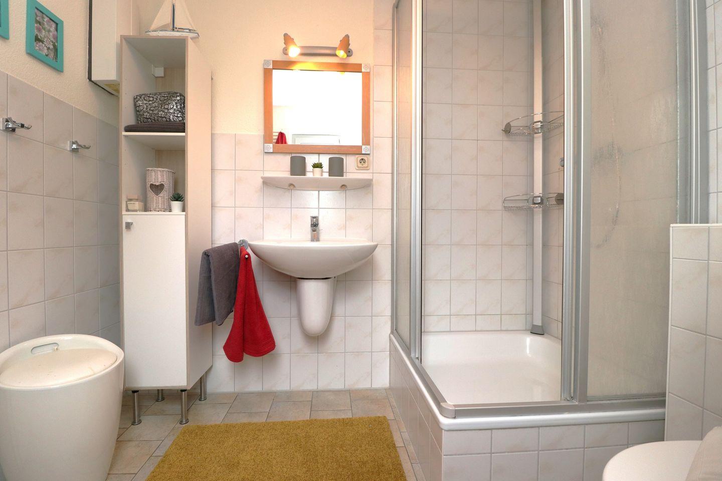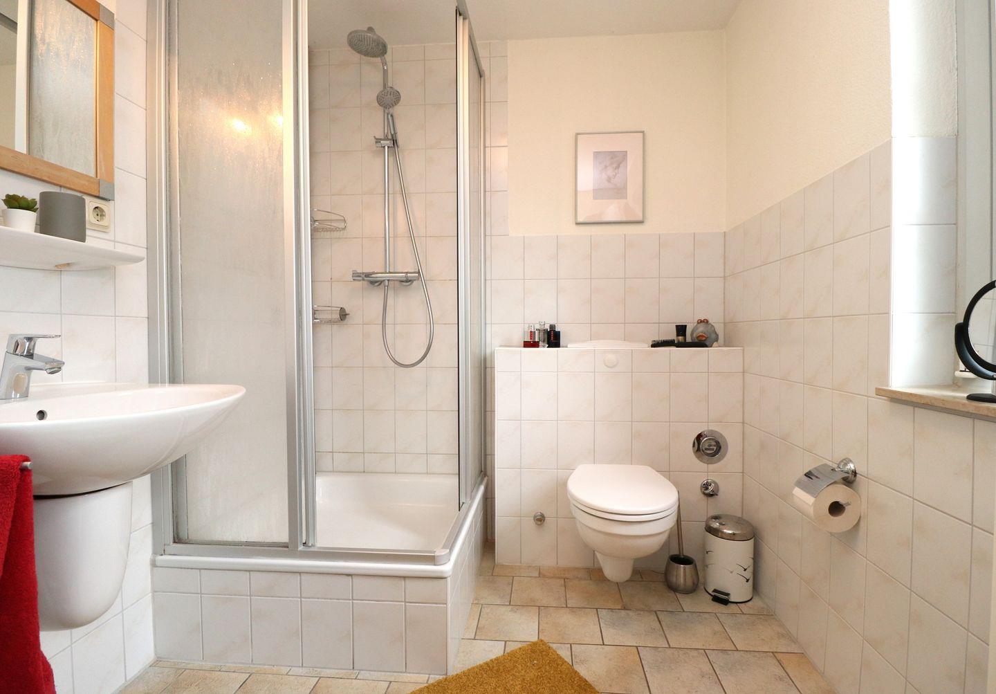Die Wohnung verfügt über zwei stilvolle Schlafzimmer mit Teppichboden, in denen es sich wunderbar schlafen lässt. Des Weiteren gibt es ein Badezimmer mit Dusche und WC, das sowohl Komfort als auch Funktionalität bietet. Ein Gäste-WC steht zusätzlich zur Verfügung, ideal für Familien oder Gruppen.