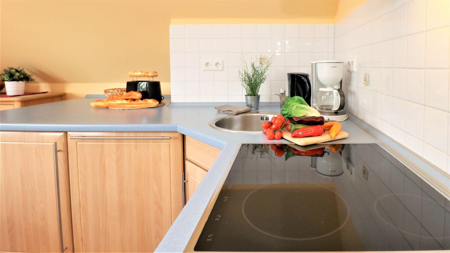 Die ausgestattete Kochnische lässt keine Wünsche offen: Von der Kaffeemaschine über Toaster, Wasserkocher bis hin zur Spülmaschine und einem Herd mit Backofen – hier können Sie Ihre Lieblingsgerichte zubereiten. Auch Geschirr und Besteck sind vorhanden. Für schöne Sommerabende steht Ihnen ein Balkon mit Gartenmöbeln zur Verfügung, wo Sie den Blick in die Umgebung genießen können.