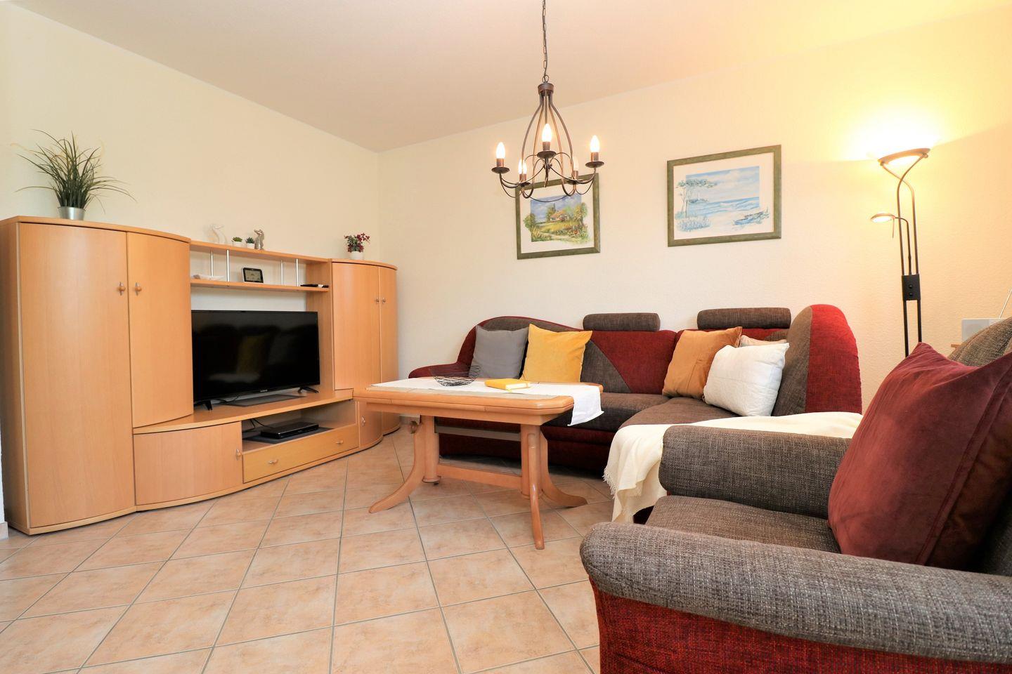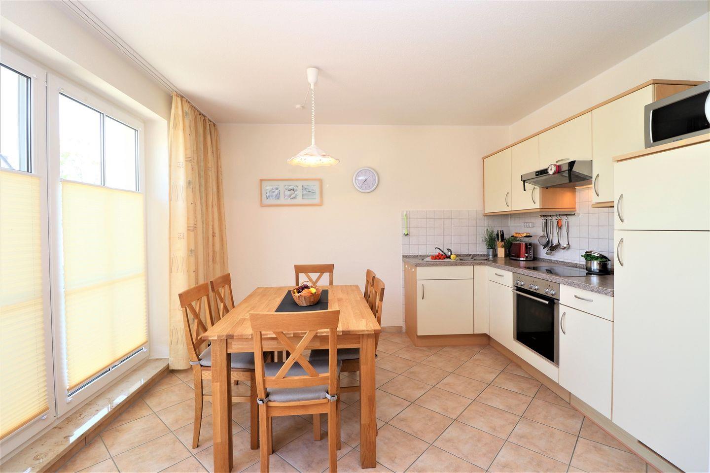 Dieses geräumige Appartement im Obergeschoss bietet auf ca. 71 m² Platz für maximal 4 Personen und ist ideal für Familien oder Paare, die auf der Suche nach einer komfortablen und ruhigen Unterkunft sind. Das Wohnzimmer ist mit einer integrierten Küchenzeile ausgestattet, die alles bietet, was Sie für eine Selbstverpflegung benötigen. Der gemütliche Wohnbereich lädt zum Entspannen ein, während Sie eine Mahlzeit zubereiten oder einfach nur die Zeit genießen. Der große Ostbalkon bietet viel Platz und einen schönen Blick – perfekt, um die Morgensonne oder ein entspanntes Frühstück im Freien zu genießen. Das Schlafzimmer ist mit einem gemütlichen Doppelbett ausgestattet, ideal für erholsame Nächte. Das zweite Schlafzimmer bietet ein Tandembett, das sowohl für Erwachsene als auch für Kinder geeignet ist und flexibel genutzt werden kann. Das Badezimmer ist mit einer Dusche und einem WC ausgestattet und bietet alles, was Sie für Ihren täglichen Komfort benötigen. Für Ihre Bequemlichkeit steht Ihnen WLAN zur Verfügung, sodass Sie jederzeit Zugriff auf das Internet haben – ob für die Planung von Ausflügen oder um mit der Außenwelt in Kontakt zu bleiben. Der PKW-Stellplatz Nr. 20 befindet sich direkt auf dem Grundstück, sodass Sie Ihr Fahrzeug sicher abstellen können. In diesem Appartement sind Haustiere nicht gestattet, ebenso wie das Rauchen. Dieses Appartement bietet Ihnen den perfekten Raum für einen erholsamen Urlaub, mit einem großzügigen Platzangebot und einer ruhigen Atmosphäre – ideal für Ihren Aufenthalt.