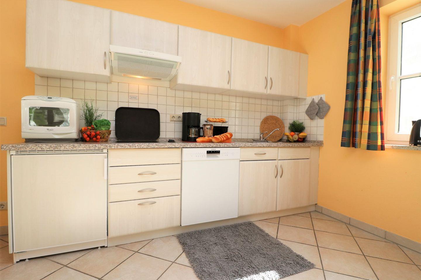 Ein geräumiges Erdgeschoss-Appartement für maximal 6 Personen mit einer sonnigen Südterrasse. Das Appartement bietet ein Wohnzimmer mit Schlafcouch (Länge 1,60 m) und integrierter Küchenzeile, ein Schlafzimmer mit Doppelbett und ein weiteres Schlafzimmer mit Tandembett. Das Badezimmer ist mit einer Dusche und WC ausgestattet. Haustier sind erlaubt, das Rauchen jedoch nicht. WLAN steht zur Verfügung und Sie können zu den jeweils aktuellen Öffnungszeiten kostenfrei das benachbarte Erholungszentrum mit Sauna und Schwimmbad nutzen, um ihren Aufenthalt zu bereichern. Diesem Appartement ist der Tiefgaragenstellplatz Nr. 15 zugeordnet.