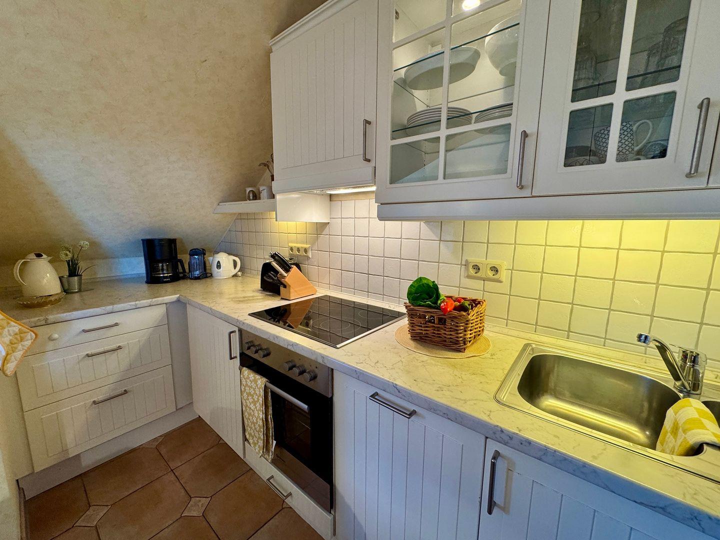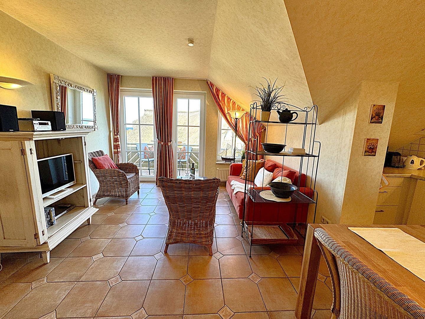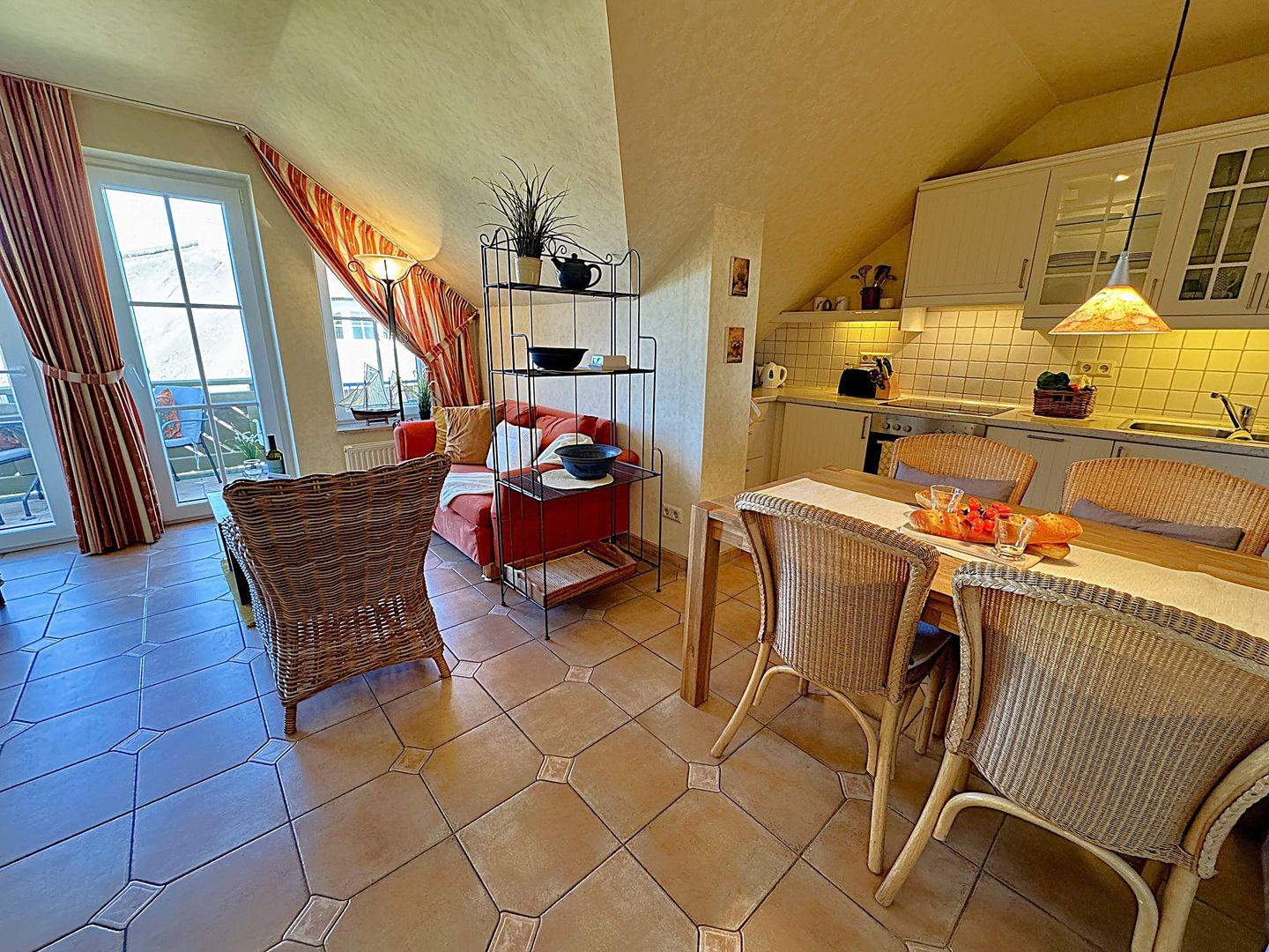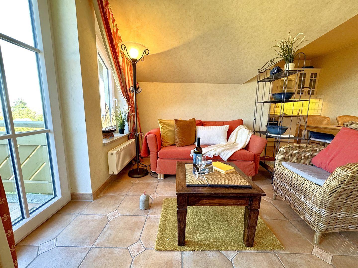 Ein gemütliches Dachgeschoss-Appartement für maximal 2 Personen mit einem Balkon Richtung Westen und Blick auf die Ostsee. Das Appartement verfügt über ein Wohnzimmer und integrierten Küchenzeile, sowie ein Schlafzimmer ist mit einem gemütlichem Doppelbett, für einen erholsamen Schlaf. Das Badezimmer verfügt über eine Badewanne und WC. Haustiere und Rauchen sind nicht gestattet, jedoch gibt es WLAN für einen bequemen Internetzugang während des Aufenthalts. Diesem Appartement wird der Tiefgaragenstellplatz Nr. 48 zugeordnet.